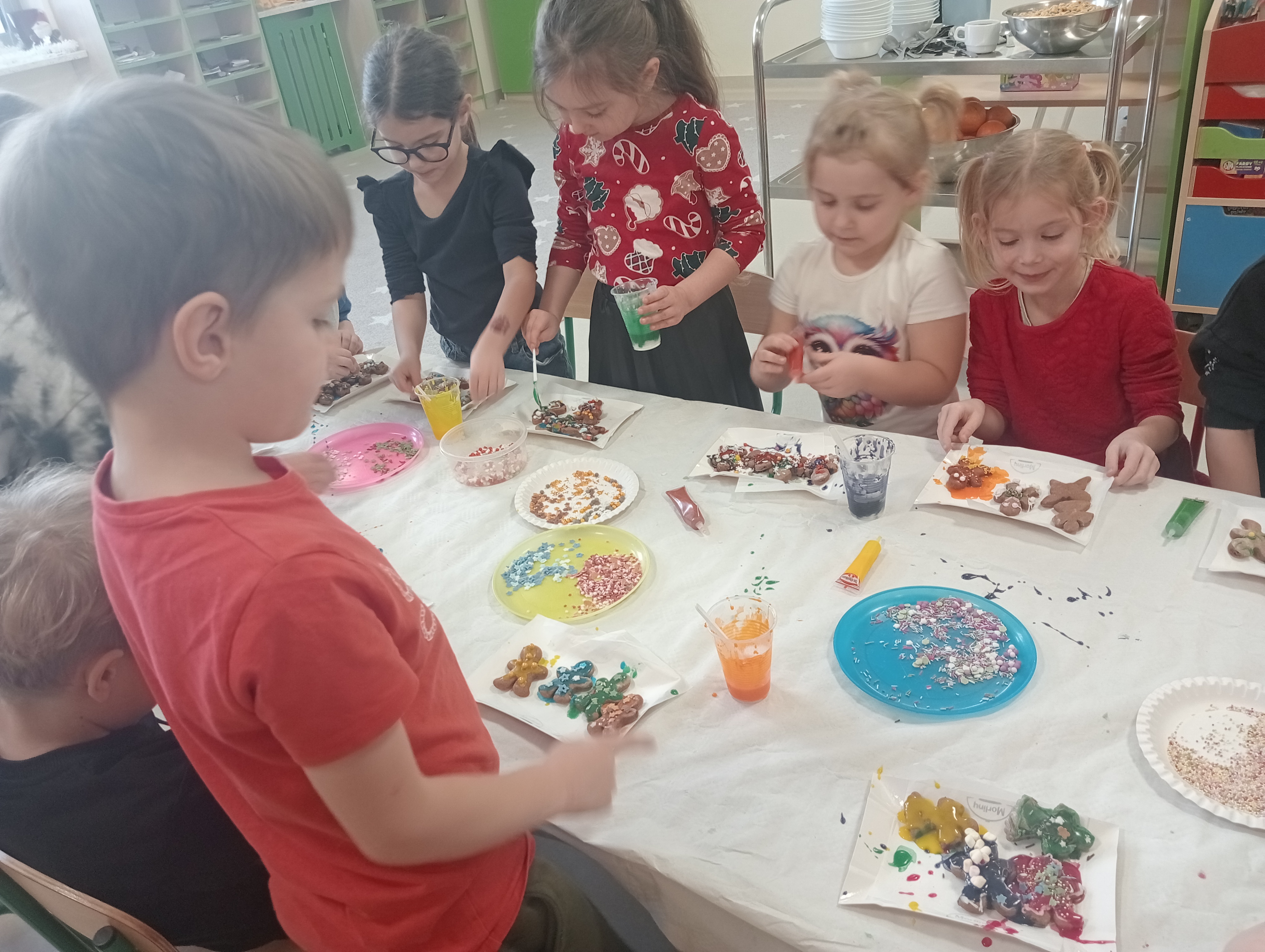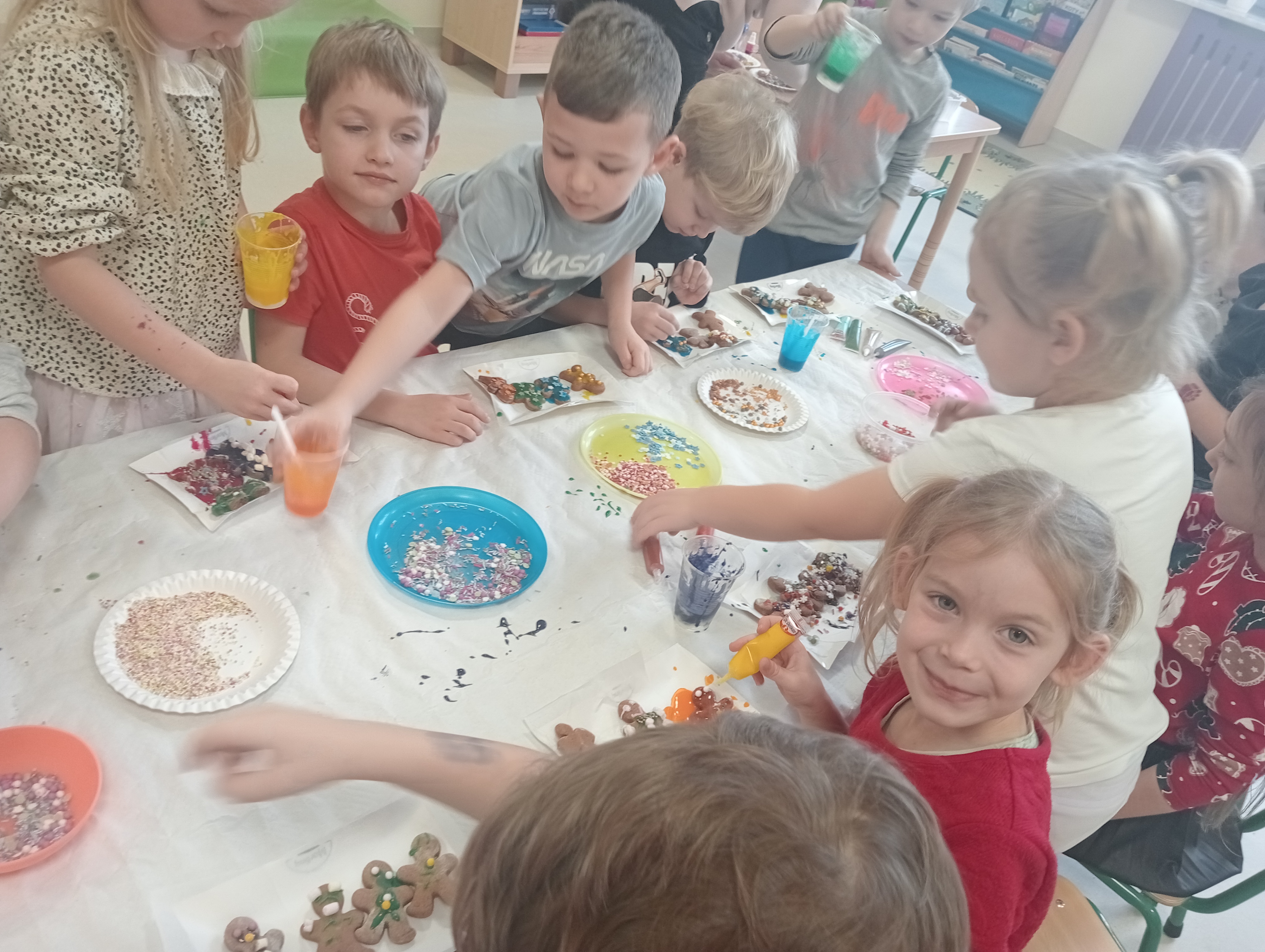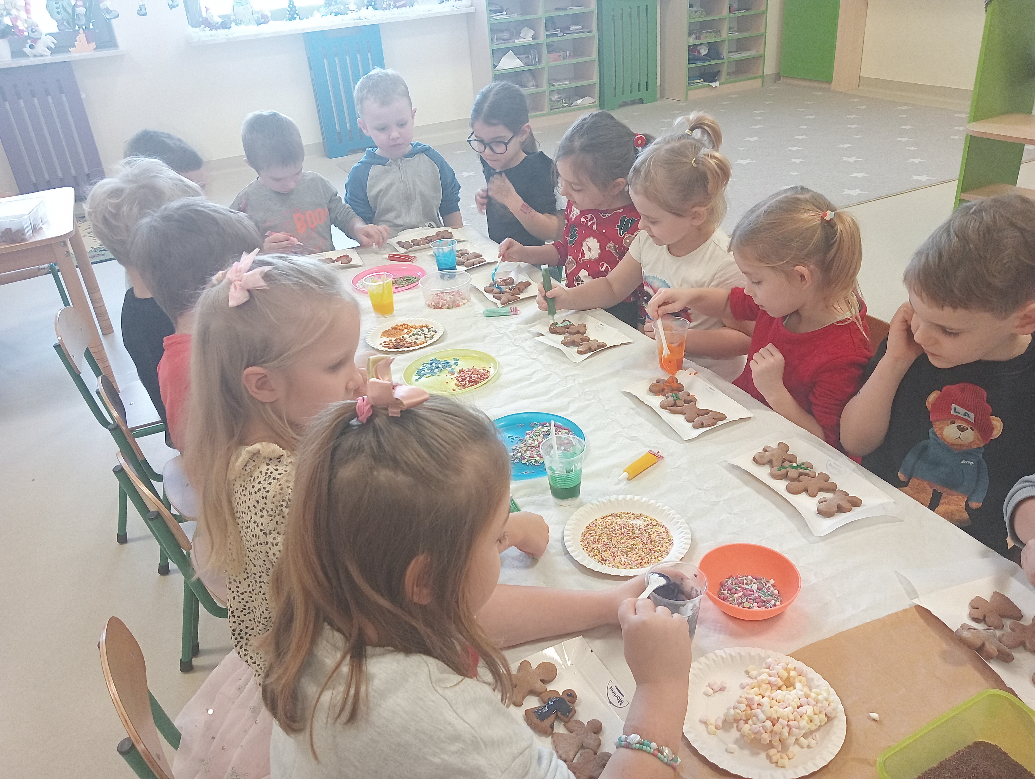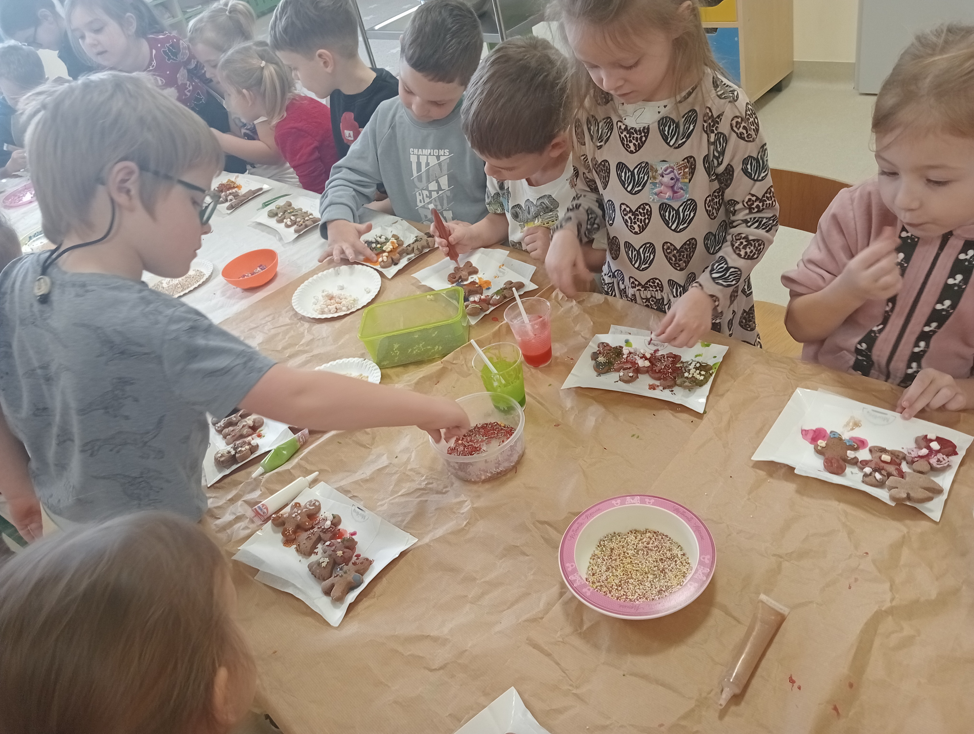 W czwartek 11 grudnia przedszkolaki z naszej grupy dekorowały pierniczki, które upiekła mama Oliwki i Marka. Tego dnia stoliki zapełniły się miseczkami z lukrem, kolorowymi posypkami, ozdobami cukierniczymi i, oczywiście, pierniczkami. Każdy wyglądał inaczej, był wyjątkowy i niepowtarzalny. Na koniec wszystkie pierniczki spakowaliśmy w celofan i dzieci zabrały dla swoich najbliższych. Był to bardzo słodki dzień.