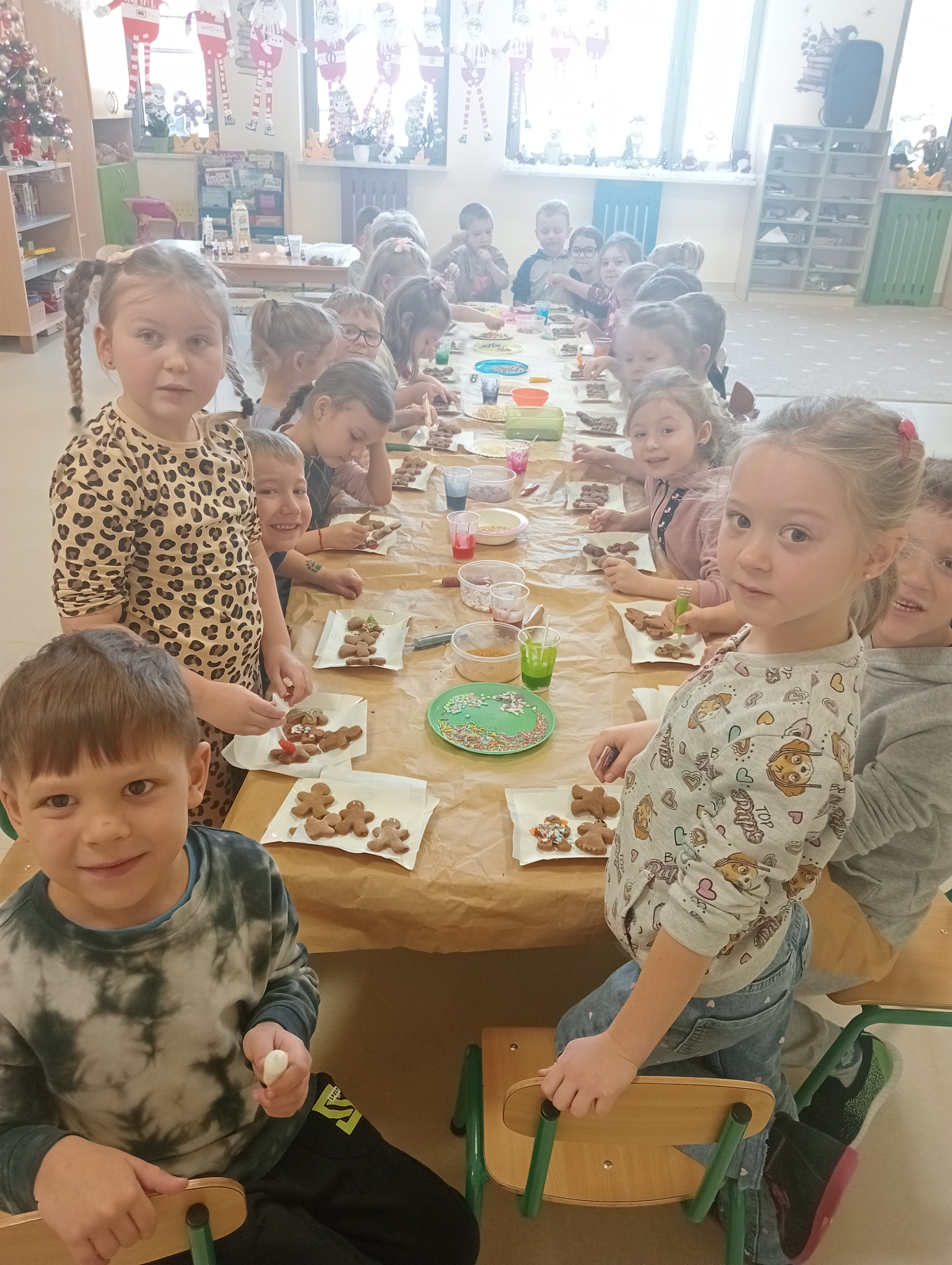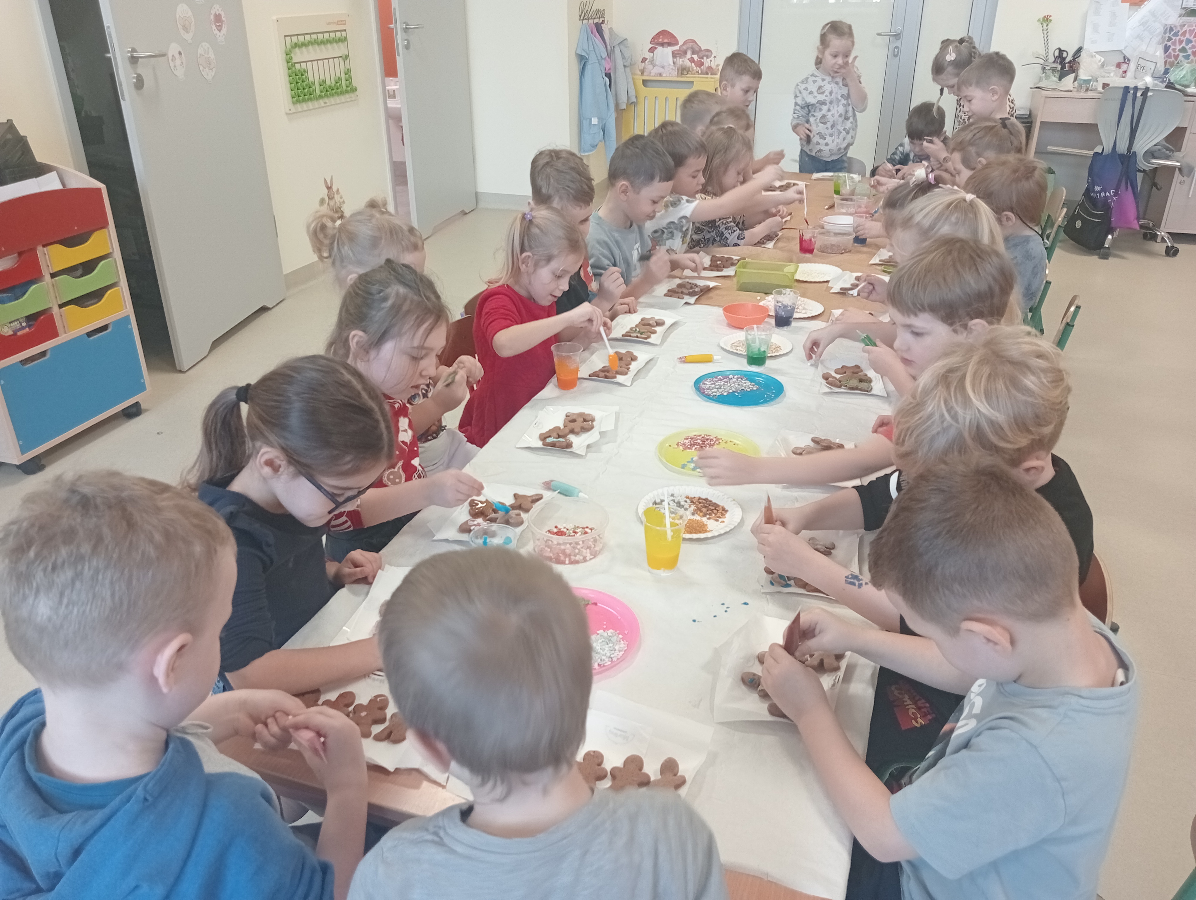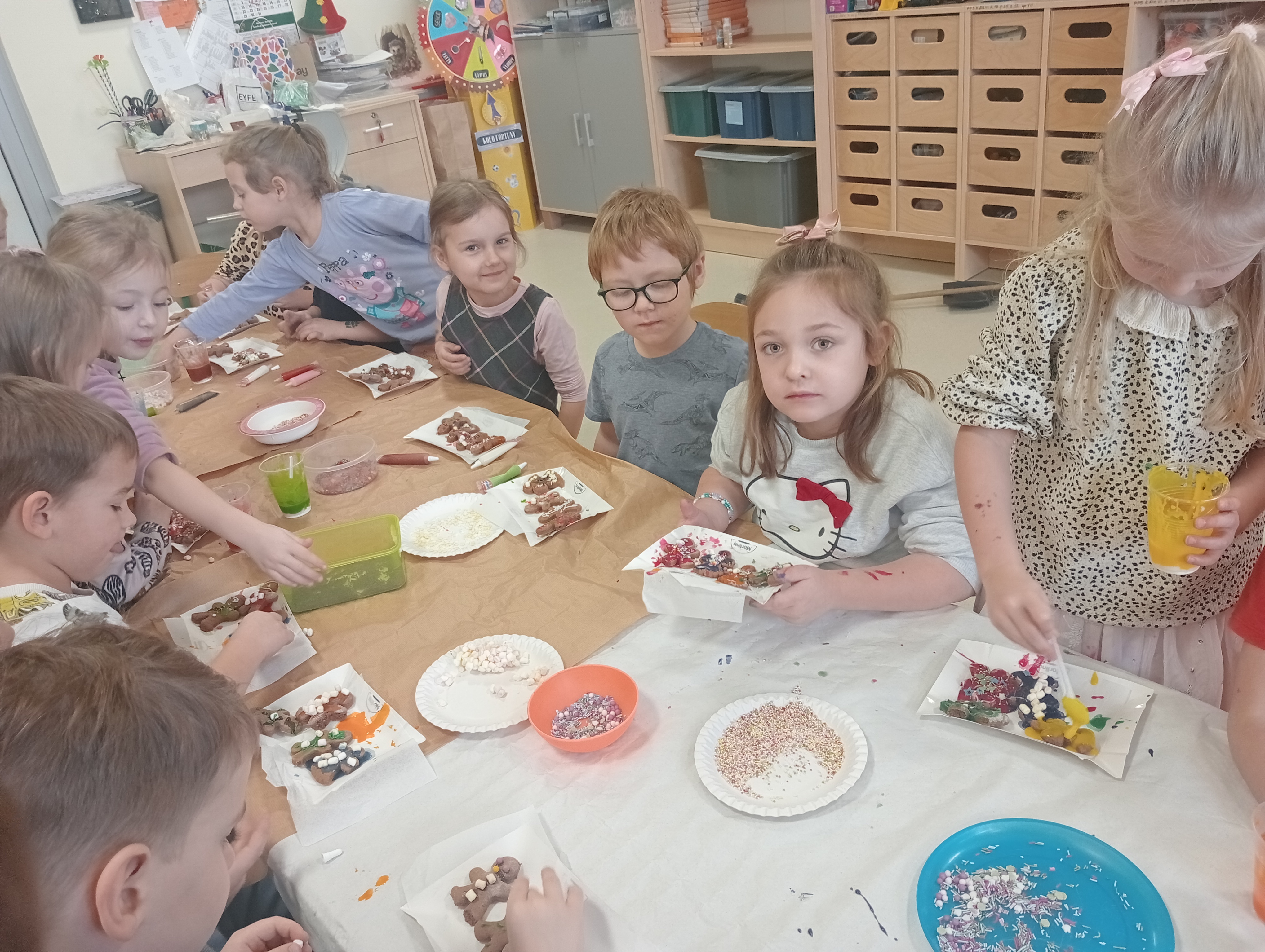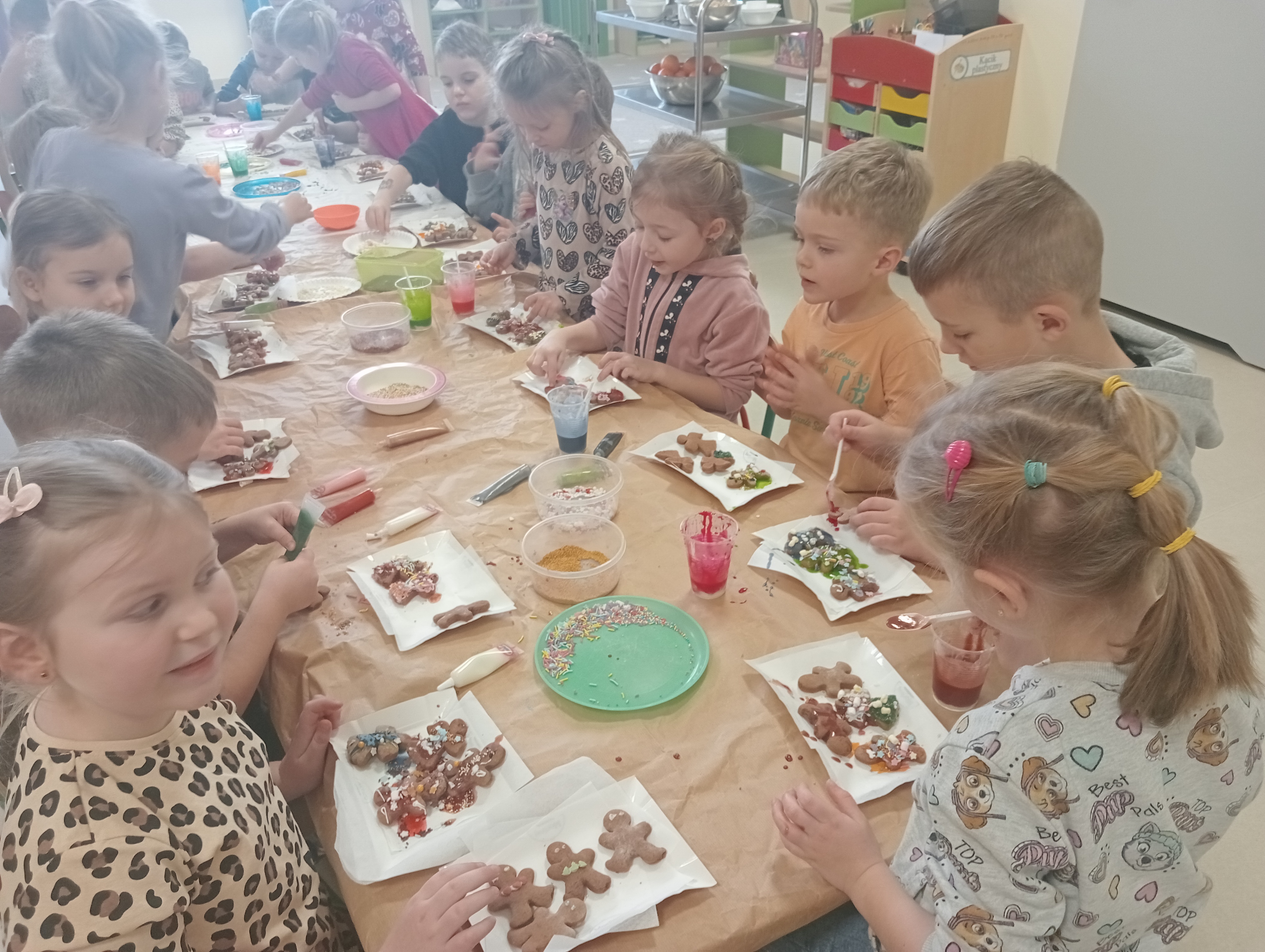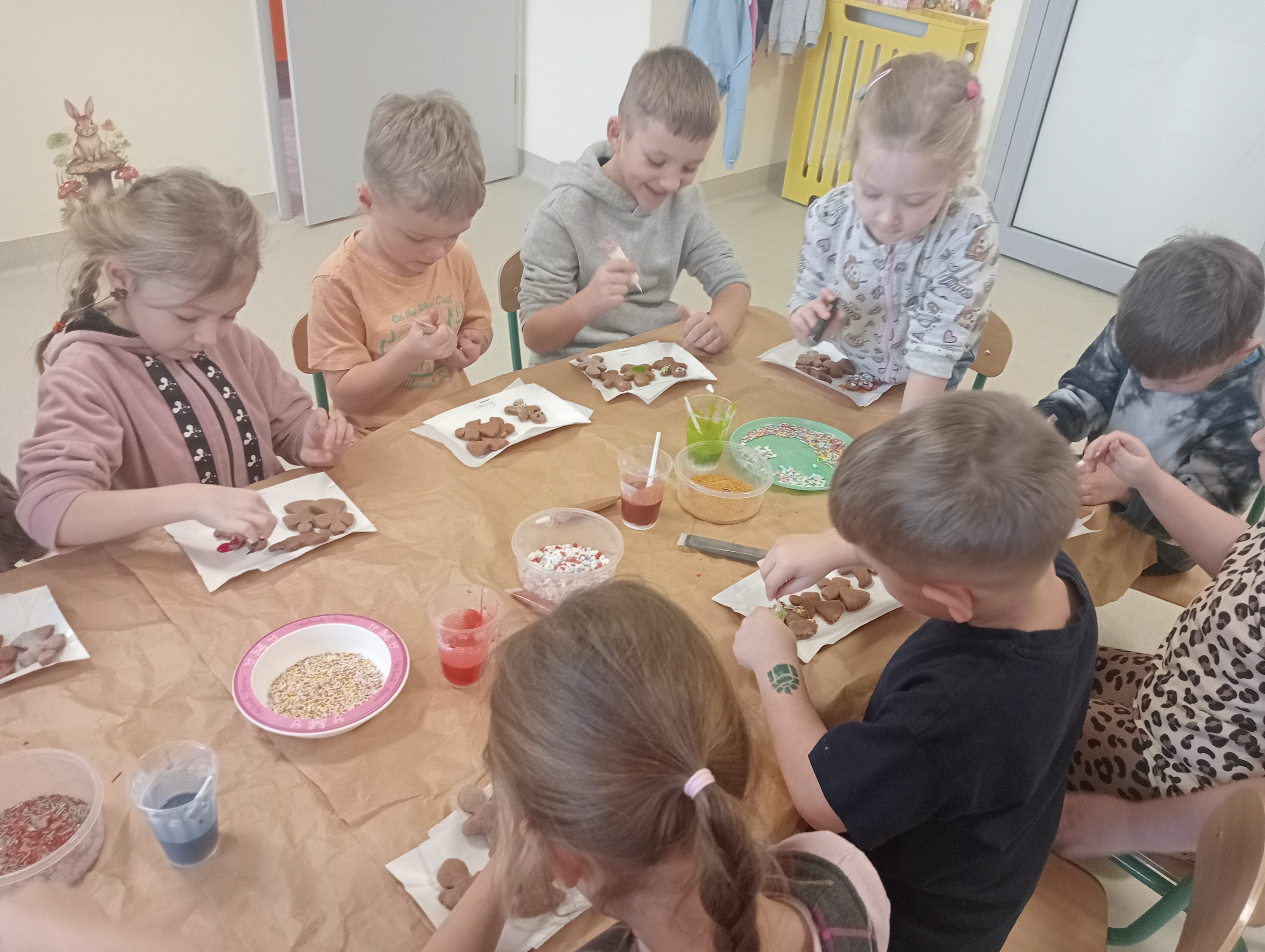 W czwartek 11 grudnia przedszkolaki z naszej grupy dekorowały pierniczki, które upiekła mama Oliwki i Marka. Tego dnia stoliki zapełniły się miseczkami z lukrem, kolorowymi posypkami, ozdobami cukierniczymi i, oczywiście, pierniczkami. Każdy wyglądał inaczej, był wyjątkowy i niepowtarzalny. Na koniec wszystkie pierniczki spakowaliśmy w celofan i dzieci zabrały dla swoich najbliższych. Był to bardzo słodki dzień.