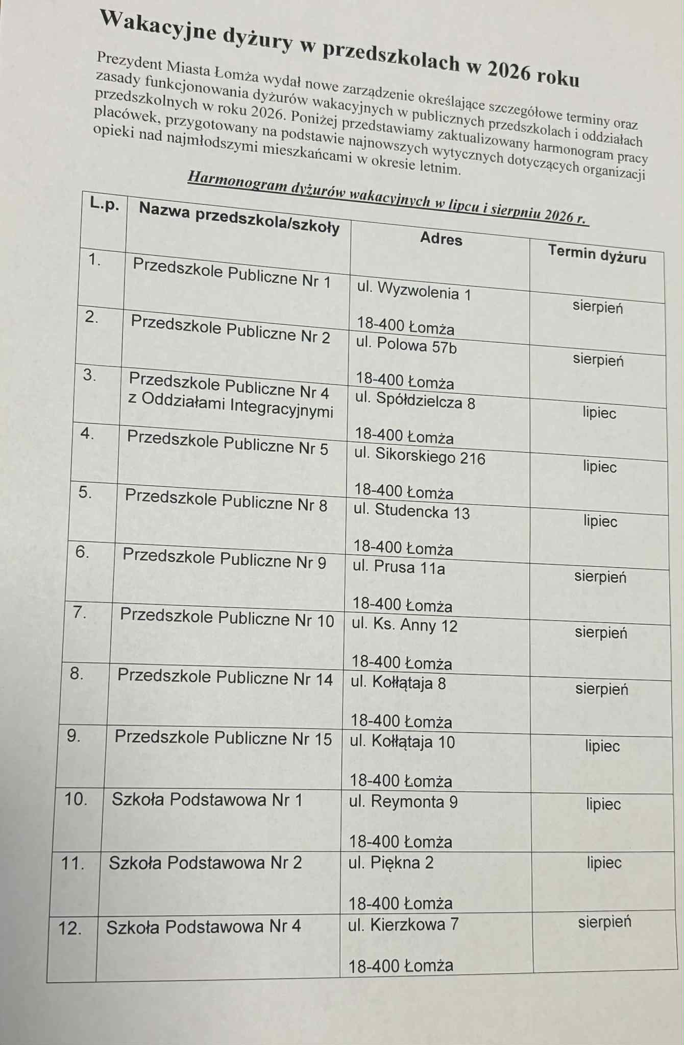 Zgodnie z Zarządzeniem nr 385/22 Prezydenta Miasta Łomży z dnia 16 grudnia 2022r. w sprawie ustalenia terminów i zasad organizacji dyżuru wakacyjnego dla publicznych przedszkoli i oddziałów przedszkolnych w szkołach podstawowych prowadzonych przez Miasto Łomża zapisy na dyżur wakacyjny odbywać się będą w dniach 15.04.2026r. – 30.04.2026r.