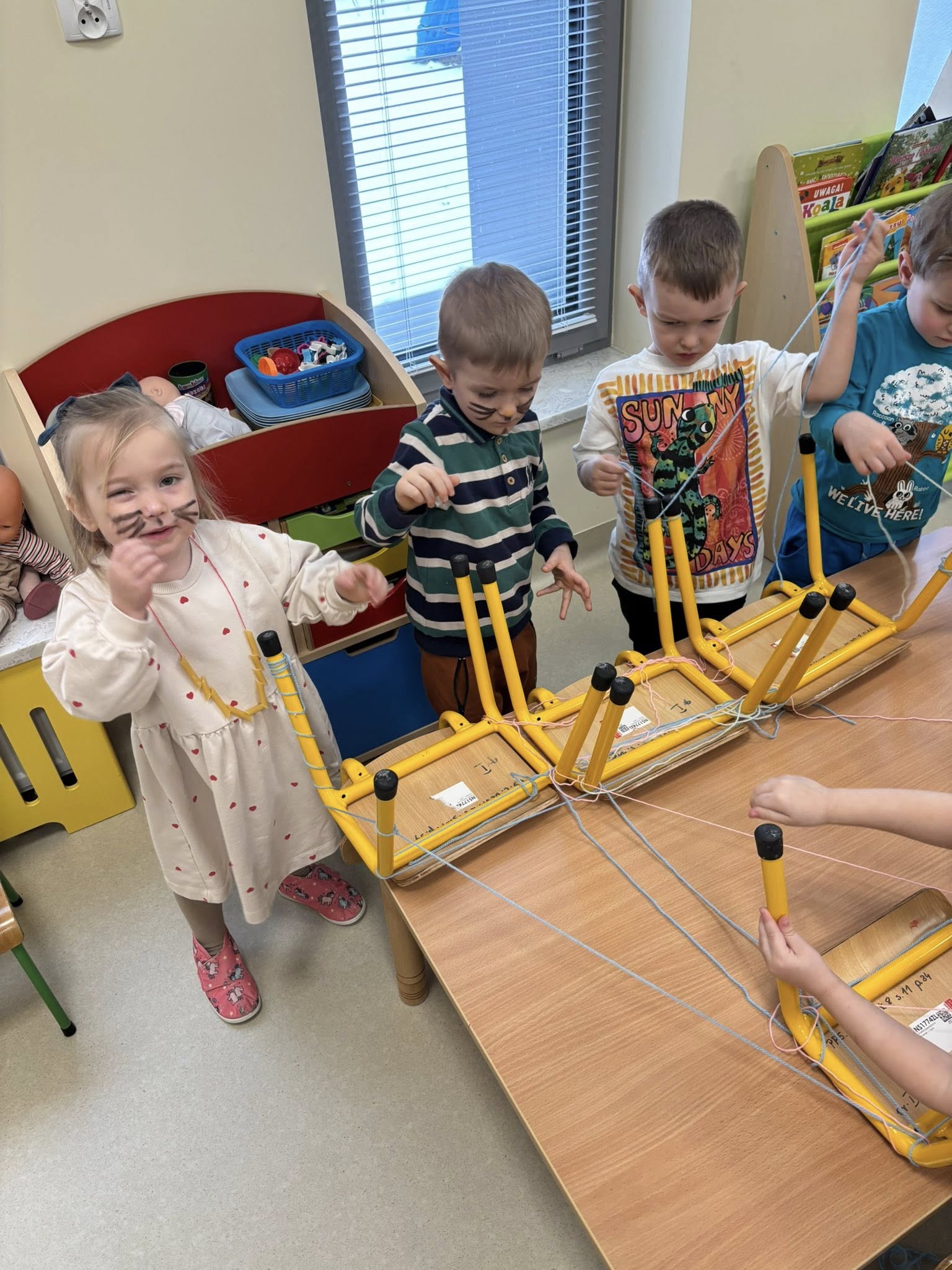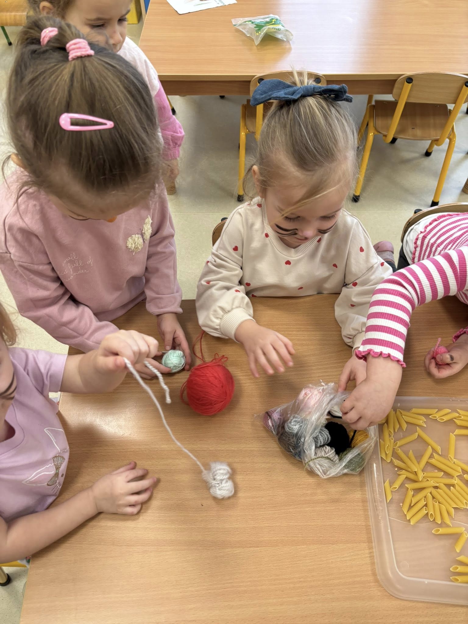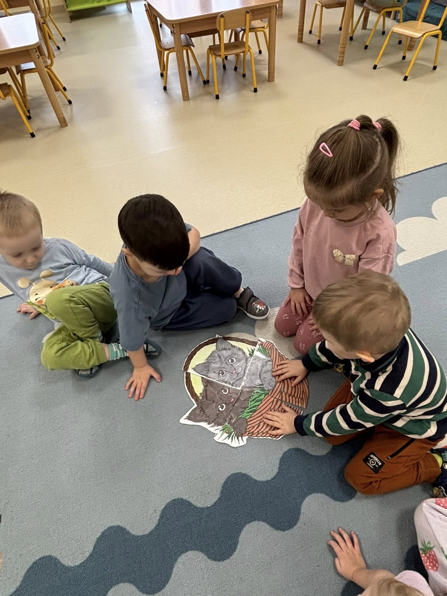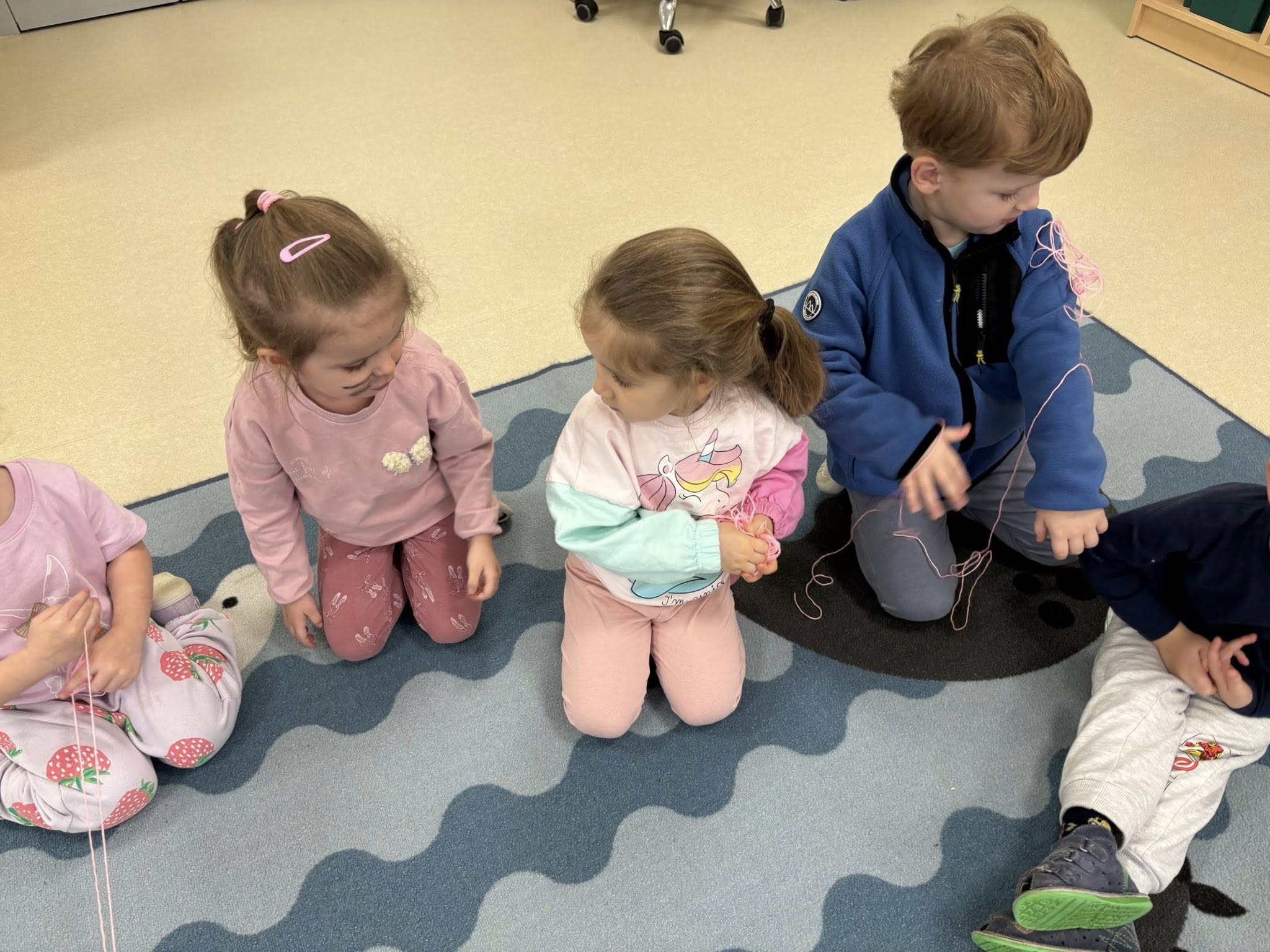 Były też „kocie” zabawy z włóczką ? – nawlekanie, przewlekanie, tworzenie motków i rozróżnianie kolorów, a także układanie puzzli. To był dzień pełen radości i nauki!