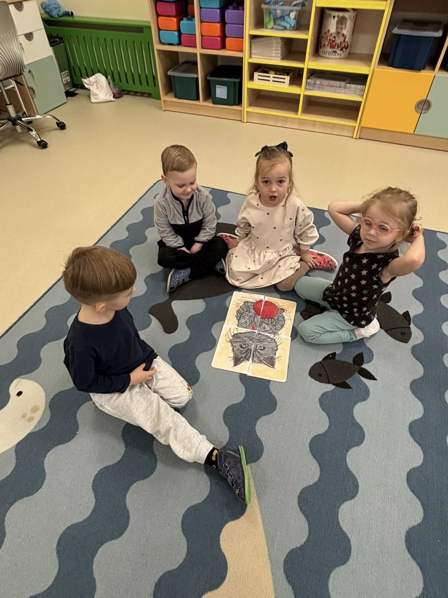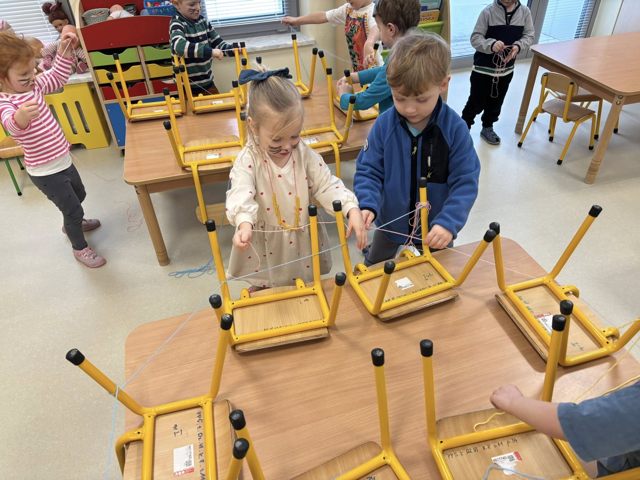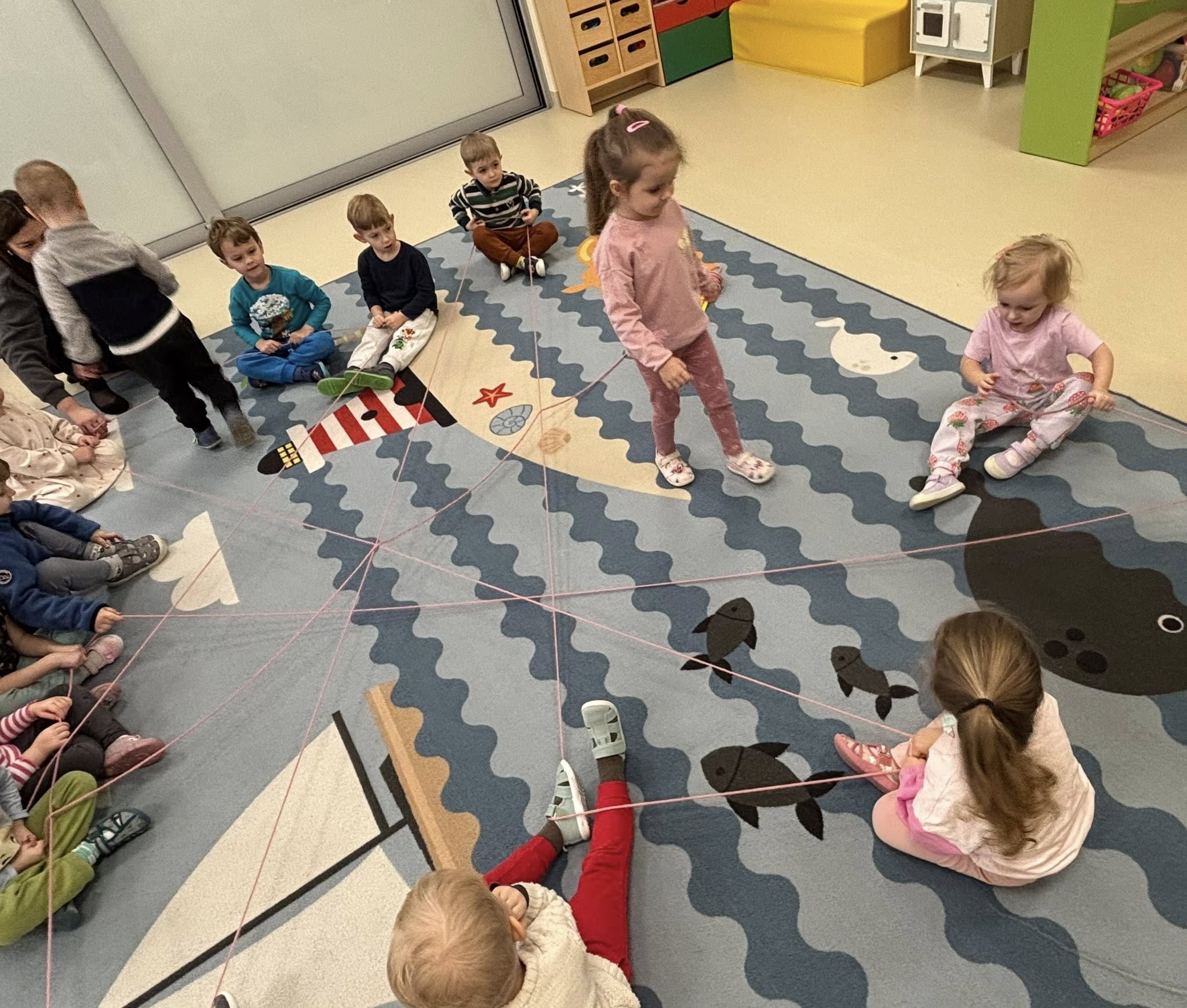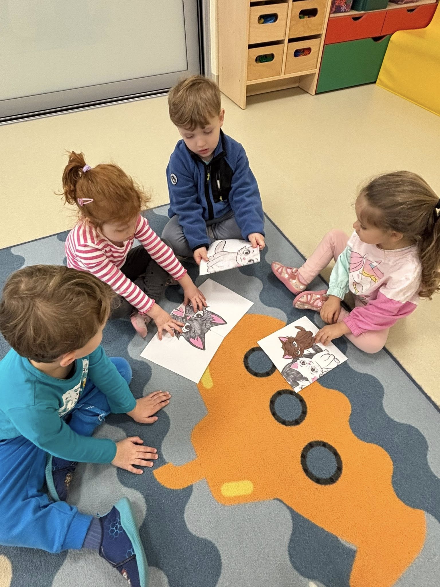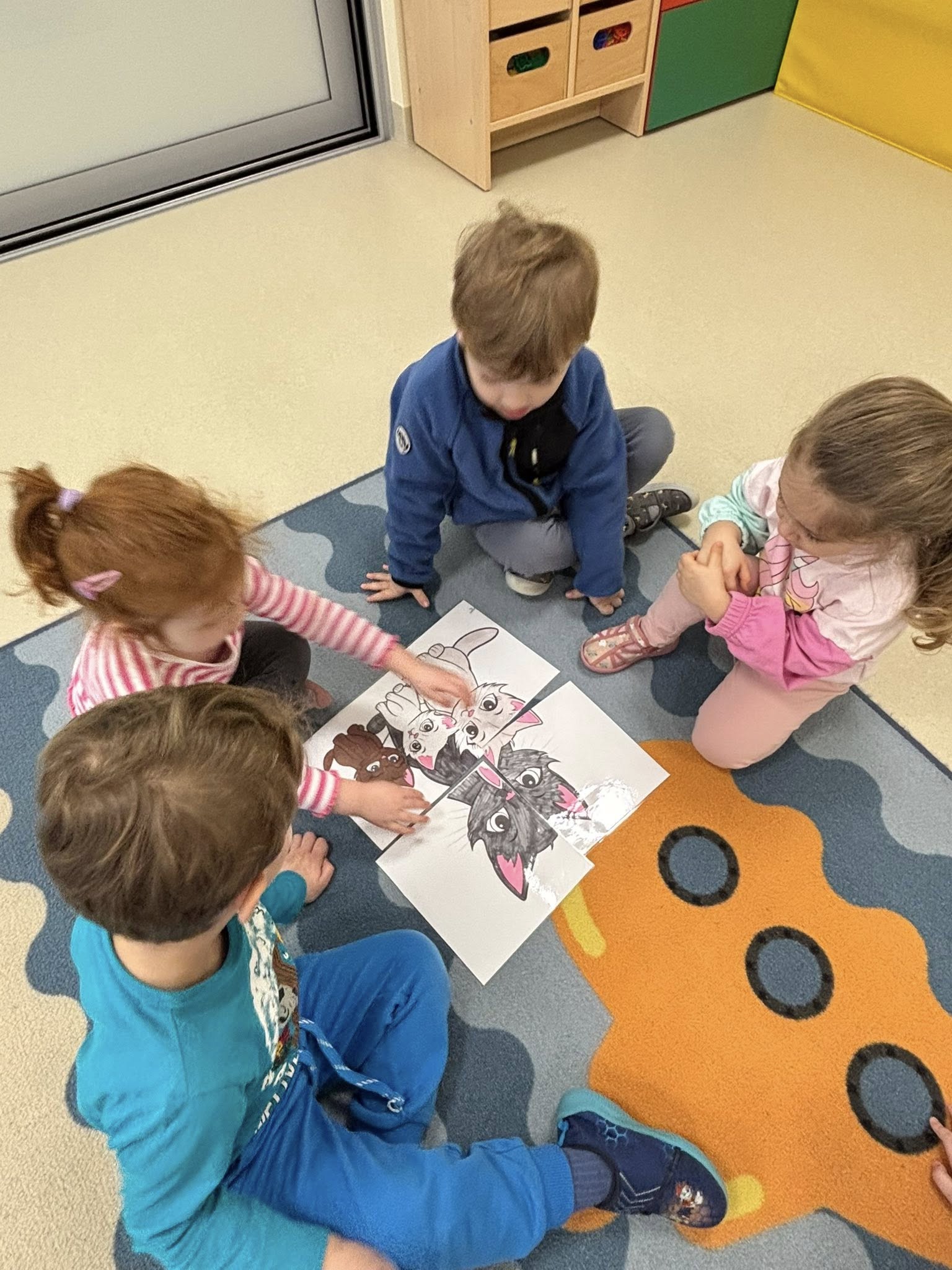 Były też „kocie” zabawy z włóczką ? – nawlekanie, przewlekanie, tworzenie motków i rozróżnianie kolorów, a także układanie puzzli. To był dzień pełen radości i nauki!