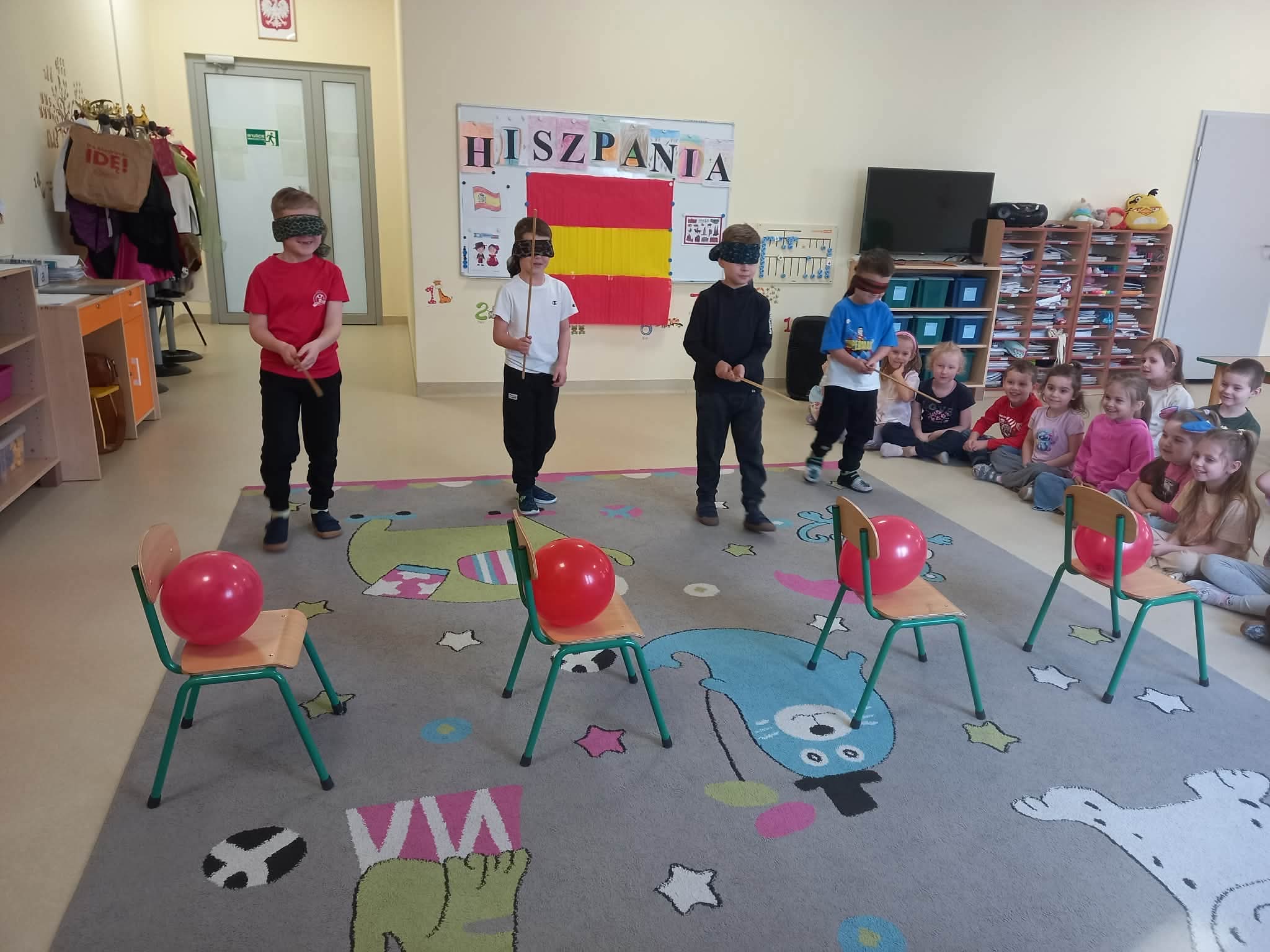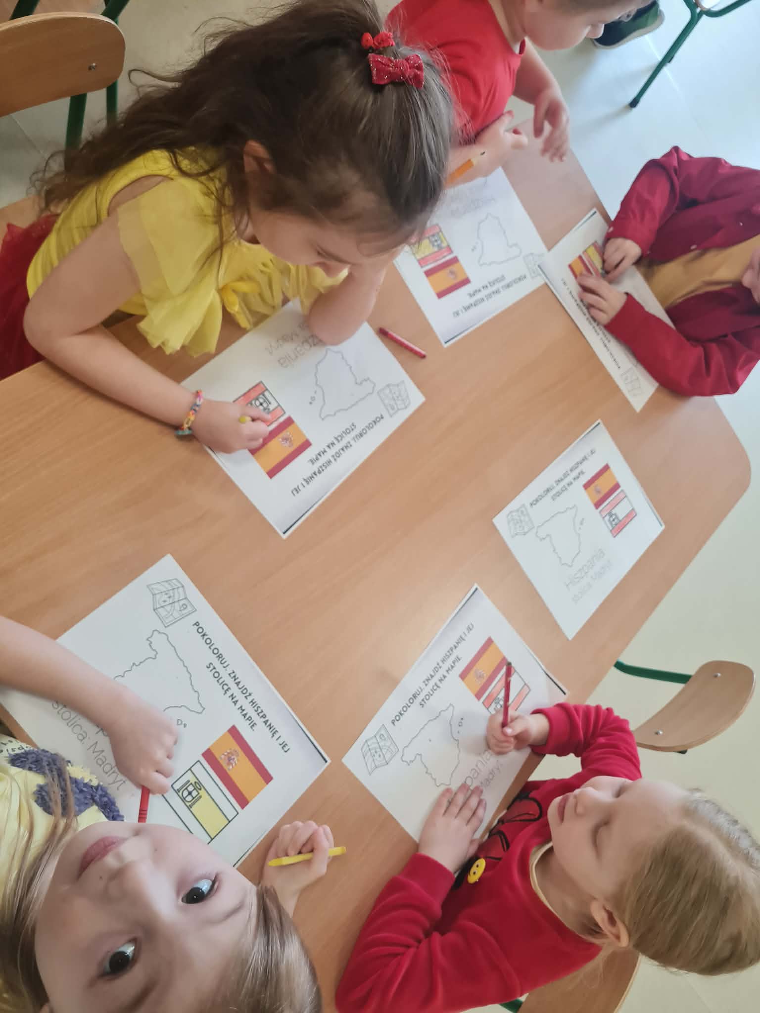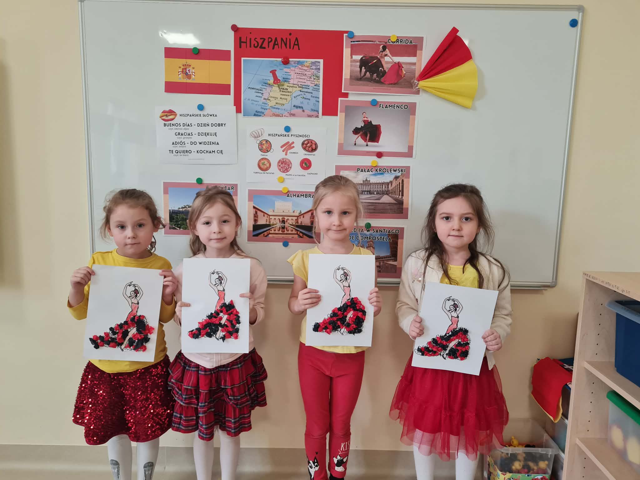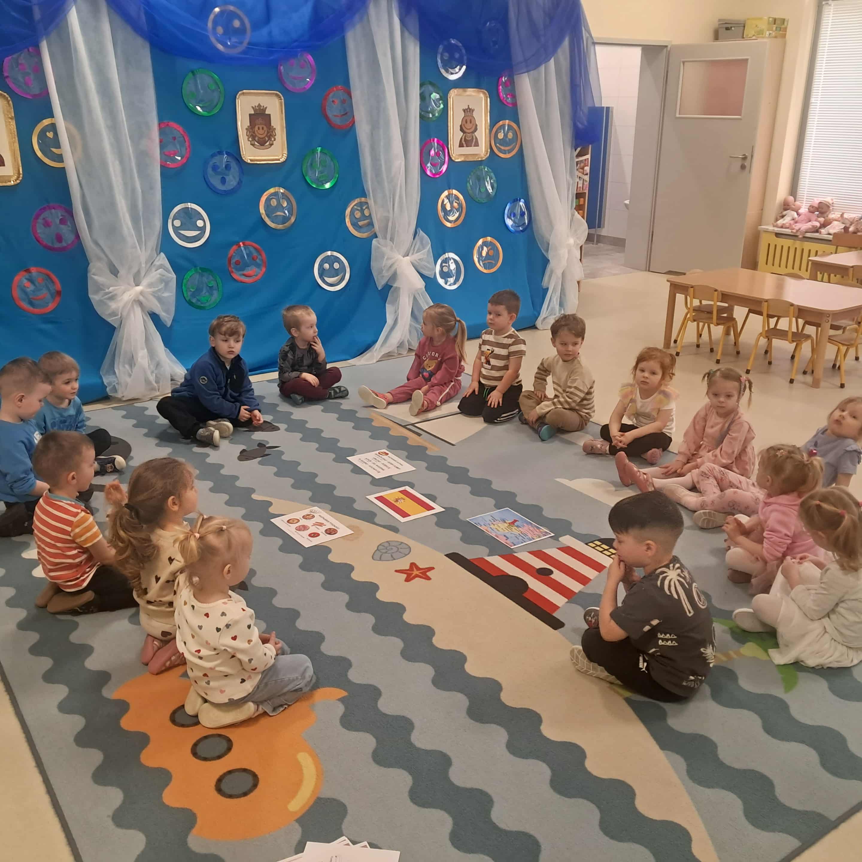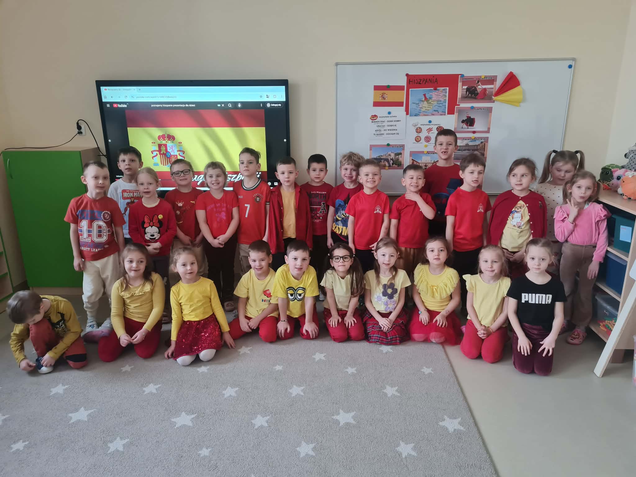 Tego dnia dzieci miały okazję uczestniczyć w wyjątkowych zajęciach pełnych kolorów, muzyki i radości. Przedszkolaki oglądały ciekawe prezentacje, dzięki którym poznały najważniejsze symbole, tradycje oraz ciekawostki związane z Hiszpanią. Nie zabrakło wspólnych zabaw ruchowych i aktywności inspirowanych hiszpańskim temperamentem. Odbyła się również wesoła „bitwa na pomidory” – nawiązująca do znanego święta La Tomatina.