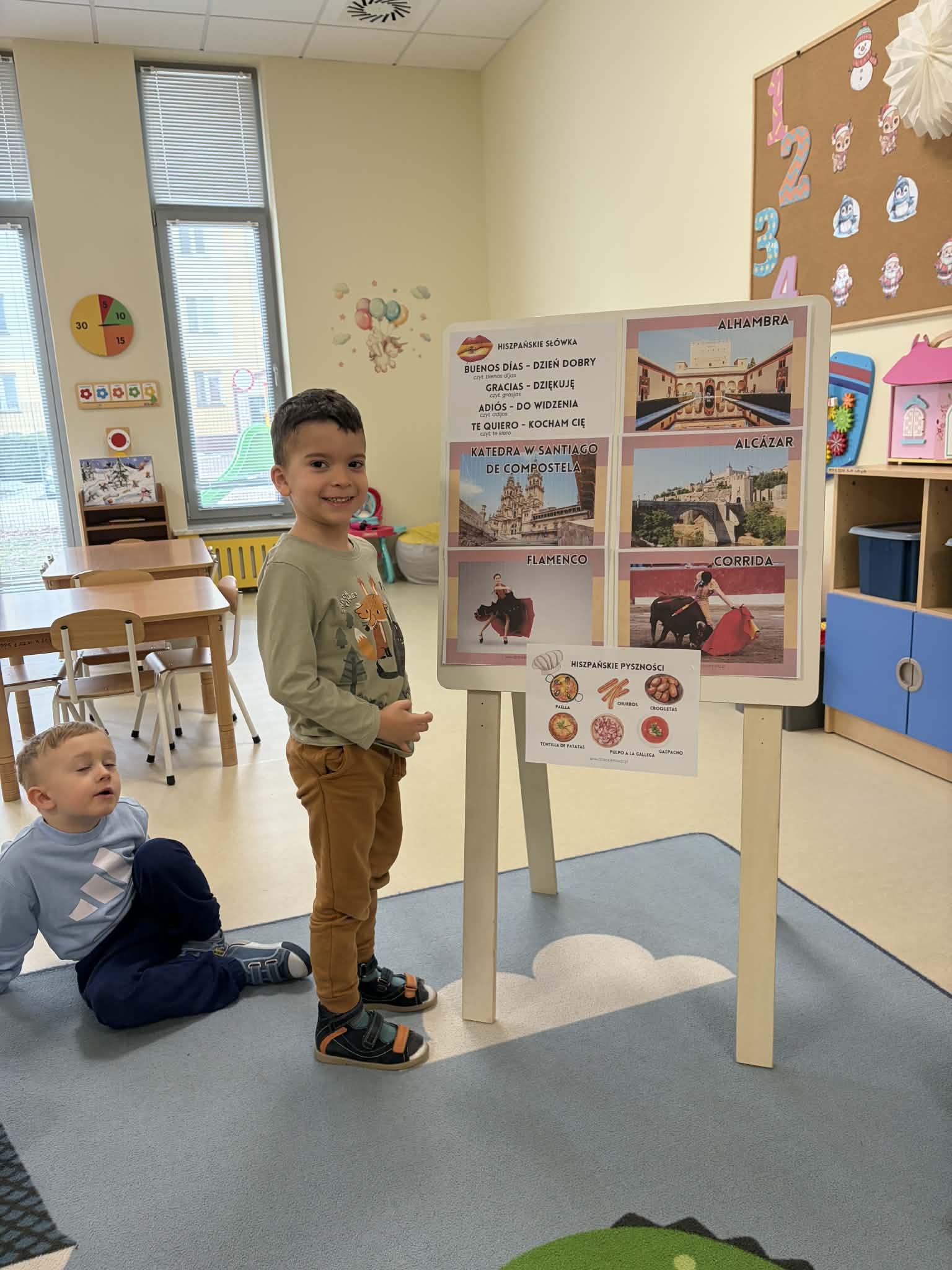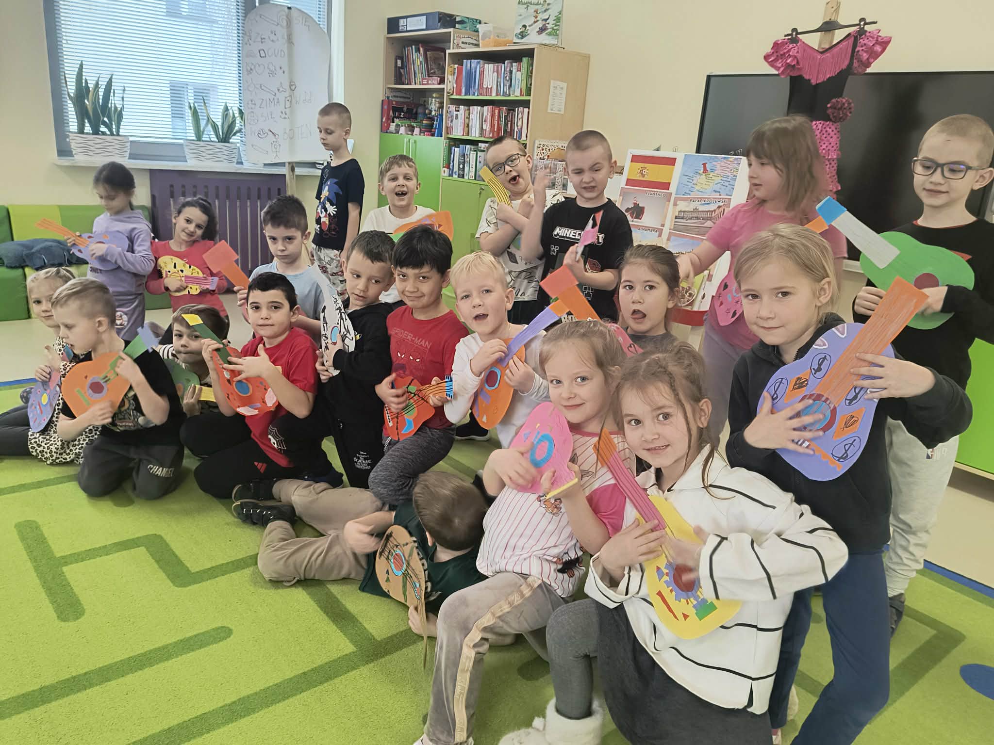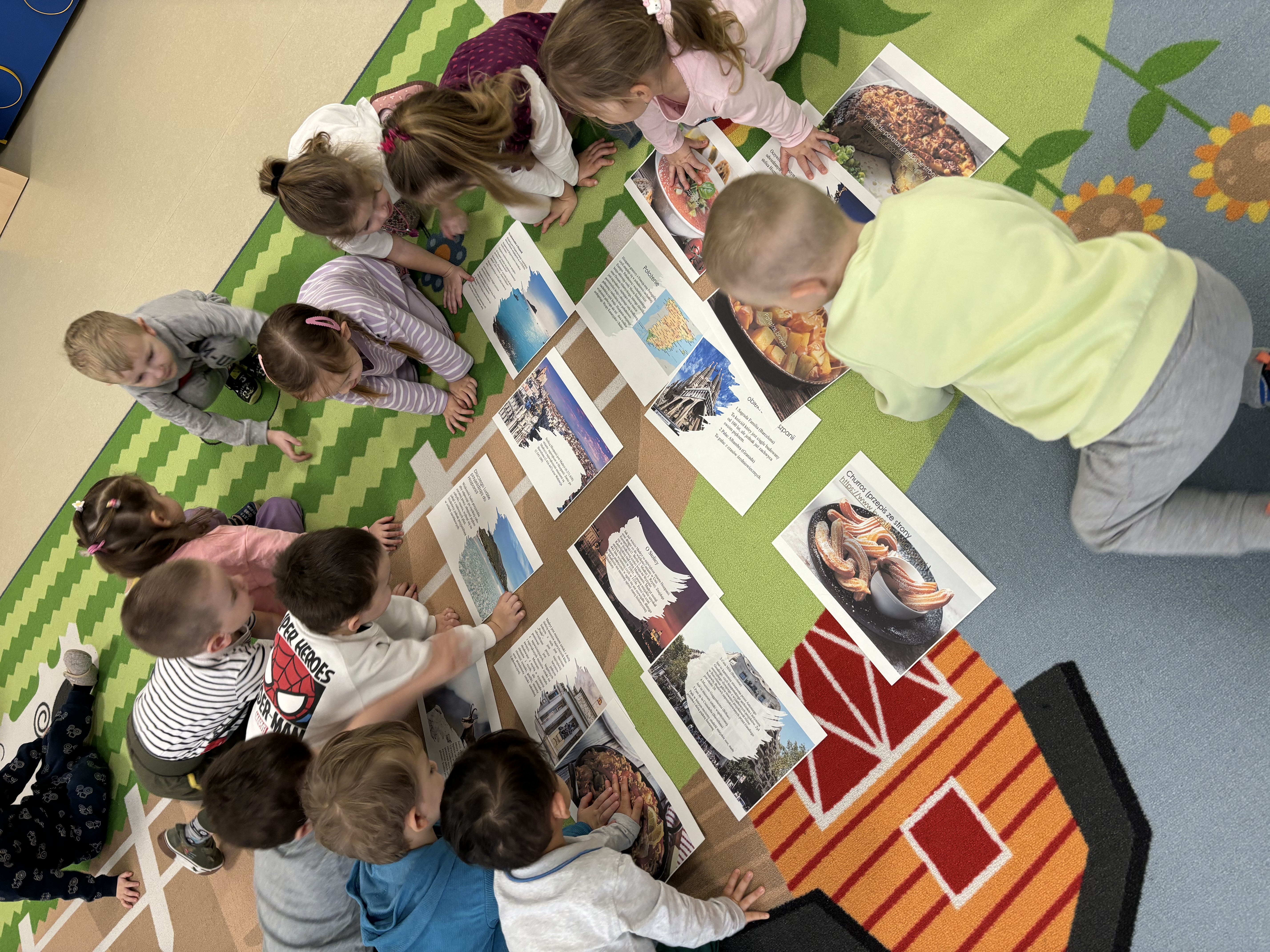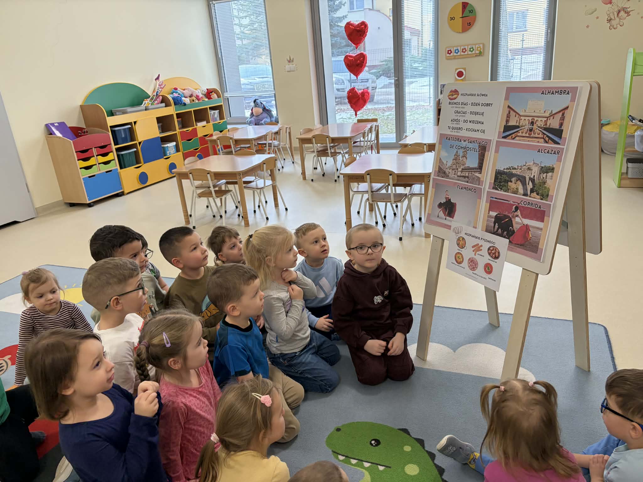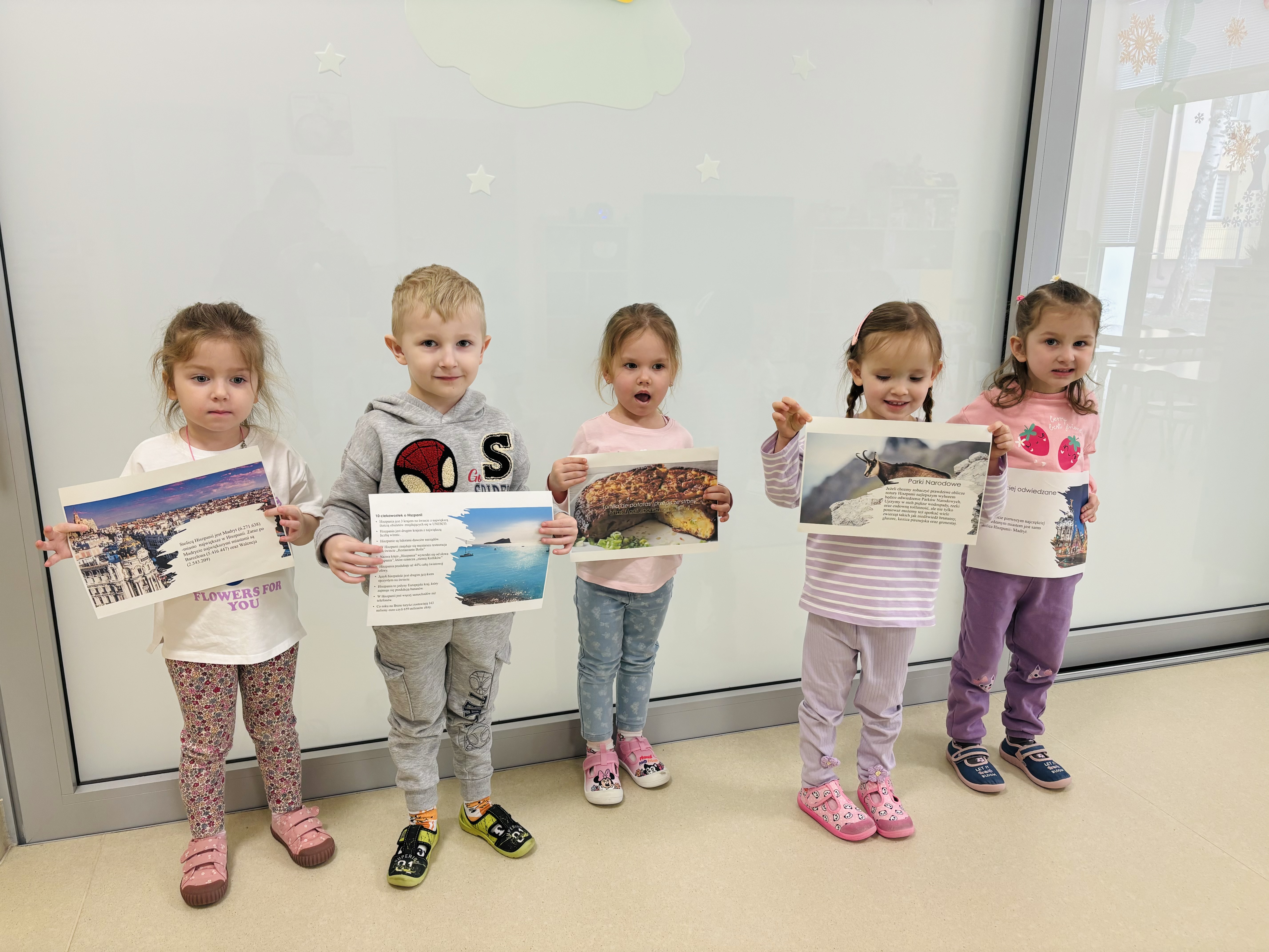 Tego dnia dzieci miały okazję uczestniczyć w wyjątkowych zajęciach pełnych kolorów, muzyki i radości. Przedszkolaki oglądały ciekawe prezentacje, dzięki którym poznały najważniejsze symbole, tradycje oraz ciekawostki związane z Hiszpanią. Nie zabrakło wspólnych zabaw ruchowych i aktywności inspirowanych hiszpańskim temperamentem. Odbyła się również wesoła „bitwa na pomidory” – nawiązująca do znanego święta La Tomatina.