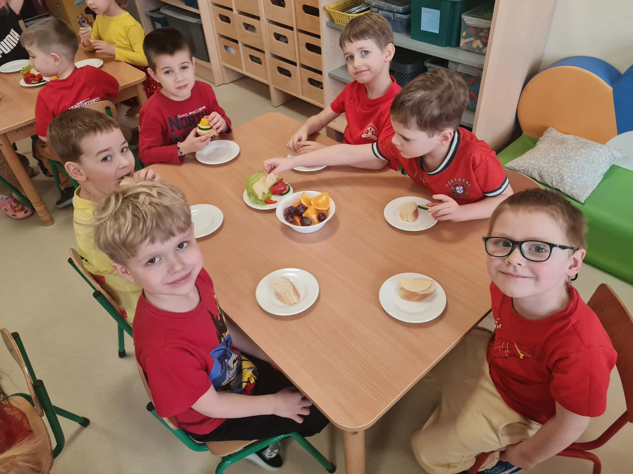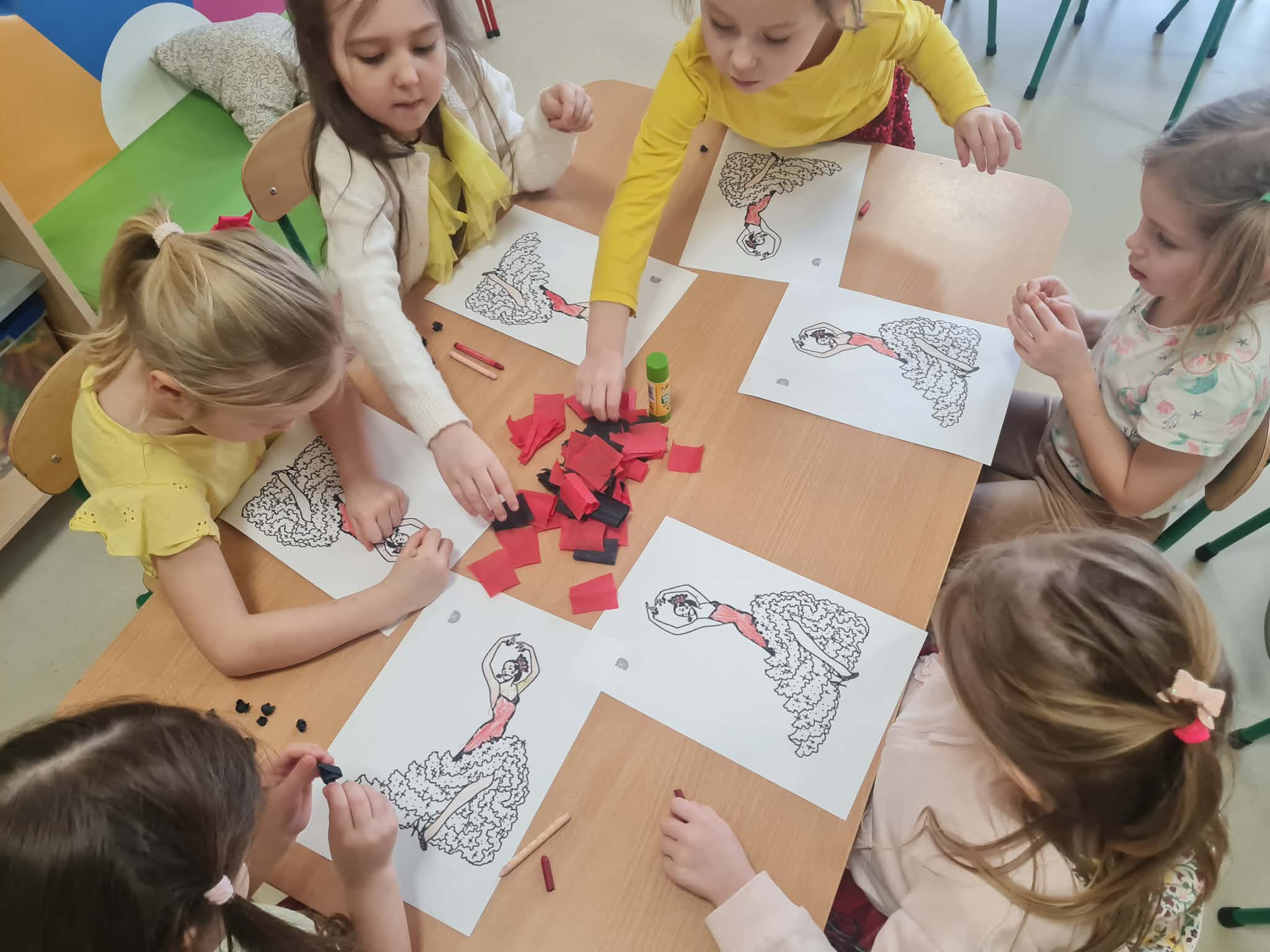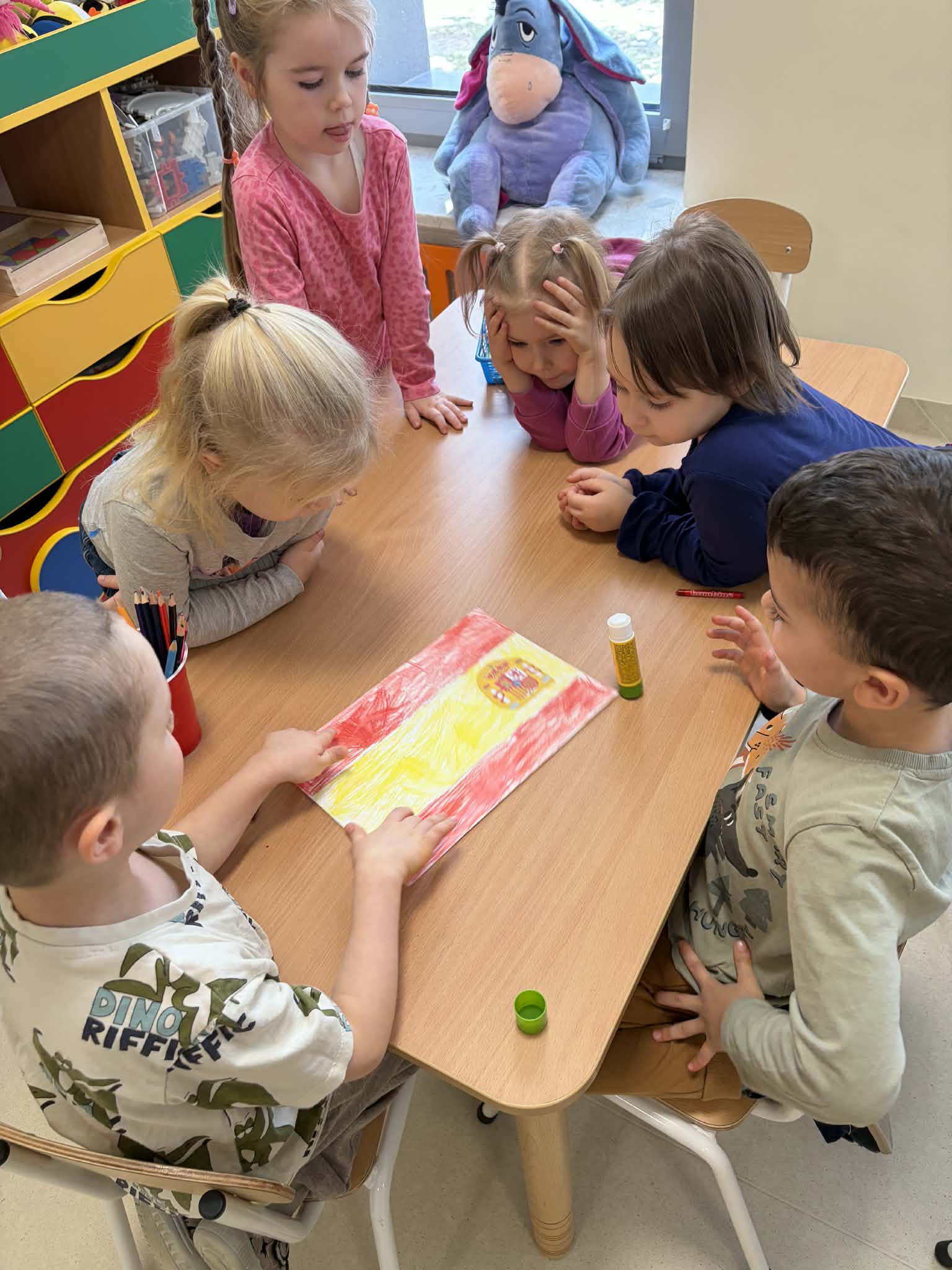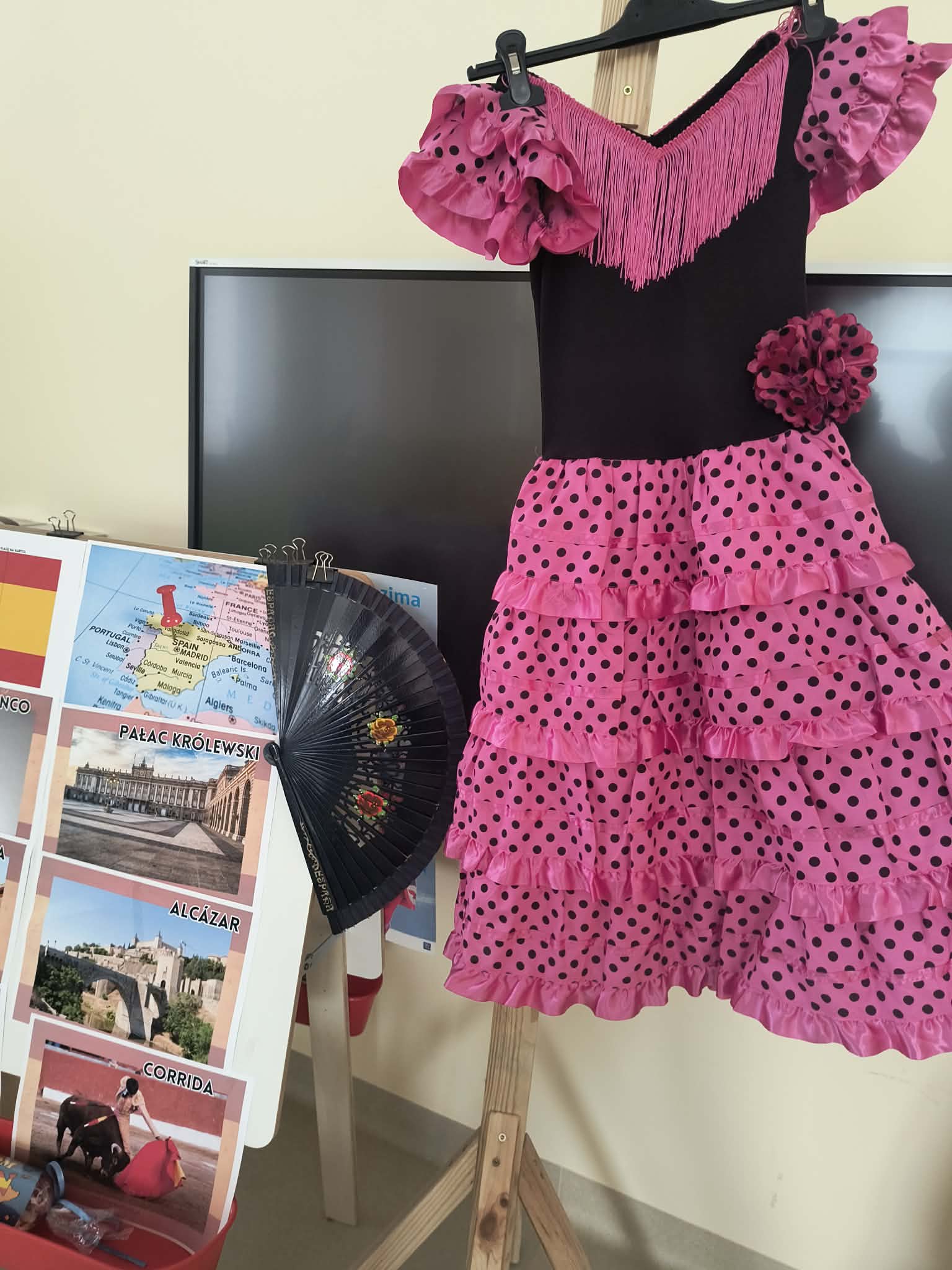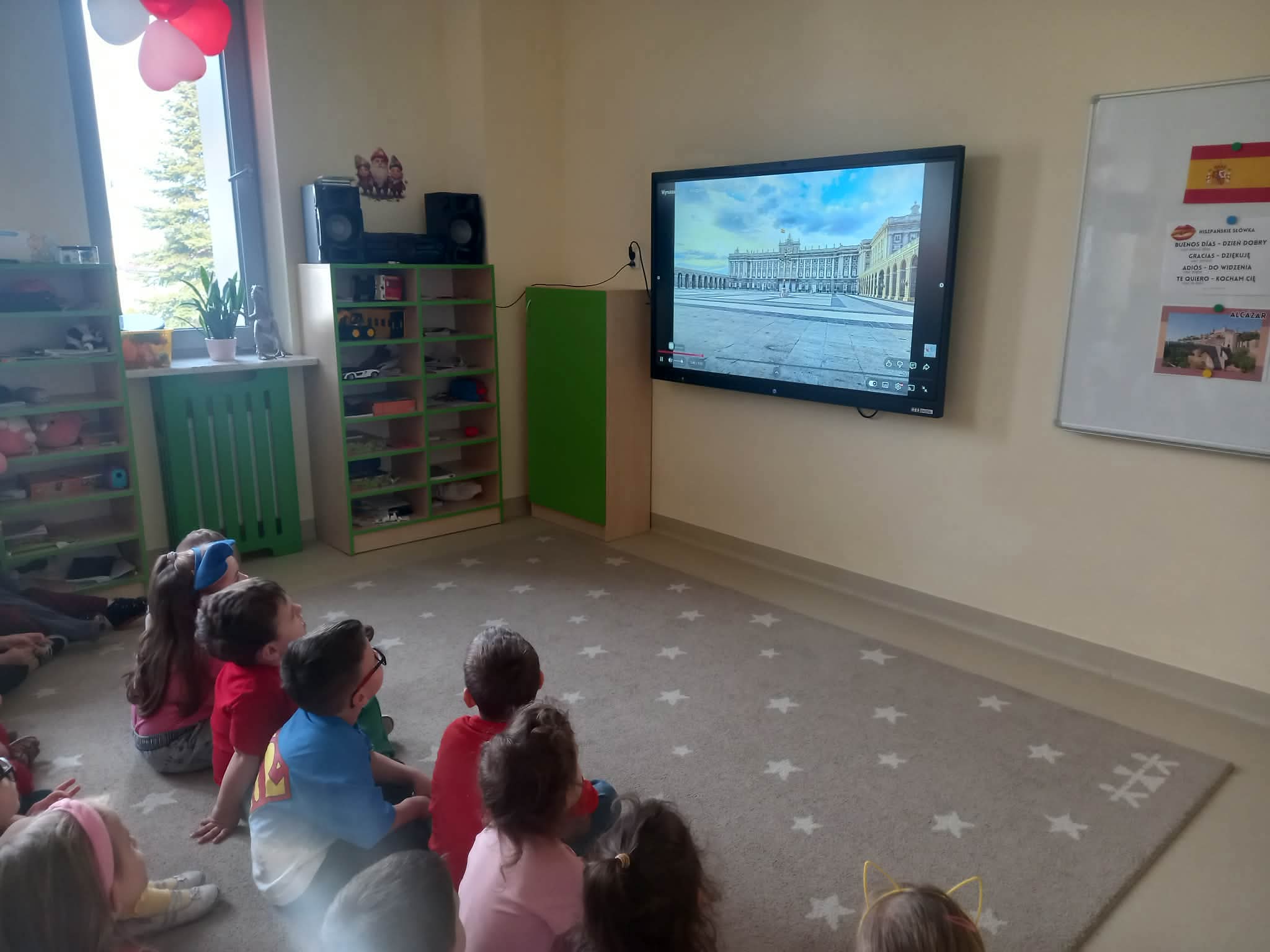 Tego dnia dzieci miały okazję uczestniczyć w wyjątkowych zajęciach pełnych kolorów, muzyki i radości. Przedszkolaki oglądały ciekawe prezentacje, dzięki którym poznały najważniejsze symbole, tradycje oraz ciekawostki związane z Hiszpanią. Nie zabrakło wspólnych zabaw ruchowych i aktywności inspirowanych hiszpańskim temperamentem. Odbyła się również wesoła „bitwa na pomidory” – nawiązująca do znanego święta La Tomatina.