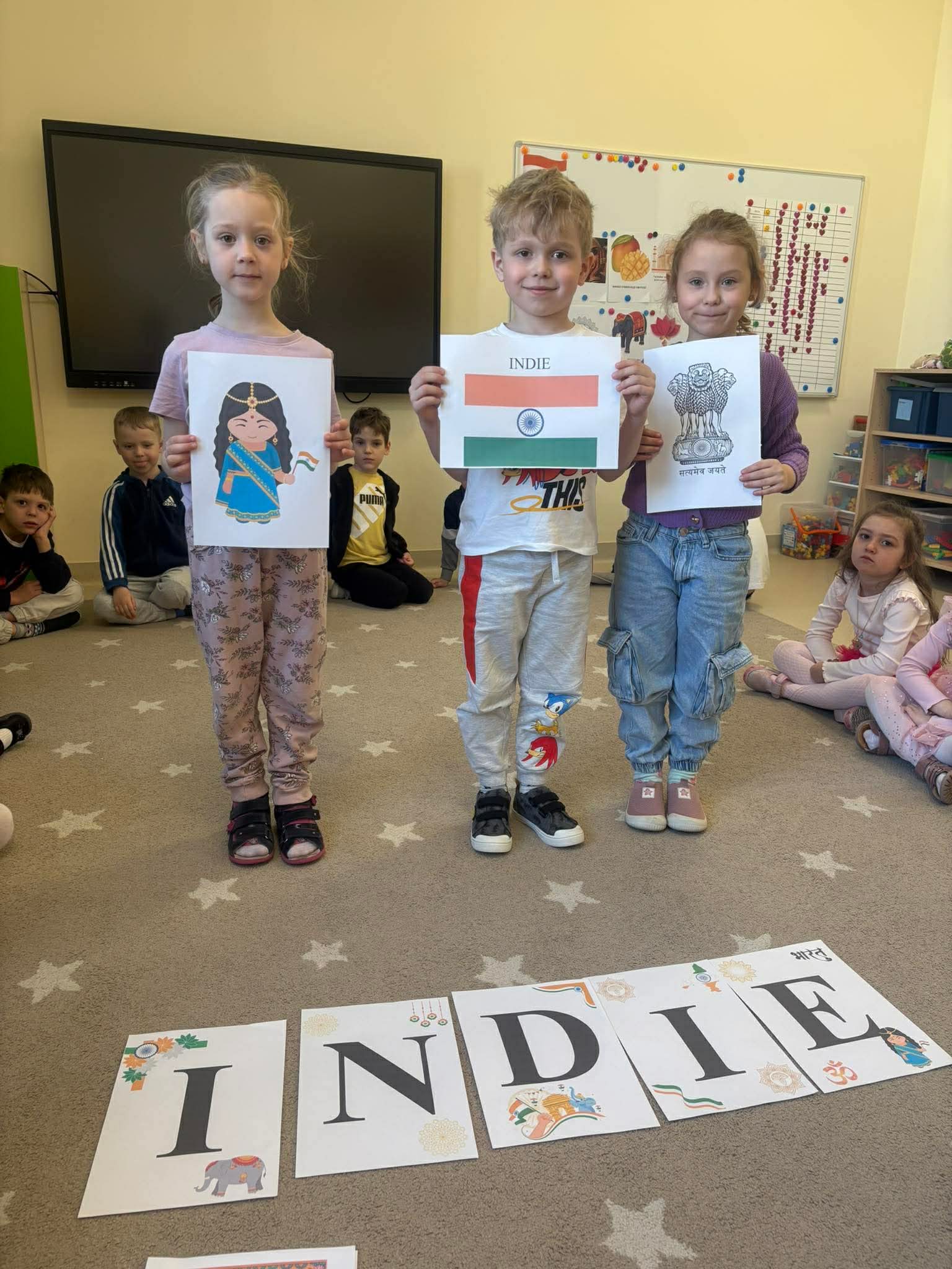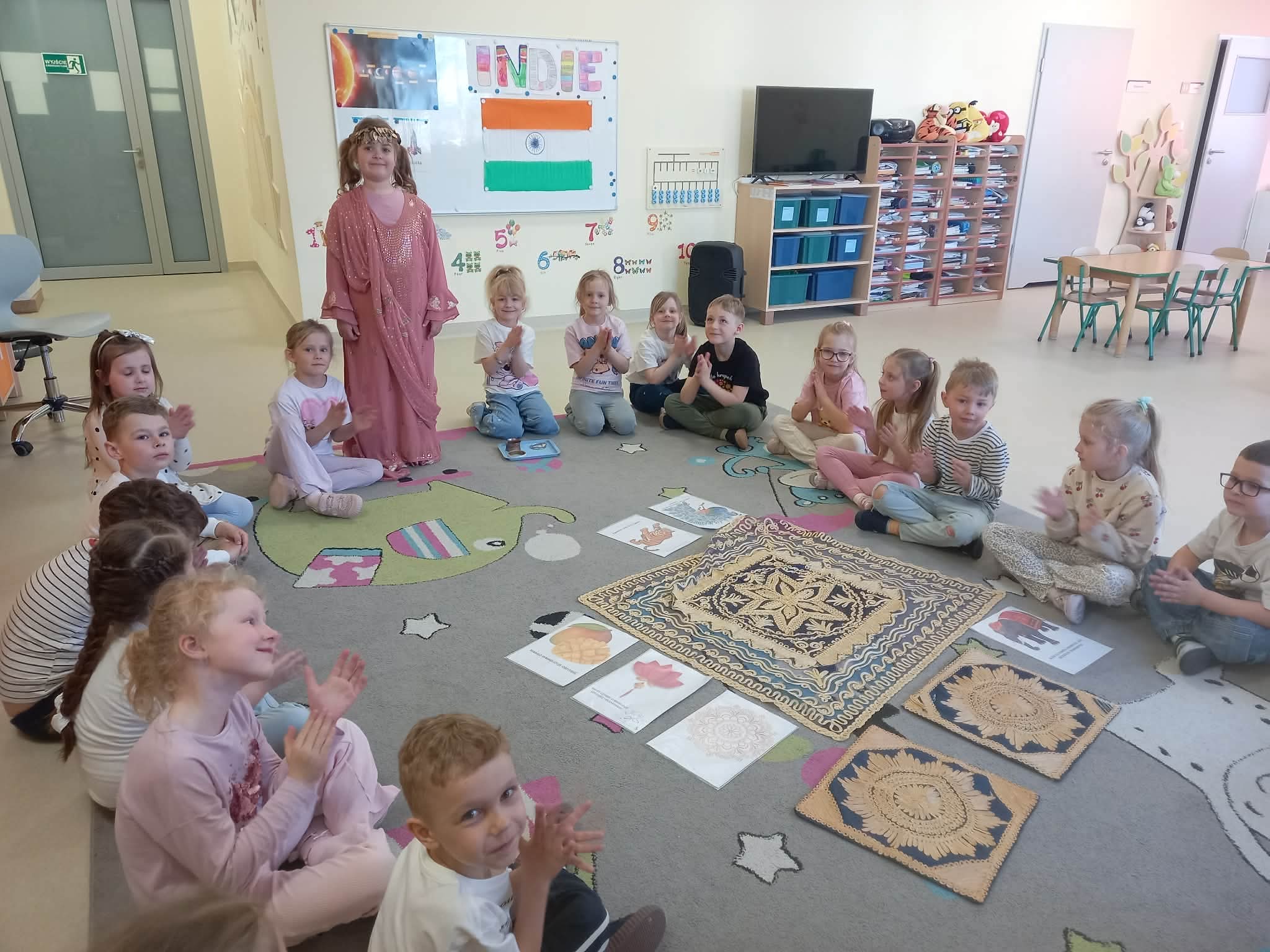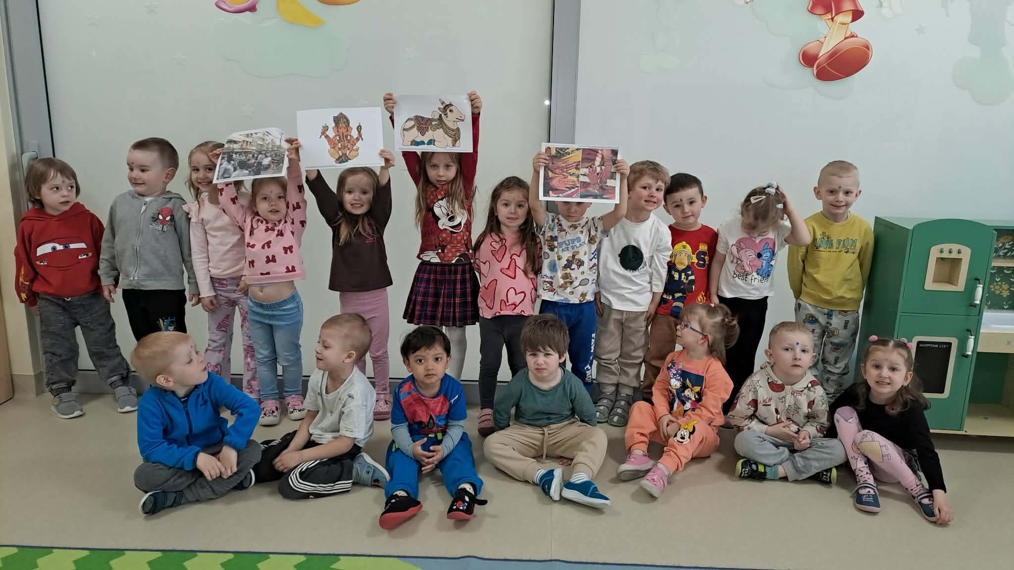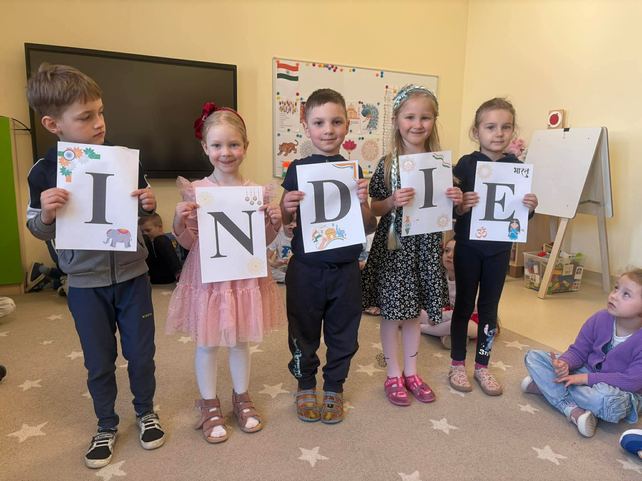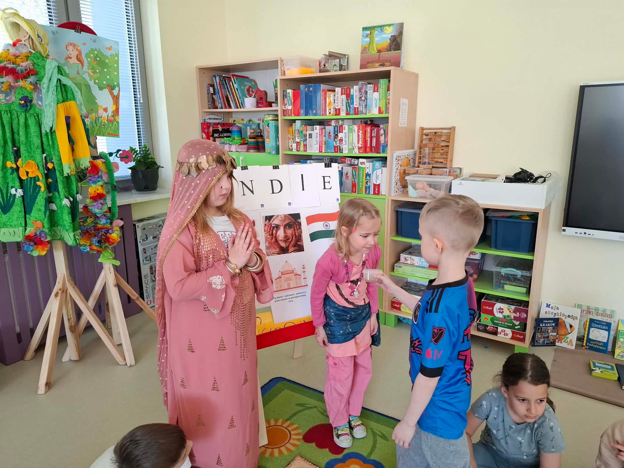 Podczas zajęć przedszkolaki dowiedziały się jak wygląda flaga Indii, jakie zwierzęta tam żyją oraz jakie potrawy są tam popularne. Nie zabrakło także aktywności praktycznych – dzieci słuchały indyjskiej muzyki, próbowały prostych ruchów tanecznych oraz wykonały kolorowe prace plastyczne inspirowane kulturą Indii. Głównym elementem dzisiejszego dnia była degustacja owoców oraz tworzenie przez dzieci indyjskich kulek z kaszy, znanych głównie jako Rava Laddu.