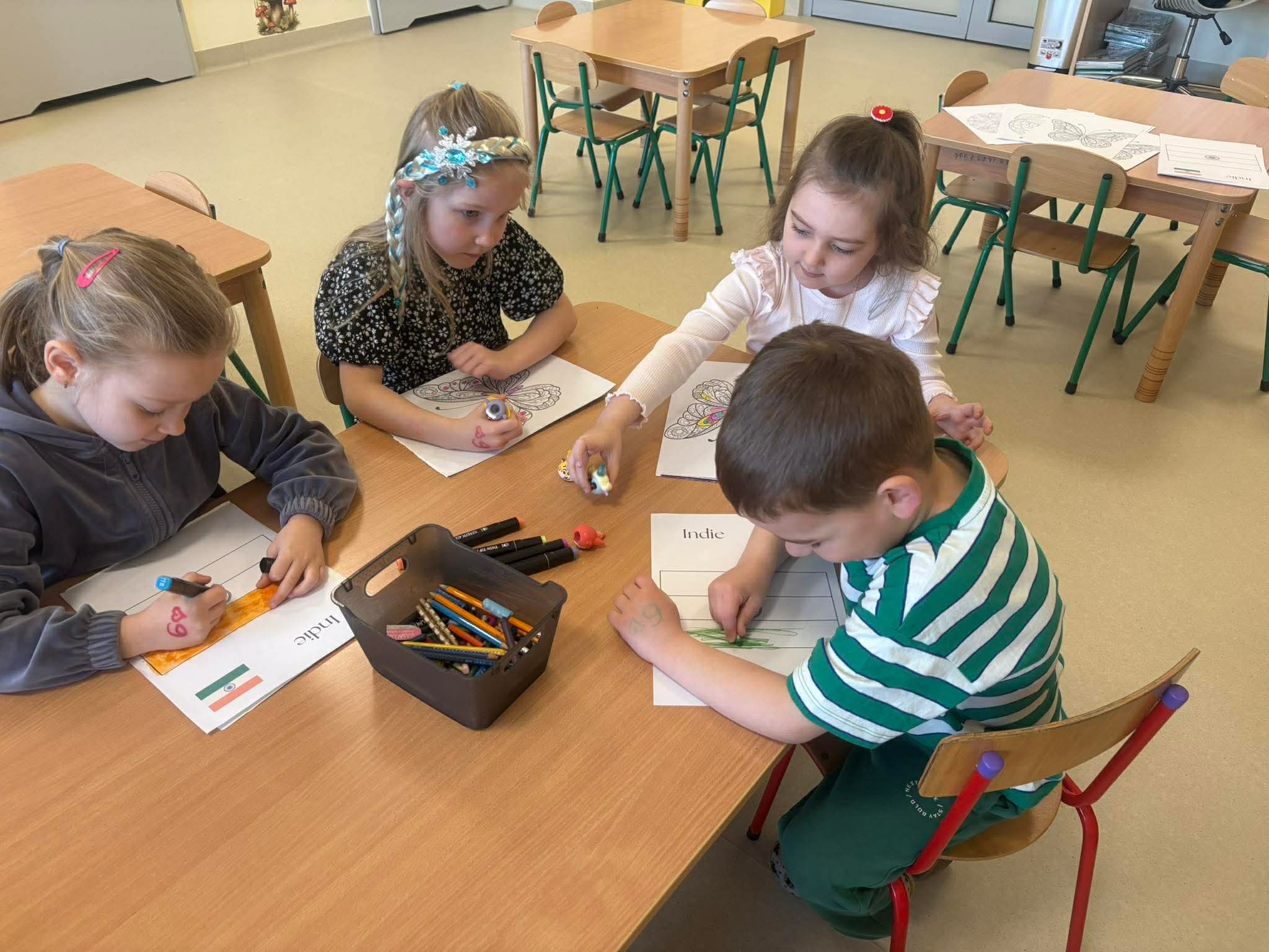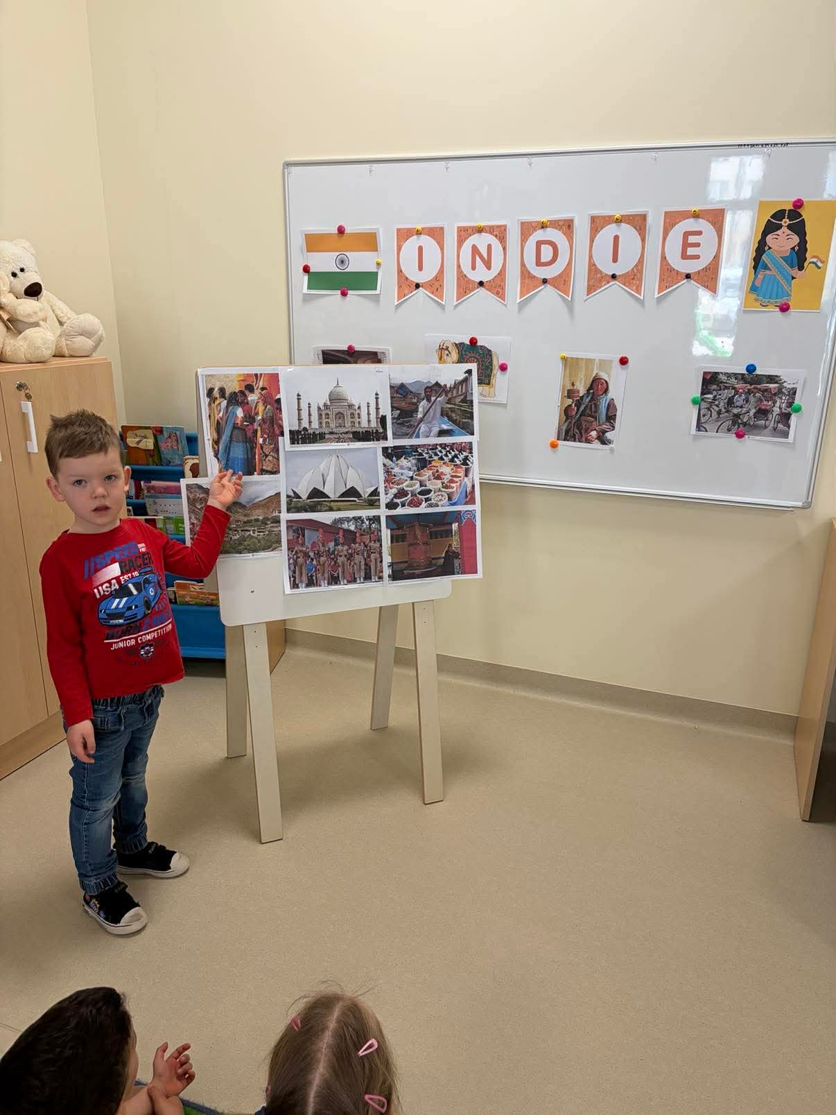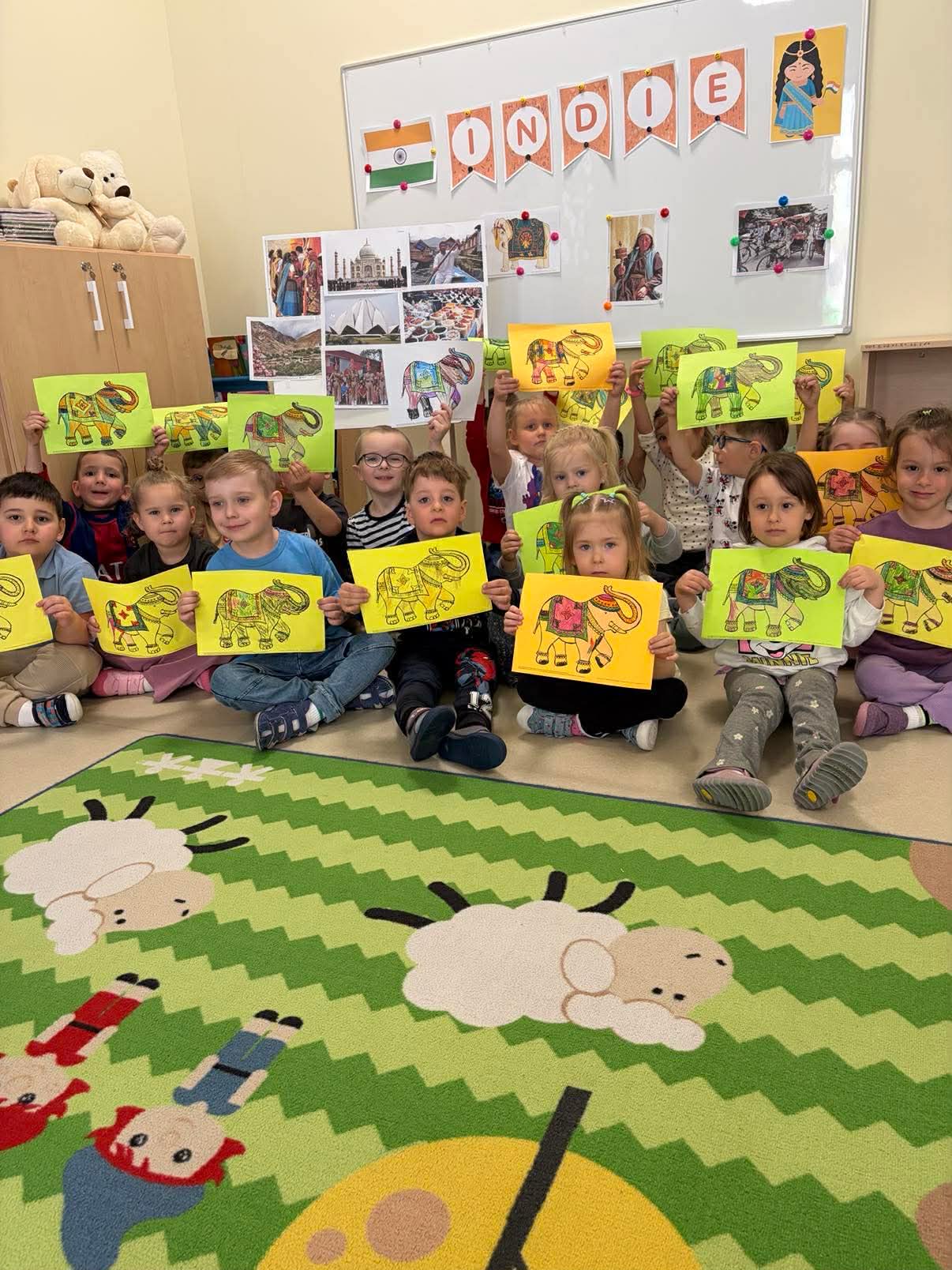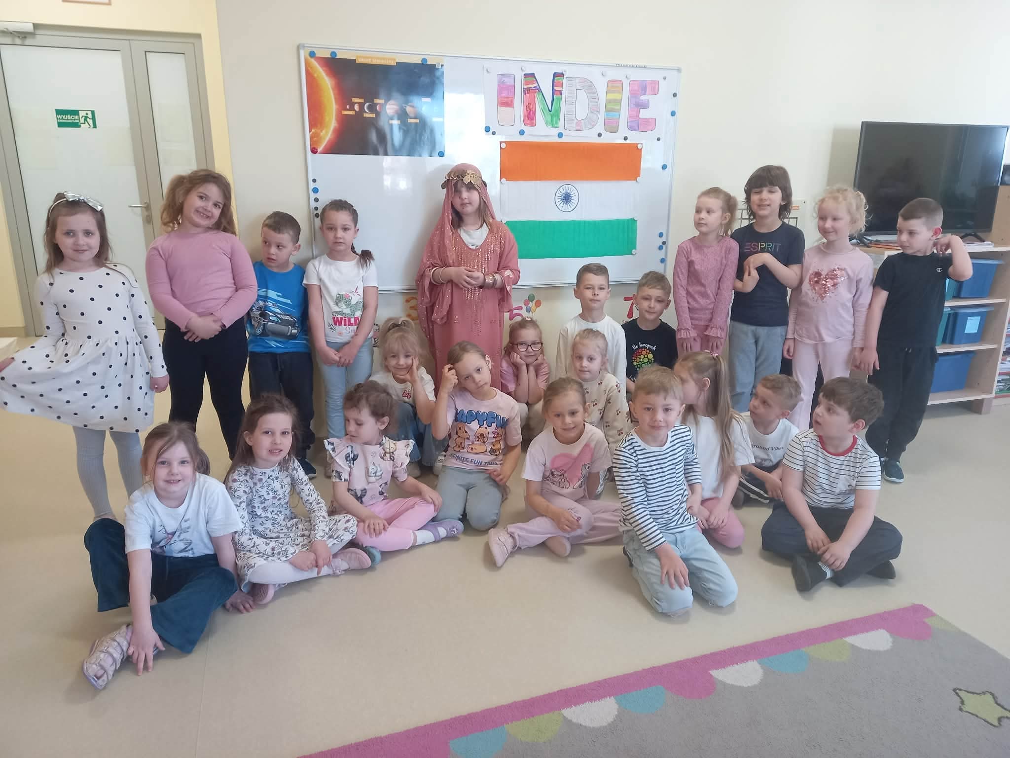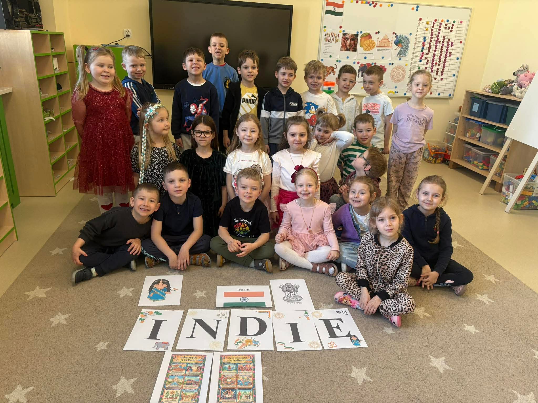 Podczas zajęć przedszkolaki dowiedziały się jak wygląda flaga Indii, jakie zwierzęta tam żyją oraz jakie potrawy są tam popularne. Nie zabrakło także aktywności praktycznych – dzieci słuchały indyjskiej muzyki, próbowały prostych ruchów tanecznych oraz wykonały kolorowe prace plastyczne inspirowane kulturą Indii. Głównym elementem dzisiejszego dnia była degustacja owoców oraz tworzenie przez dzieci indyjskich kulek z kaszy, znanych głównie jako Rava Laddu.