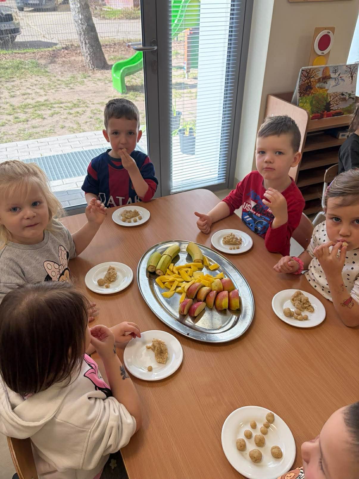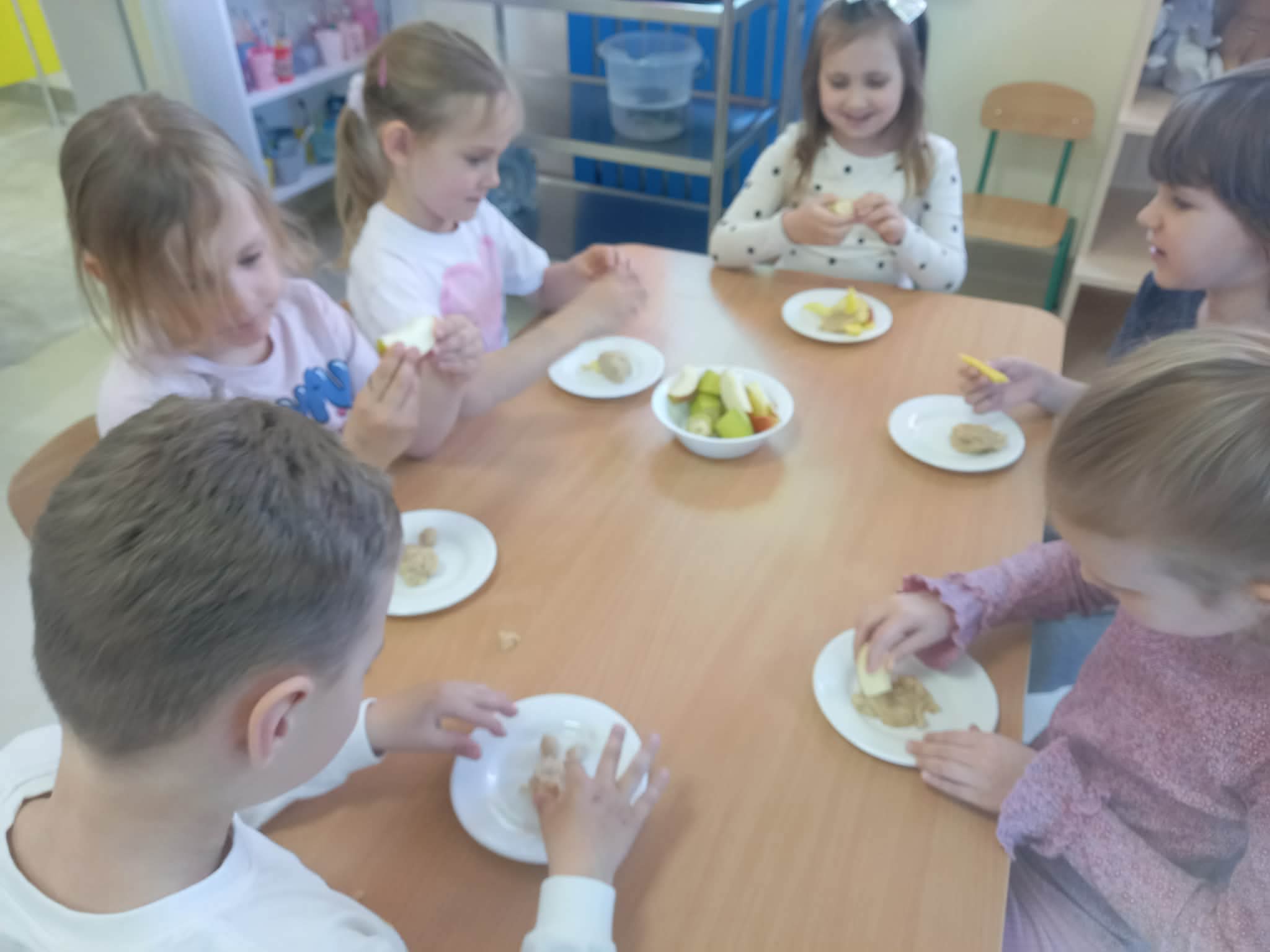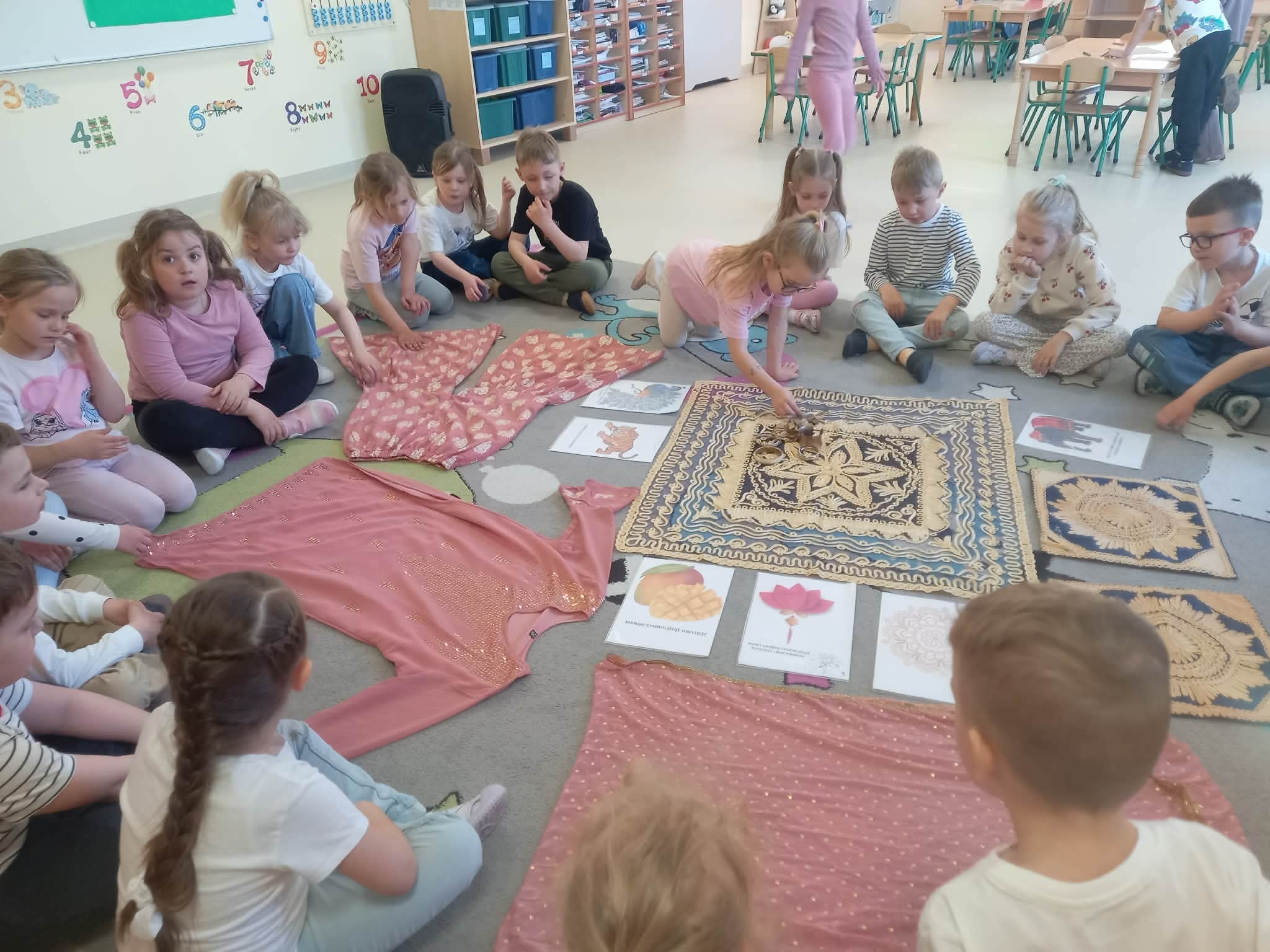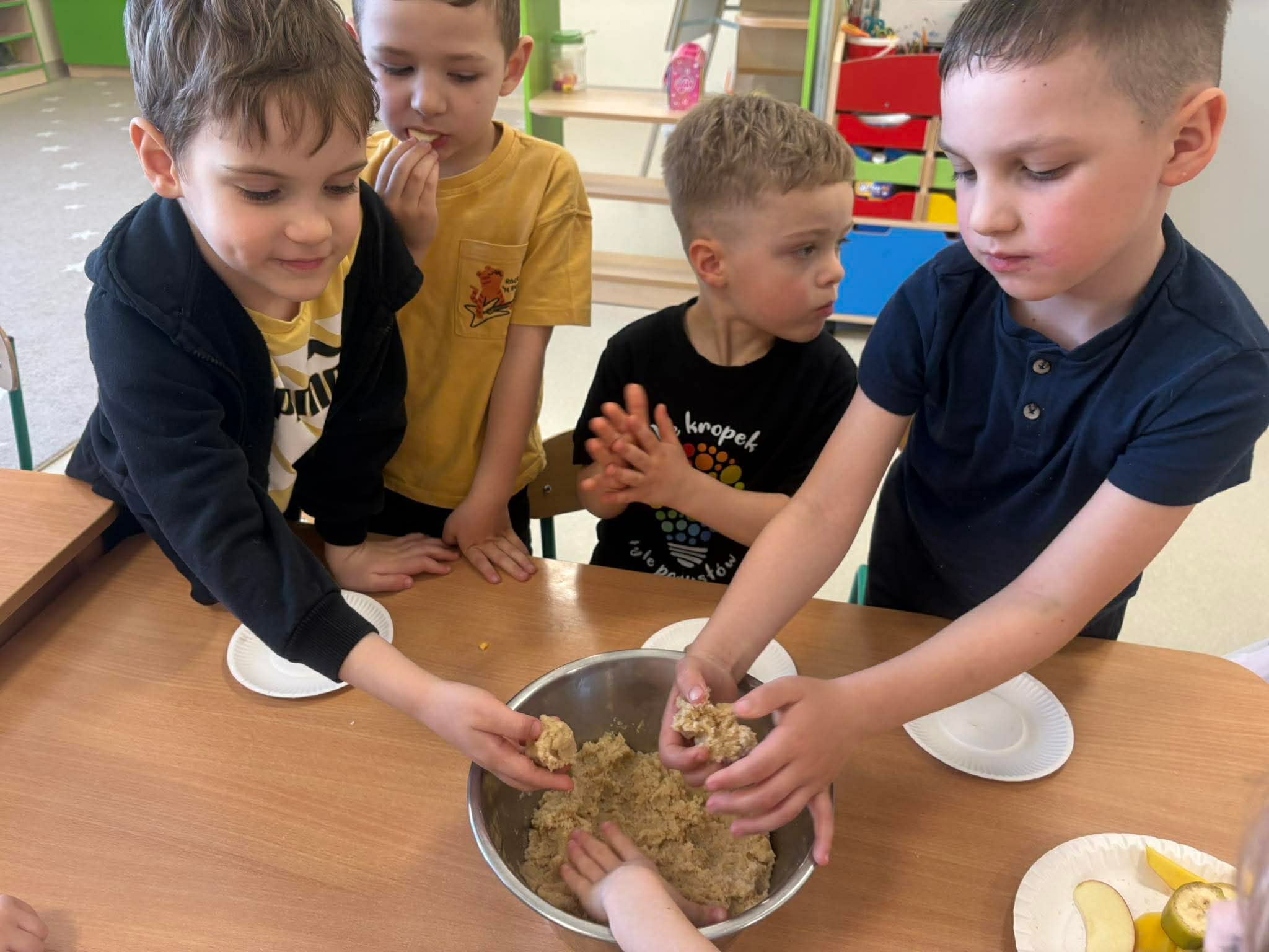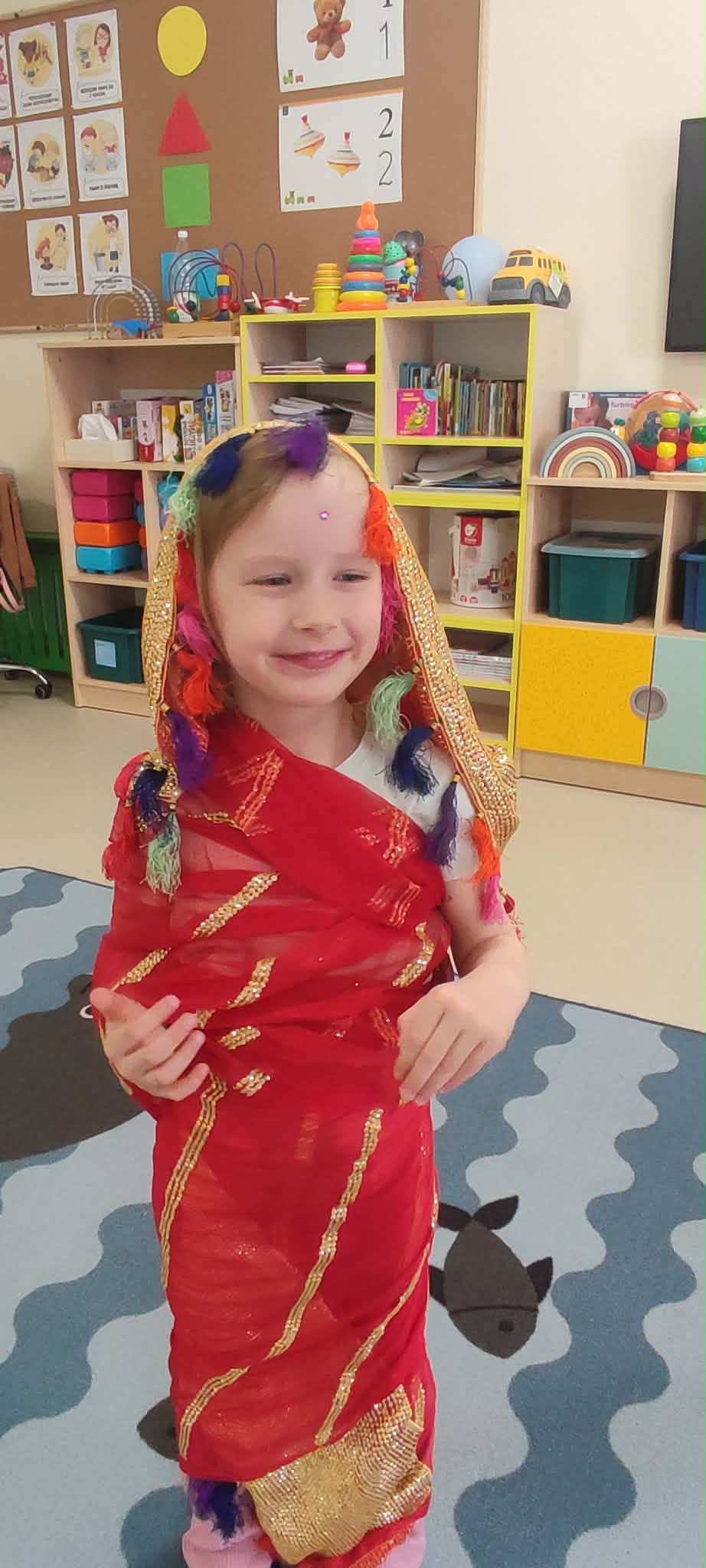 Podczas zajęć przedszkolaki dowiedziały się jak wygląda flaga Indii, jakie zwierzęta tam żyją oraz jakie potrawy są tam popularne. Nie zabrakło także aktywności praktycznych – dzieci słuchały indyjskiej muzyki, próbowały prostych ruchów tanecznych oraz wykonały kolorowe prace plastyczne inspirowane kulturą Indii. Głównym elementem dzisiejszego dnia była degustacja owoców oraz tworzenie przez dzieci indyjskich kulek z kaszy, znanych głównie jako Rava Laddu.