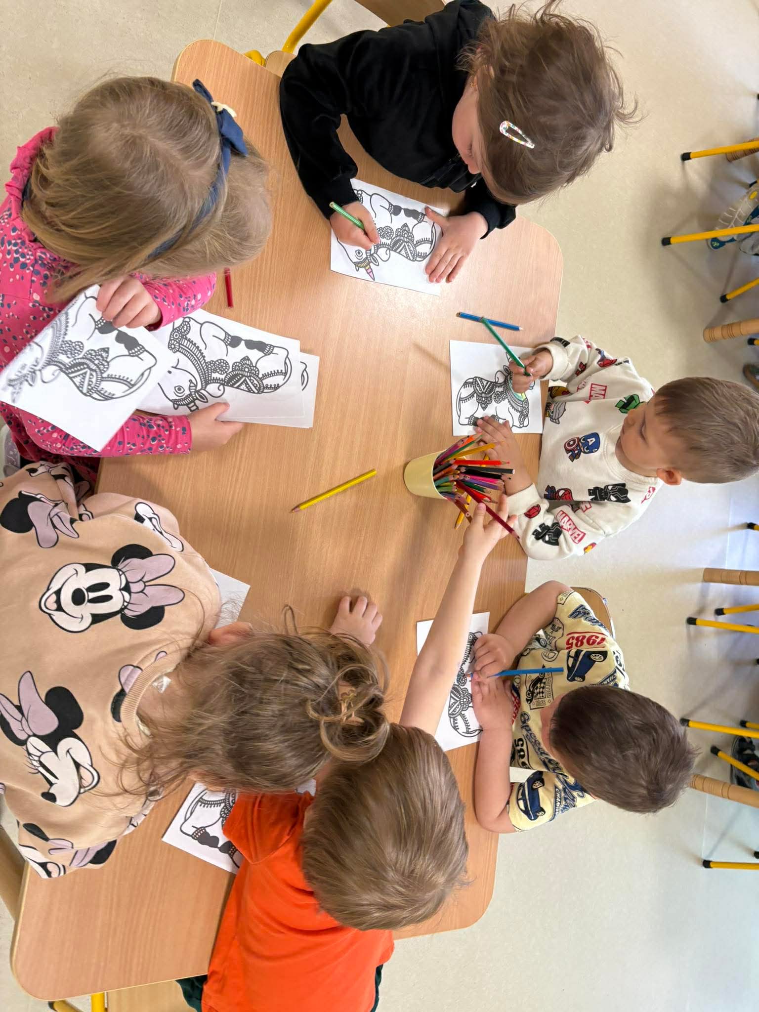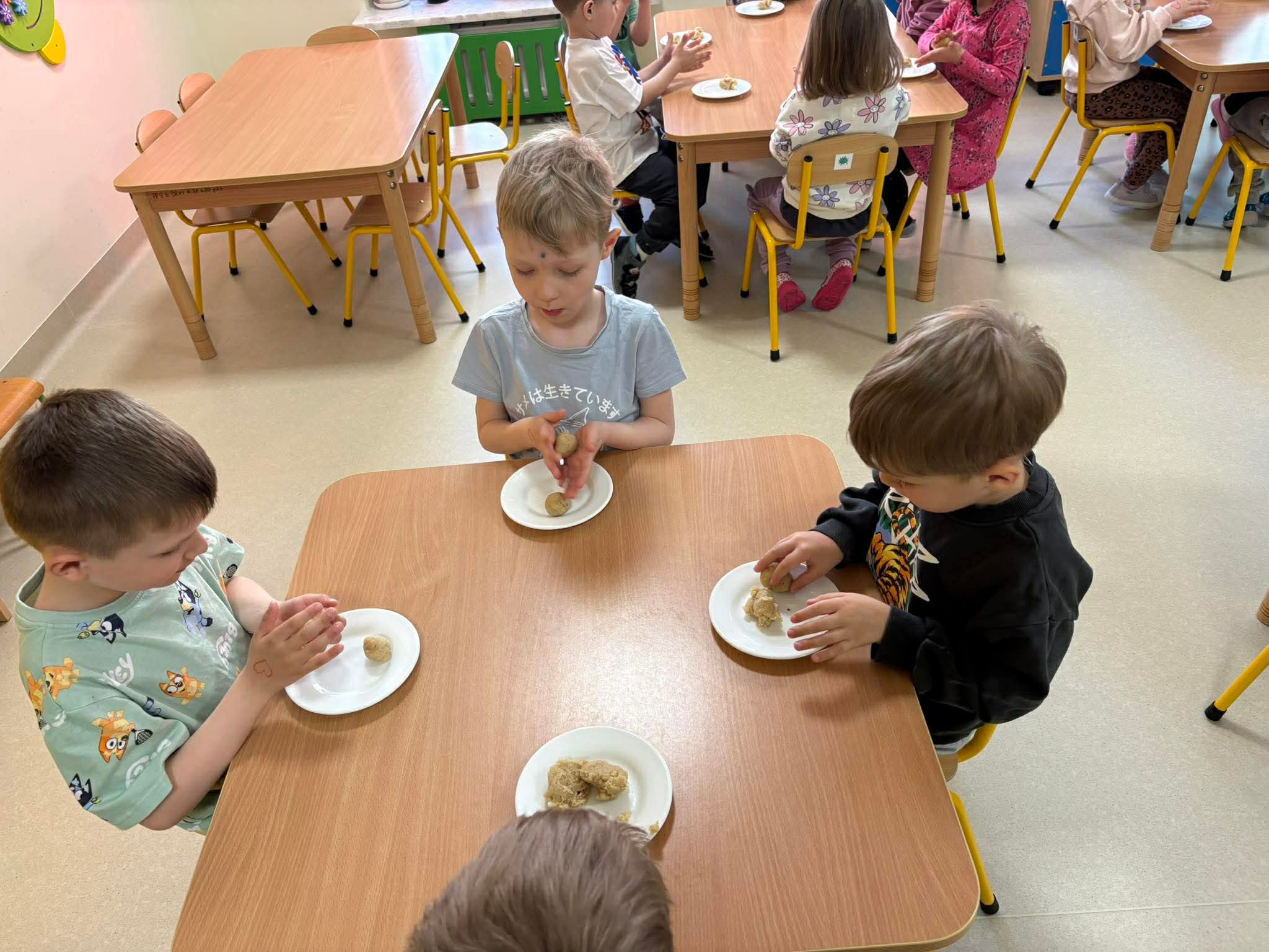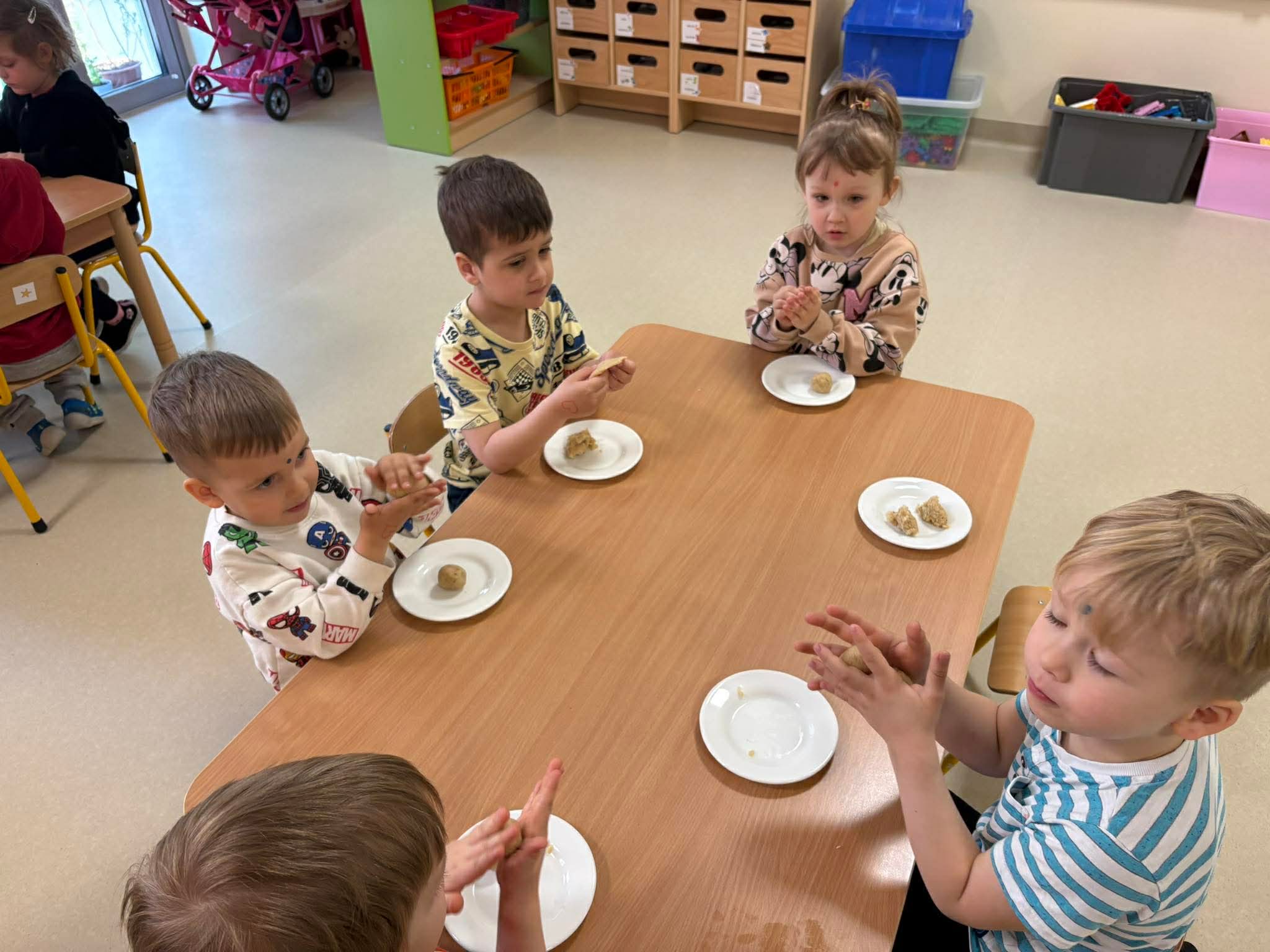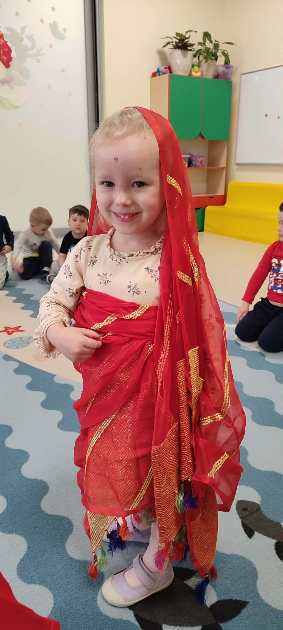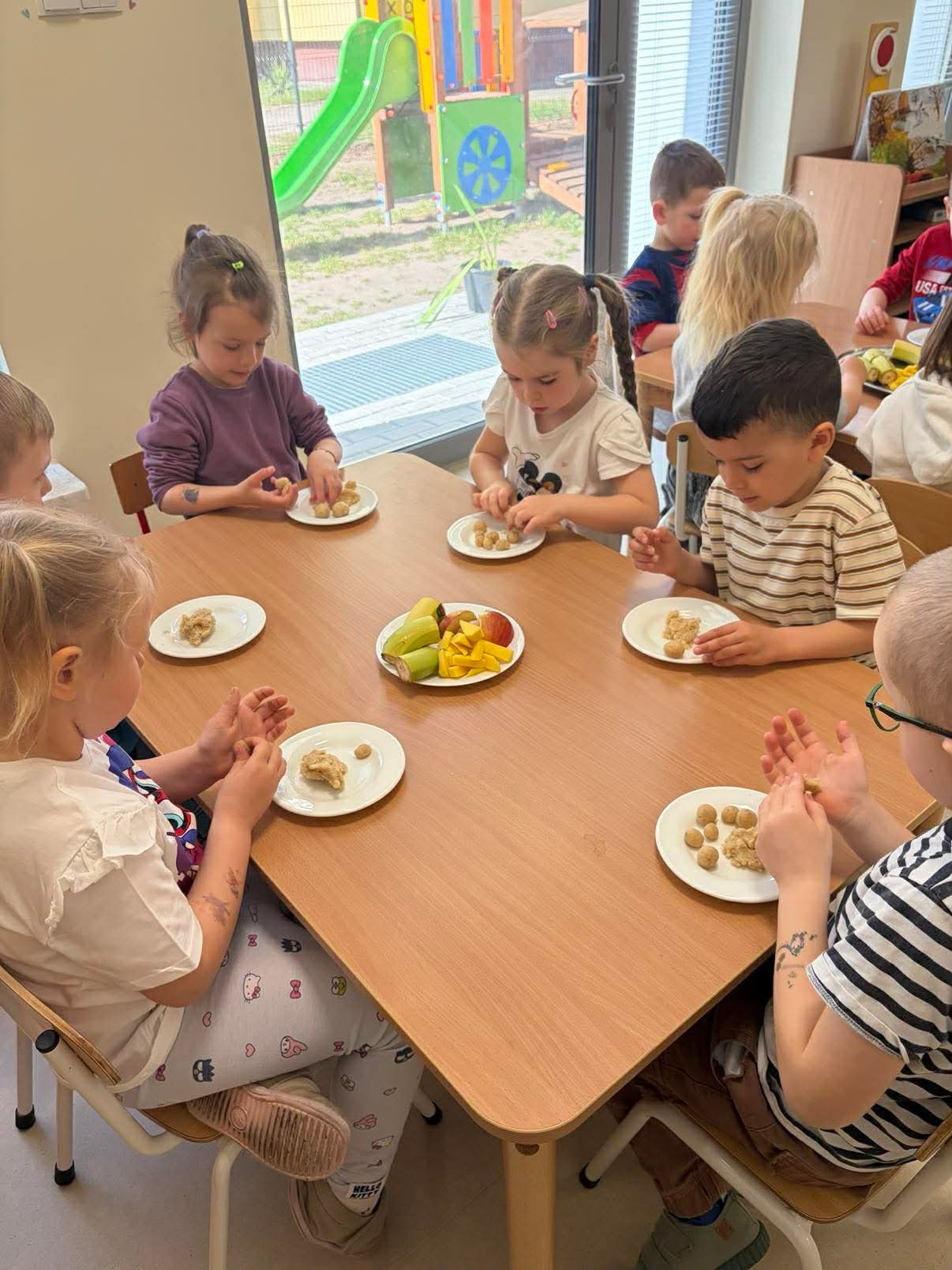 Podczas zajęć przedszkolaki dowiedziały się jak wygląda flaga Indii, jakie zwierzęta tam żyją oraz jakie potrawy są tam popularne. Nie zabrakło także aktywności praktycznych – dzieci słuchały indyjskiej muzyki, próbowały prostych ruchów tanecznych oraz wykonały kolorowe prace plastyczne inspirowane kulturą Indii. Głównym elementem dzisiejszego dnia była degustacja owoców oraz tworzenie przez dzieci indyjskich kulek z kaszy, znanych głównie jako Rava Laddu.