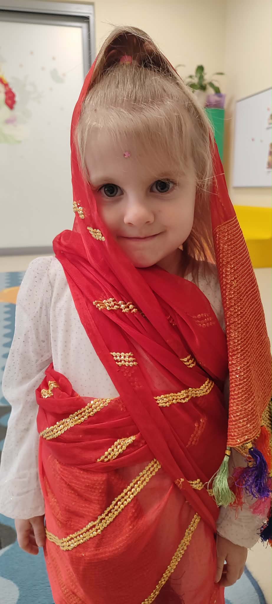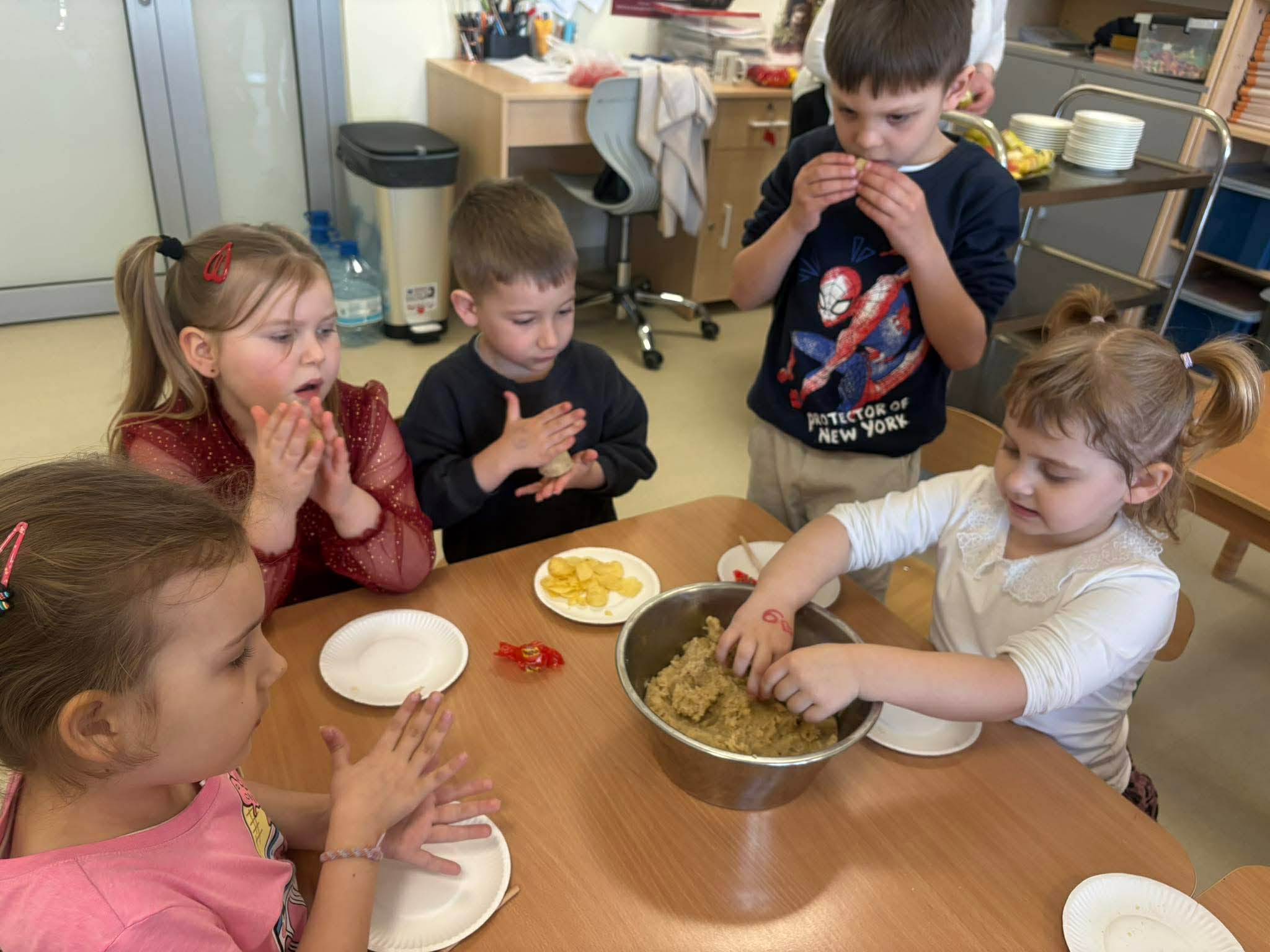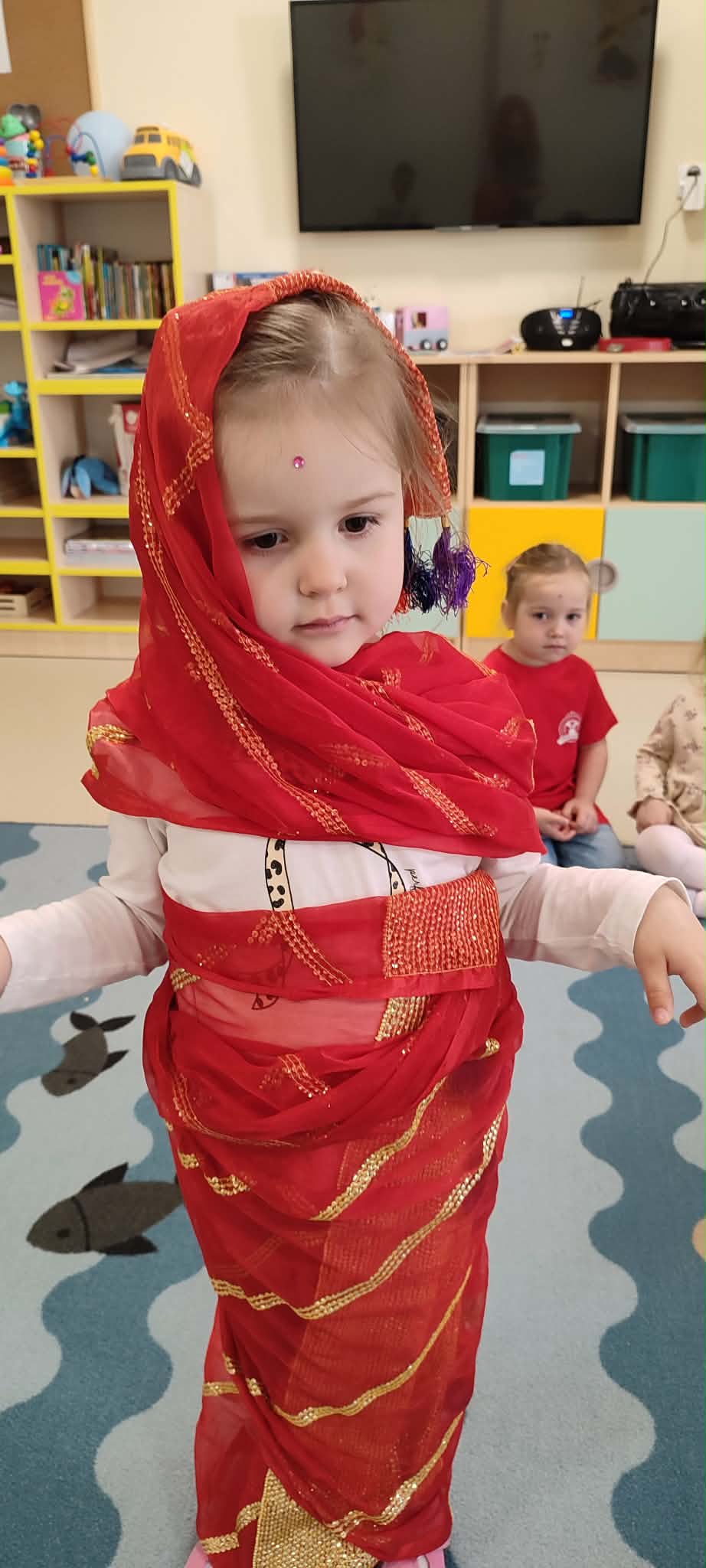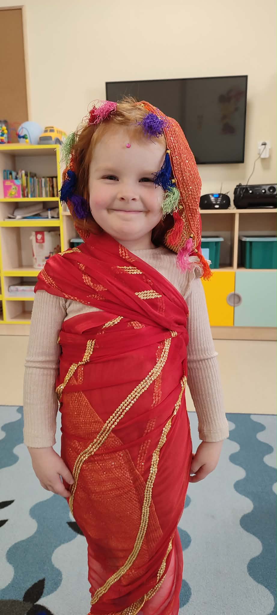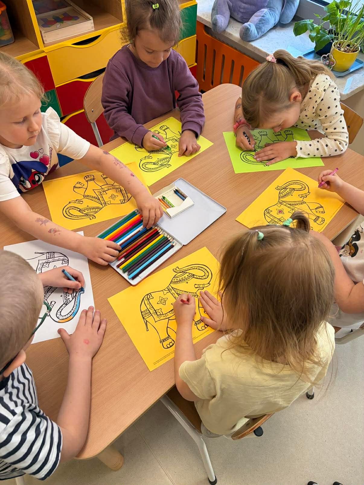 Podczas zajęć przedszkolaki dowiedziały się jak wygląda flaga Indii, jakie zwierzęta tam żyją oraz jakie potrawy są tam popularne. Nie zabrakło także aktywności praktycznych – dzieci słuchały indyjskiej muzyki, próbowały prostych ruchów tanecznych oraz wykonały kolorowe prace plastyczne inspirowane kulturą Indii. Głównym elementem dzisiejszego dnia była degustacja owoców oraz tworzenie przez dzieci indyjskich kulek z kaszy, znanych głównie jako Rava Laddu.