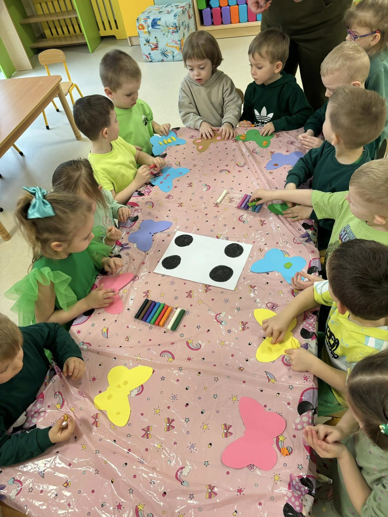 Tego dnia obchodziliśmy także Światowy Dzień Osób z Zespołem Downa. To wyjątkowa okazja, aby zwiększać świadomość społeczną, okazywać wsparcie oraz podkreślać, jak ważna jest akceptacja i równość. Na znak solidarności dzieci przyszły do przedszkola w dwóch różnych, kolorowych skarpetkach.