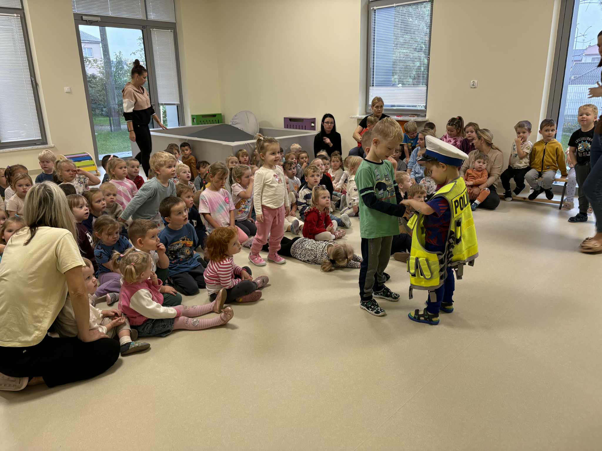 Przedszkolaki uczestniczyły w wyjątkowym spotkaniu z przedstawicielami Policji, którzy opowiedzieli dzieciom o swojej pracy oraz o tym, jak dbać o bezpieczeństwo – w domu, na ulicy i w przedszkolu.