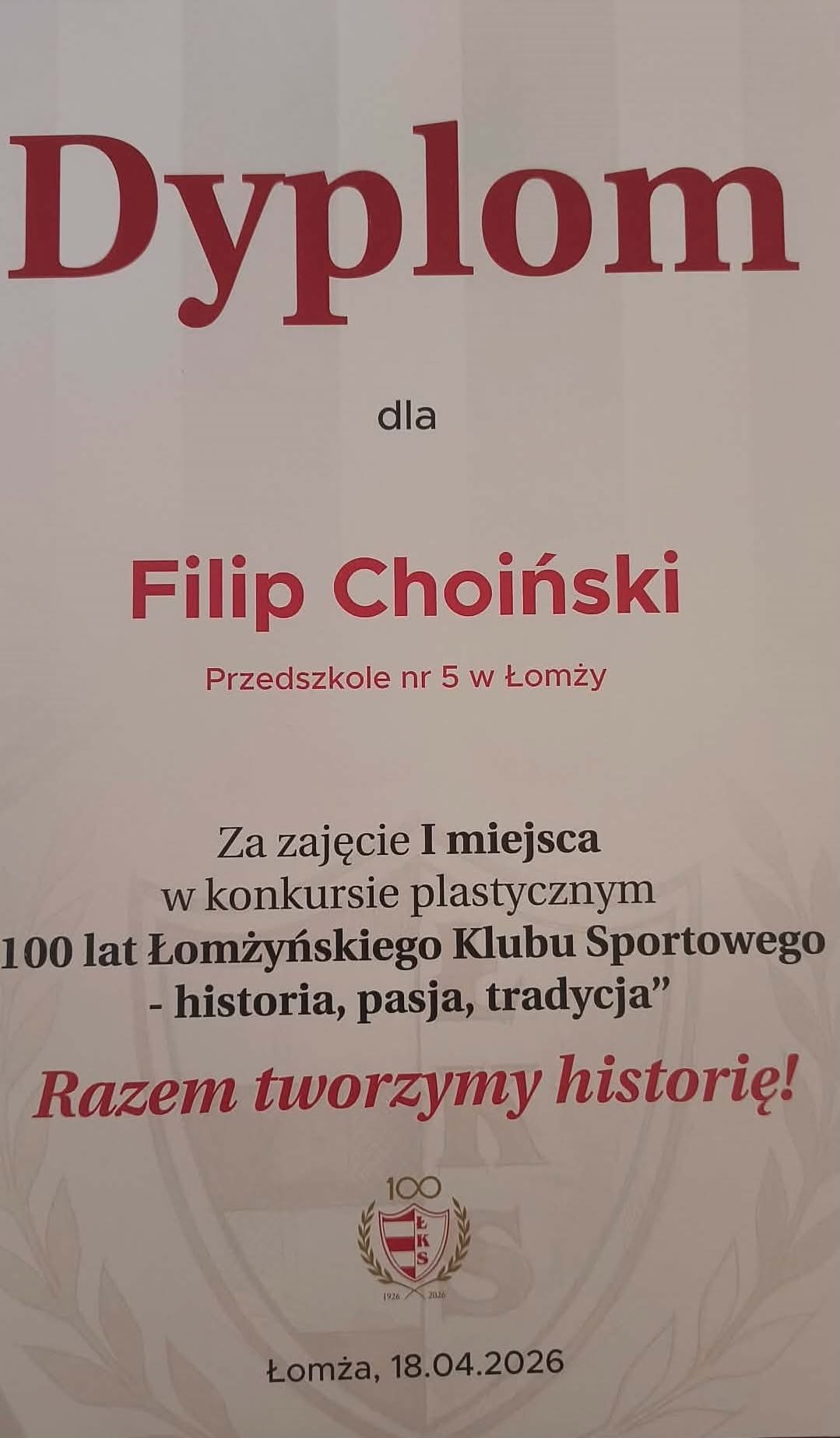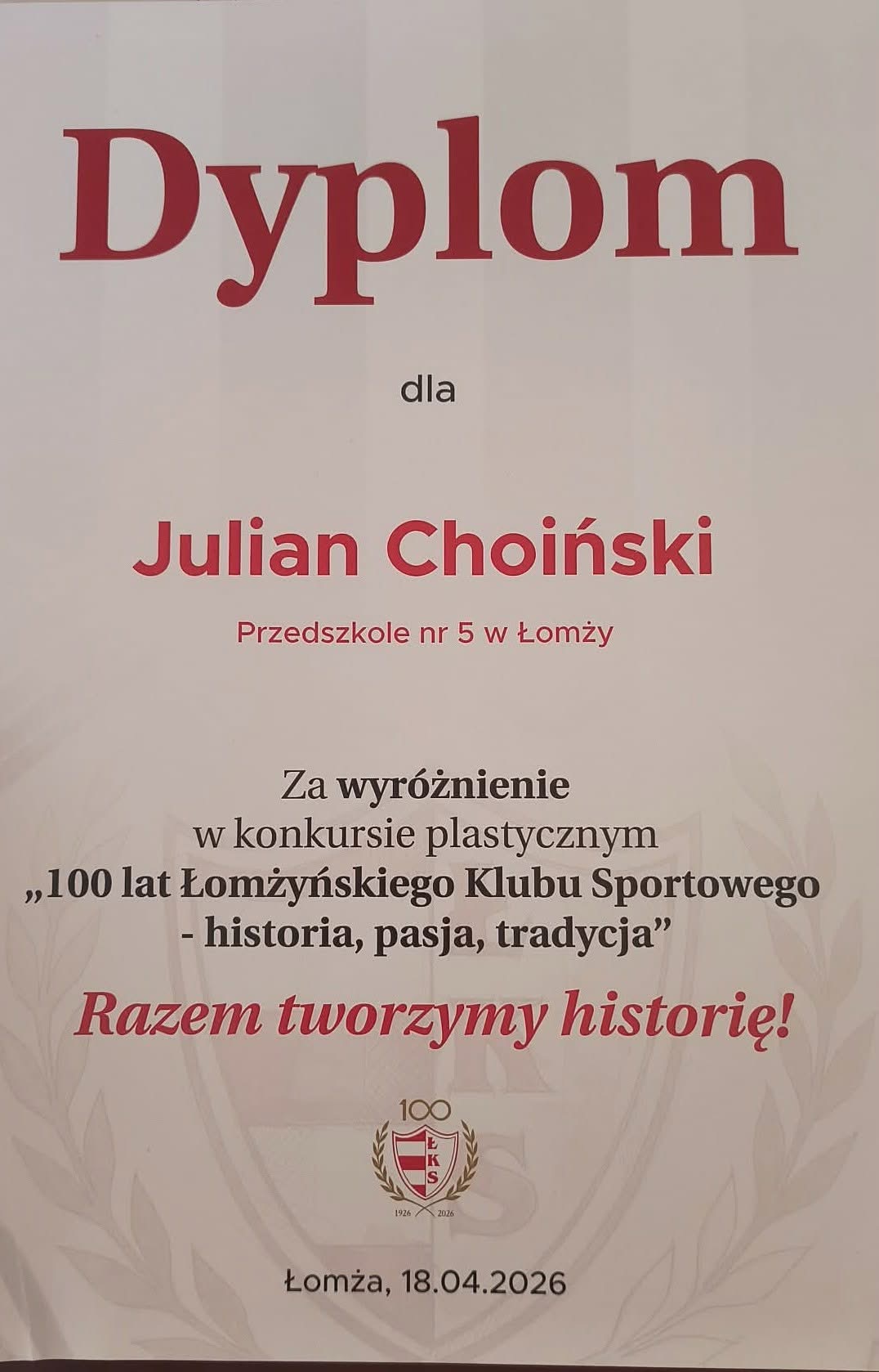 Julek i Filip Choińscy wzięli udział w konkursie plastycznym organizowanym przez ŁKS „ 100 lat łomżyńskiego Klubu Sportowego – historia, pasja, tradycja”.