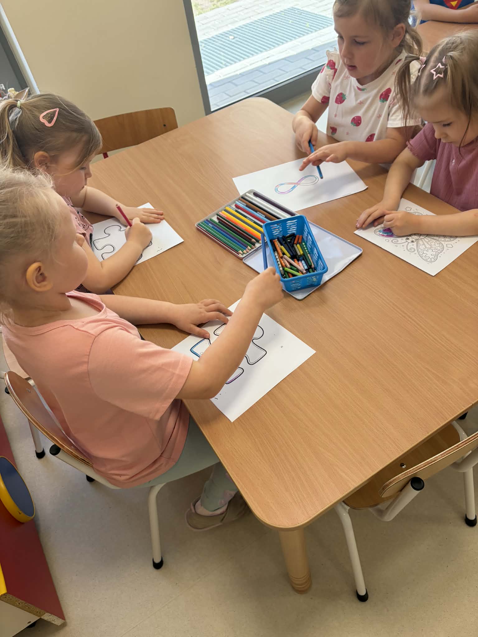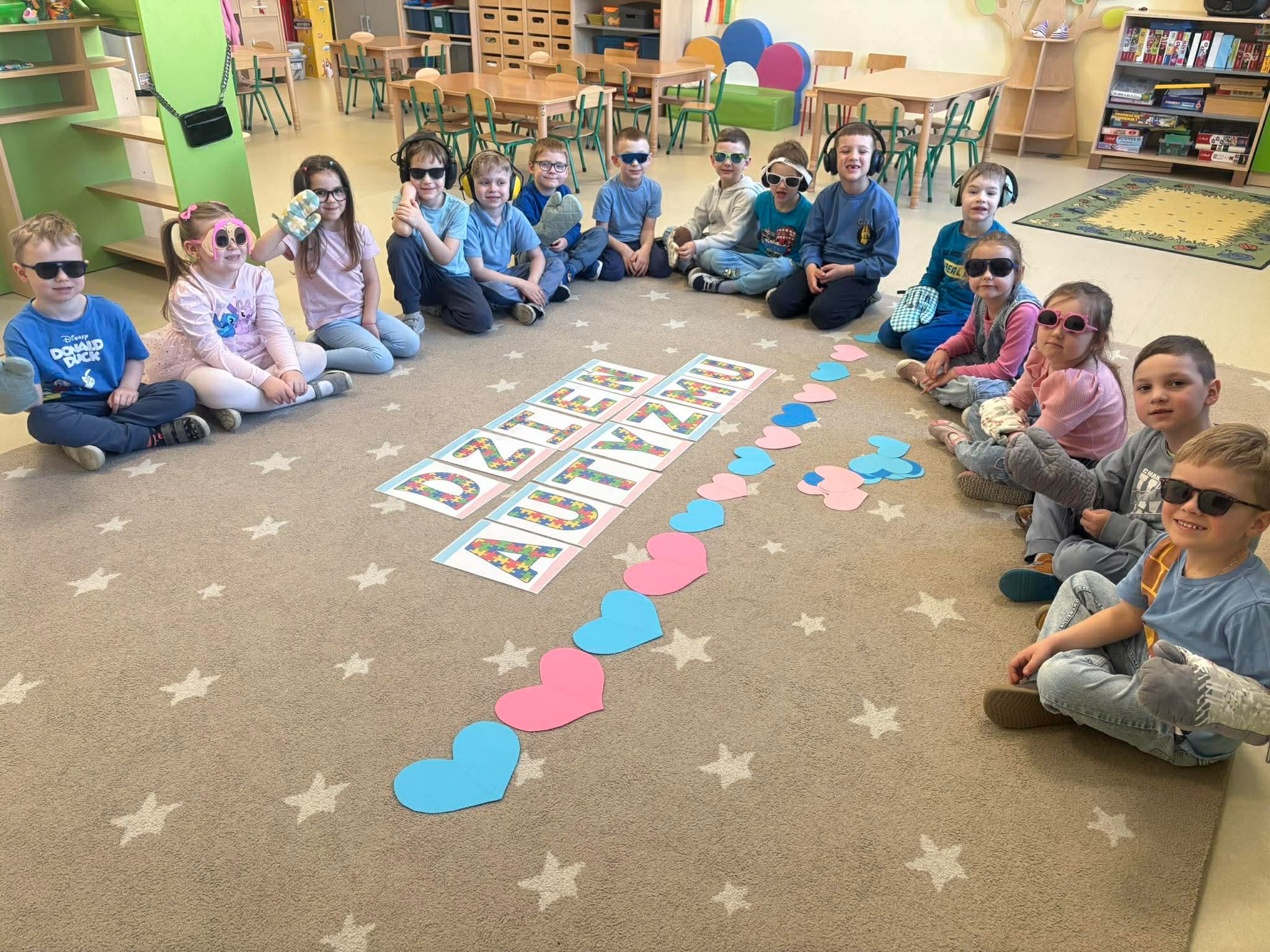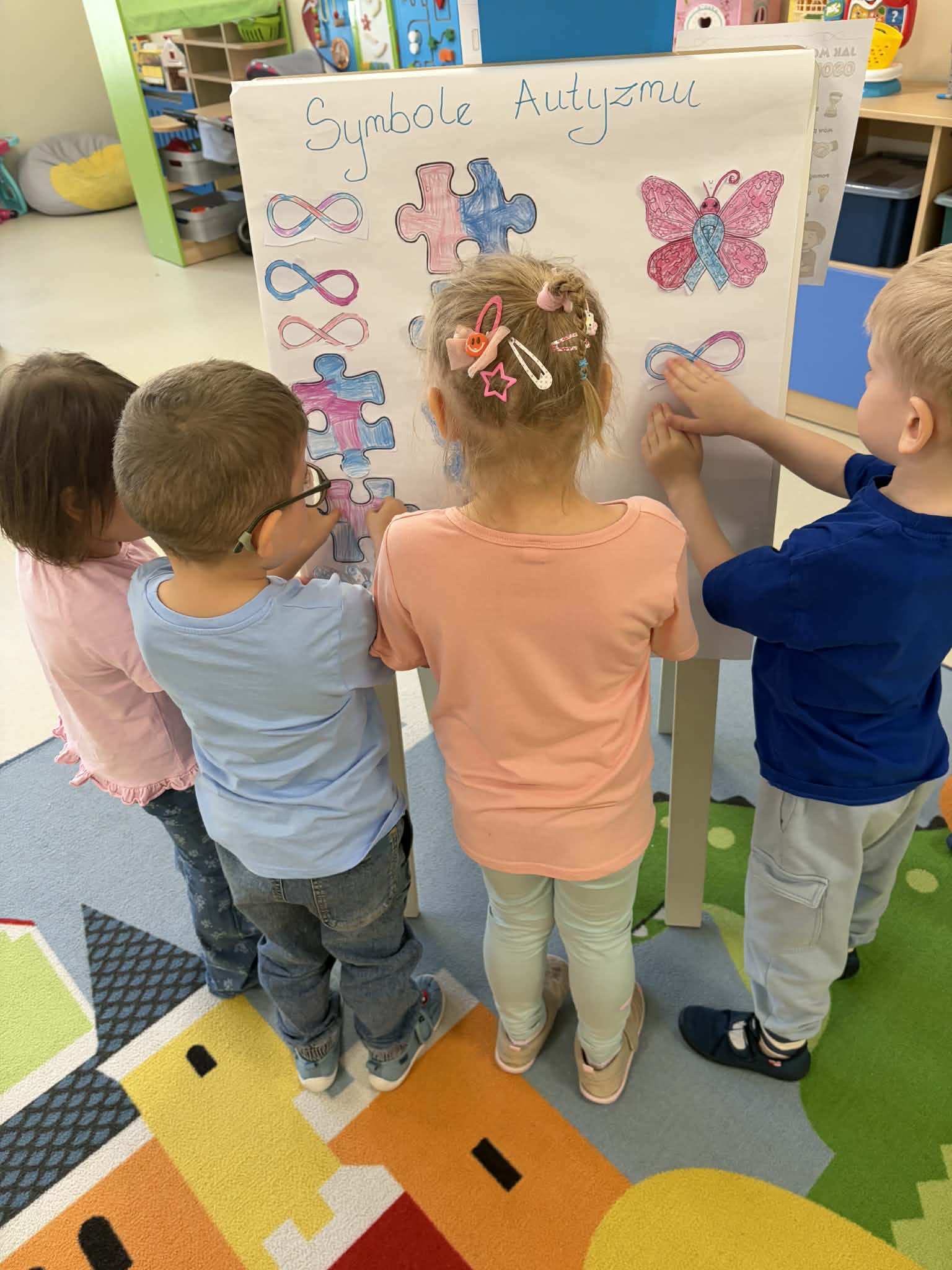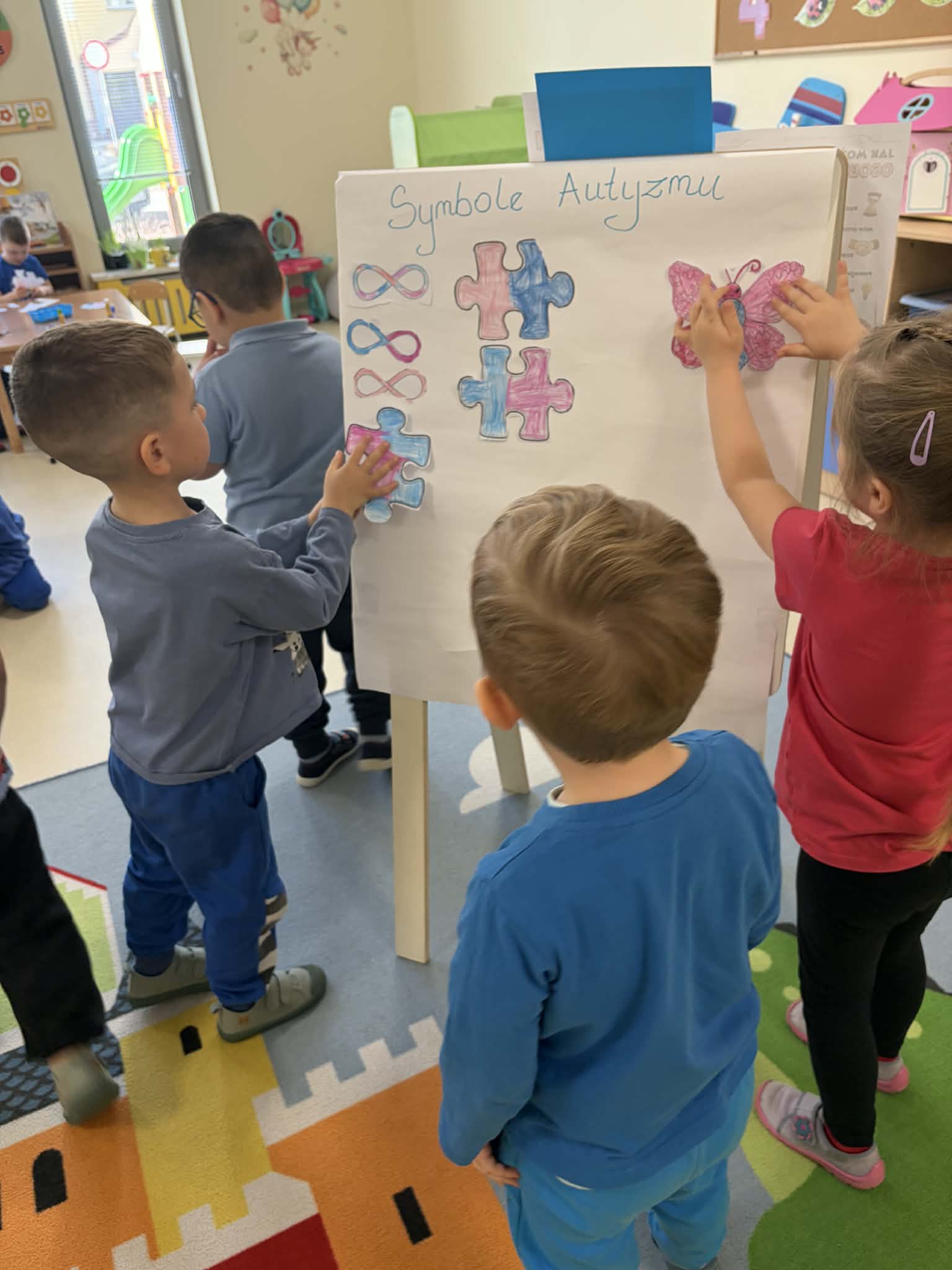 Przedszkolaki brały udział w aktywnościach plastycznych – kolorowały tematyczne ilustracje oraz układały puzzle. Tego dnia dzieci przyszły ubrane na niebiesko i różowo, okazując w ten sposób solidarność i wsparcie. Wspólne działania sprzyjały integracji, rozwijaniu wrażliwości społecznej oraz kształtowaniu postawy szacunku wobec drugiego człowieka.