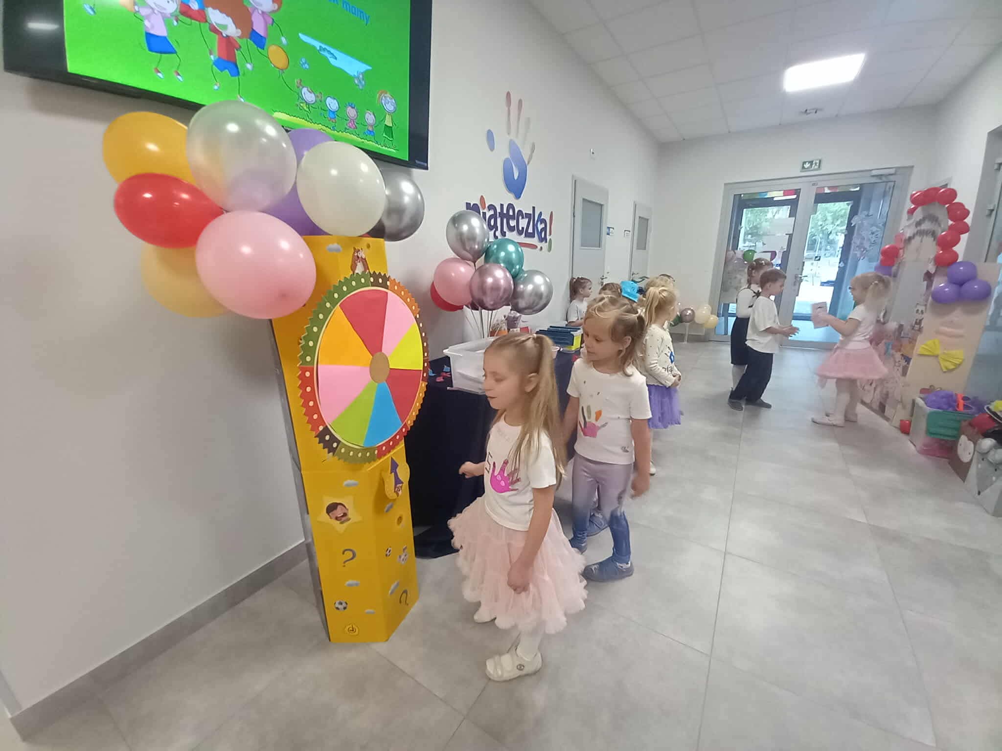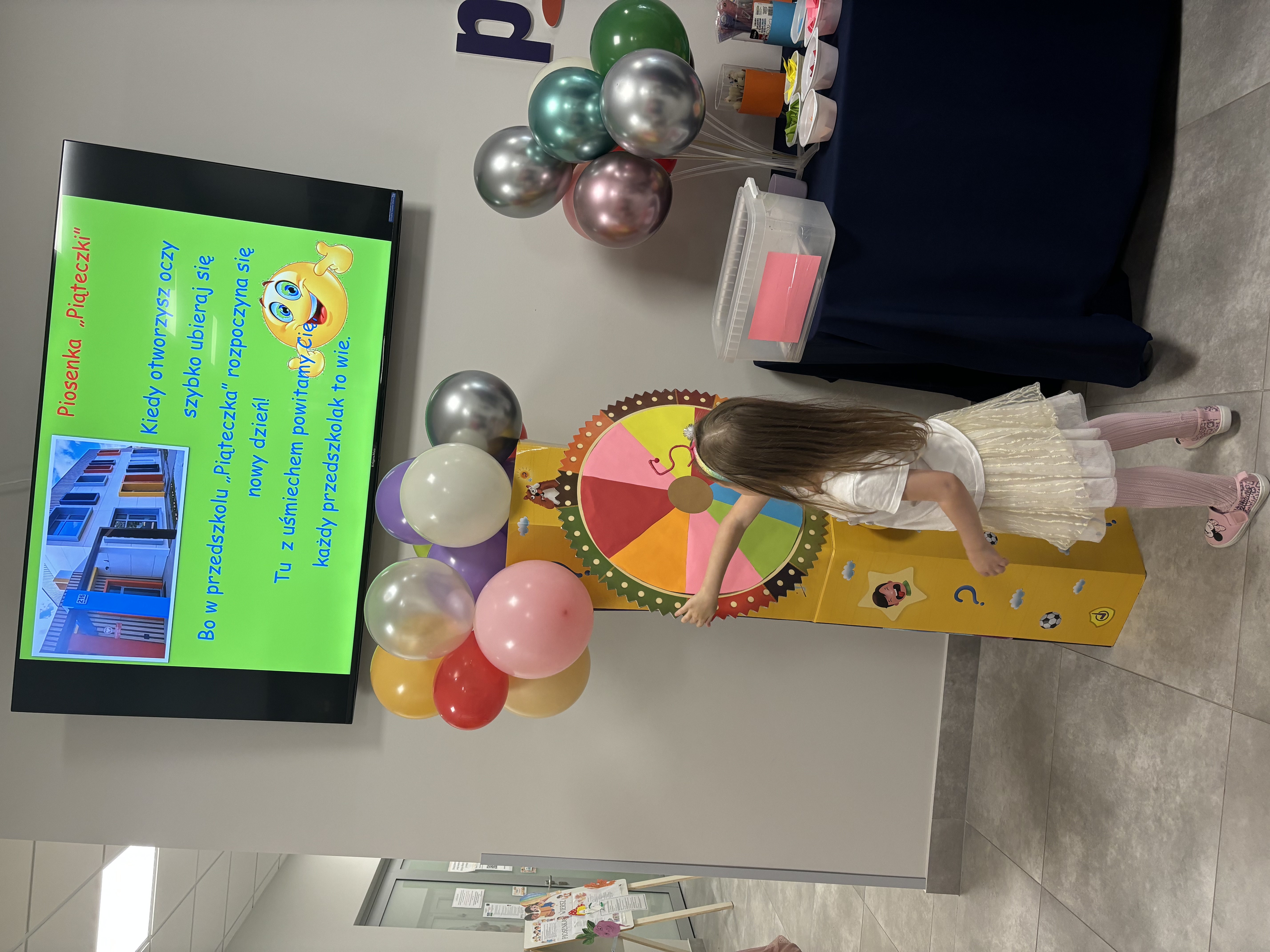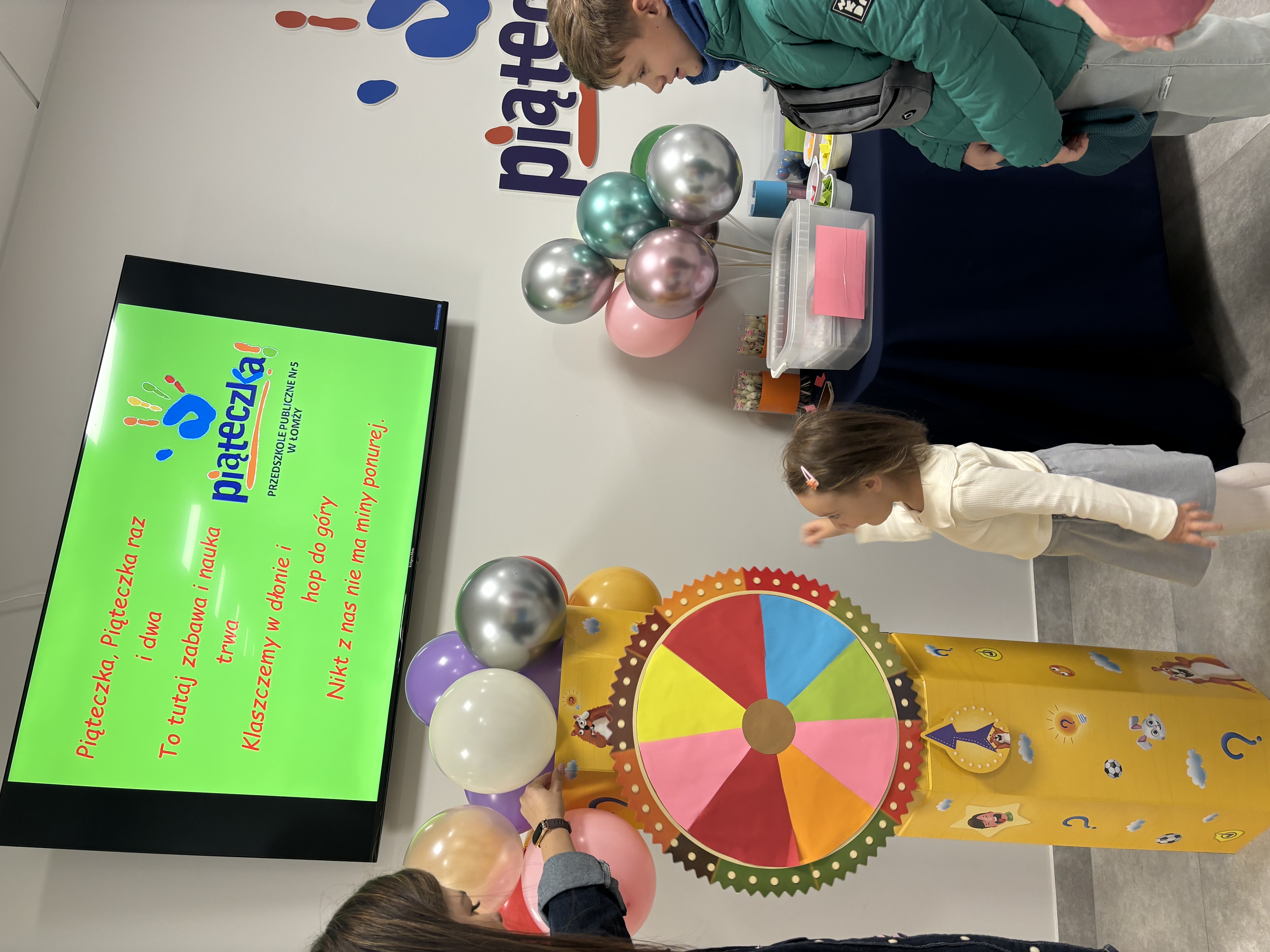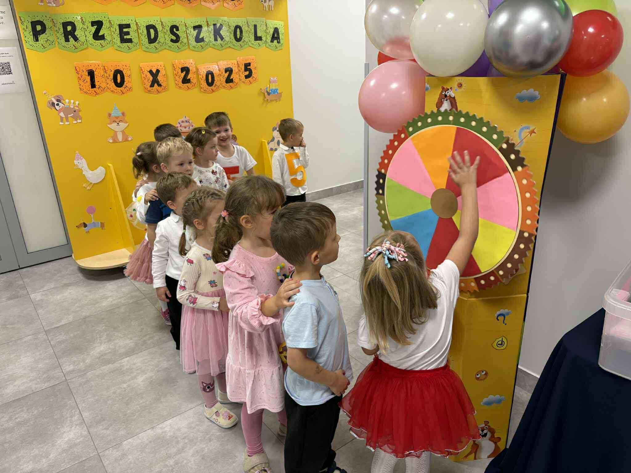 10 października to wyjątkowa data dla naszej placówki, gdyż tego dnia obchodzimy rocznicę otwarcia nowego budynku przedszkola. Z tej okazji od samego rana na wszystkie dzieci ubrane w imprezowe stroje z elementami „Piąteczki” czekało mnóstwo atrakcji. Przedszkolaki miały możliwość wykonania zdjęcia w fotobudce, brały udział w loterii oraz zabawie tanecznej. Urodzinowe przyjęcie rozpoczęła Pani Dyrektor, która przywitała dzieci