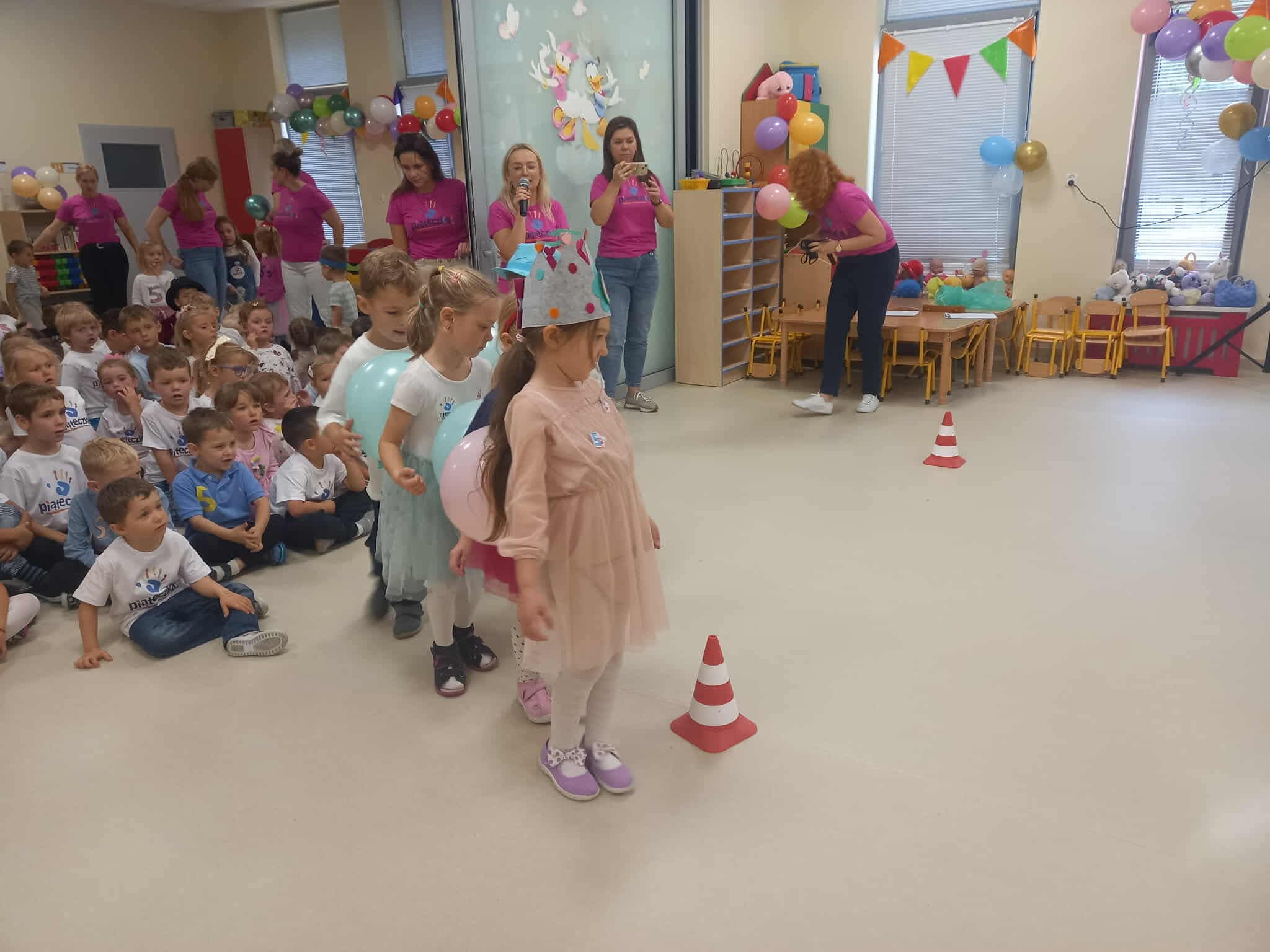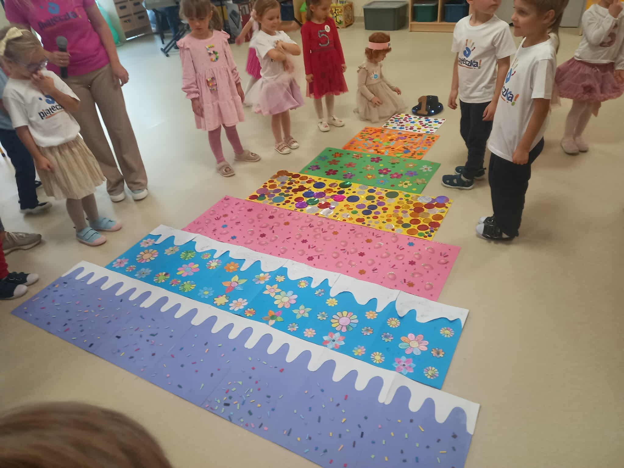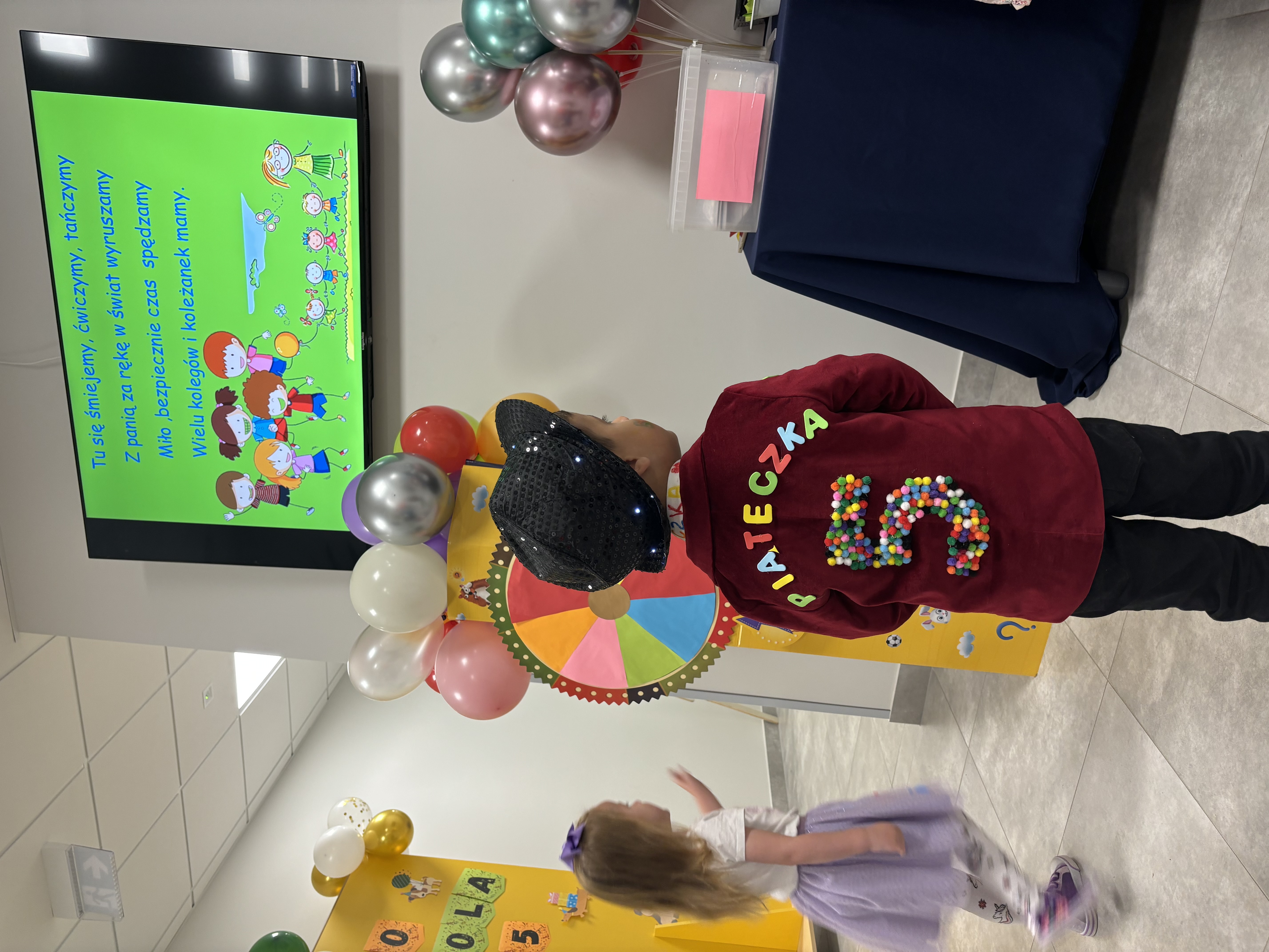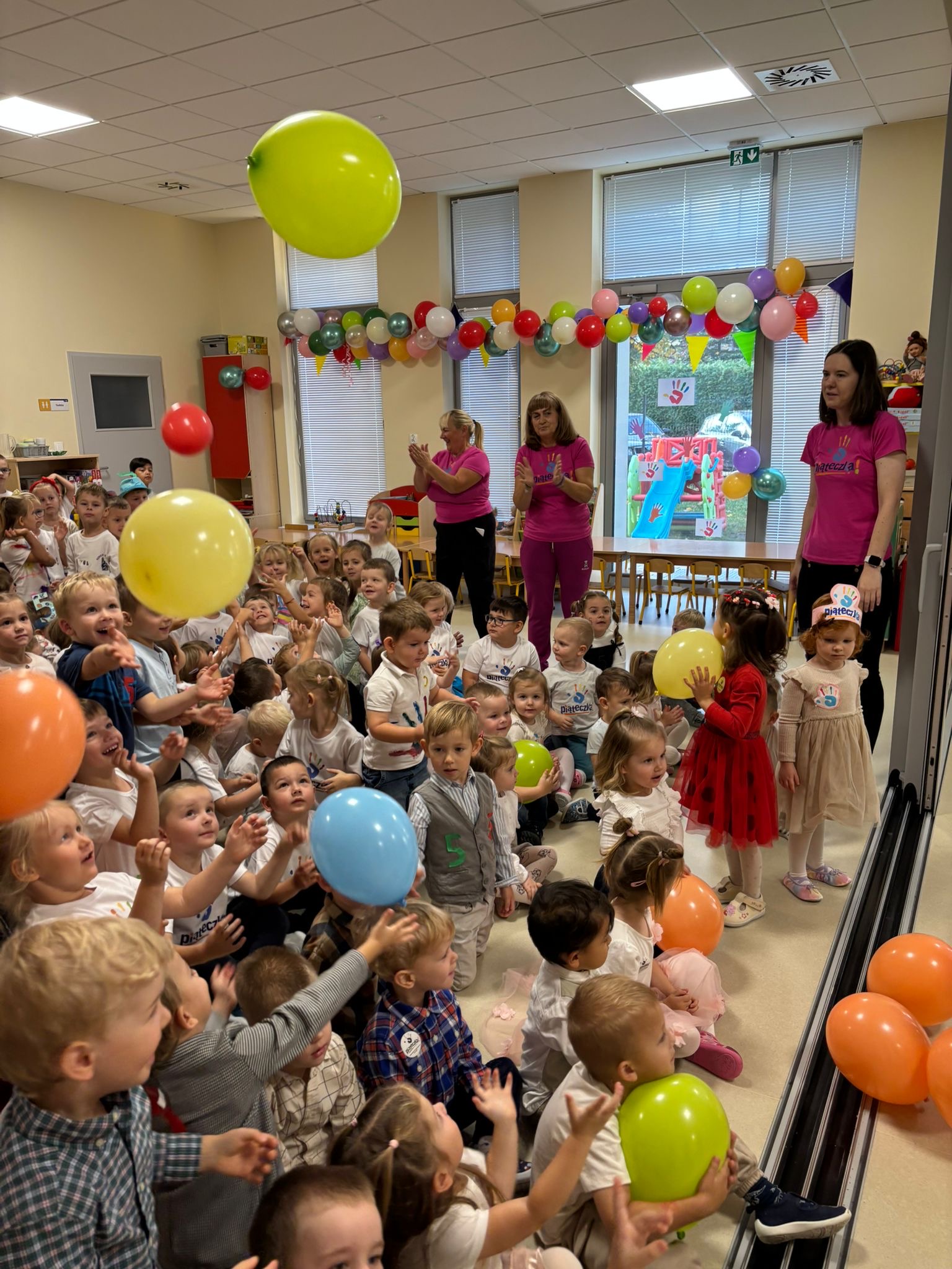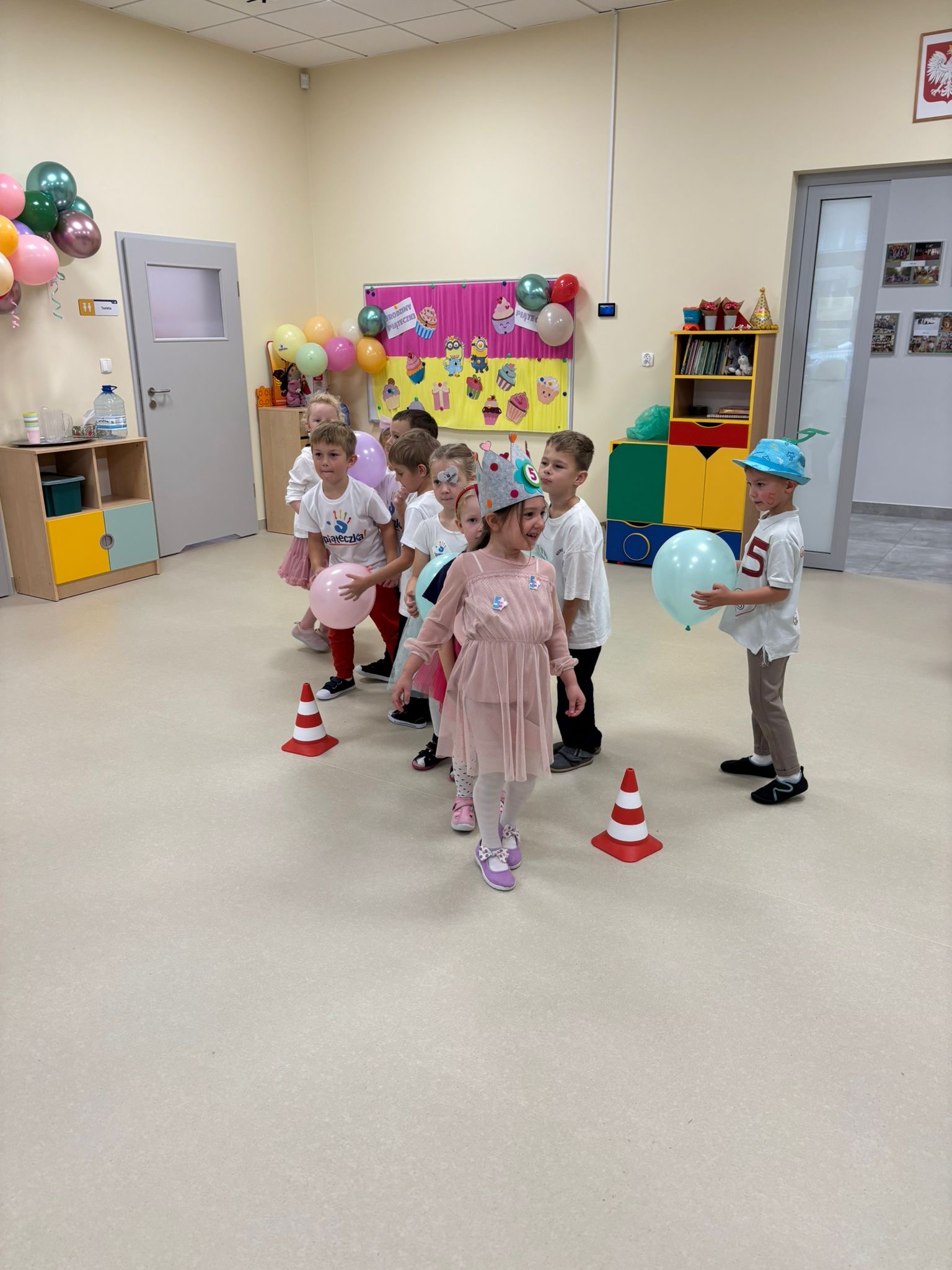 i otworzyła prezent – pudełko pełne kolorowych balonów. Następnie przedszkolaki uczestniczyły w różnorodnych konkursach oraz tańcach, a także układały tort z własnoręcznie ozdobionych arkuszy papieru. Na zakończenie każde dziecko otrzymało balonik. To był dzień pełen wrażeń i wspaniałej zabawy. Dzisiejsza uroczystość na długo pozostanie w naszej pamięci.