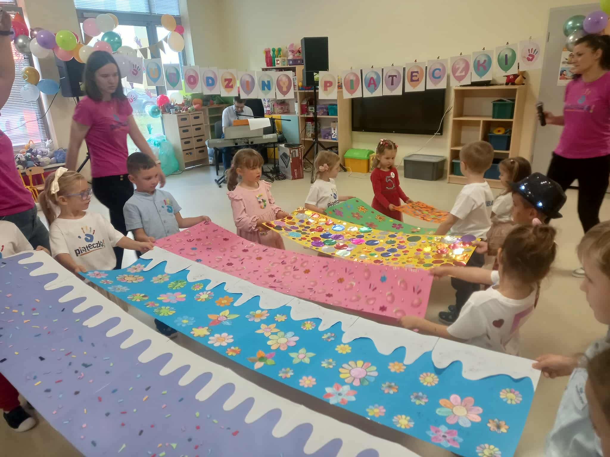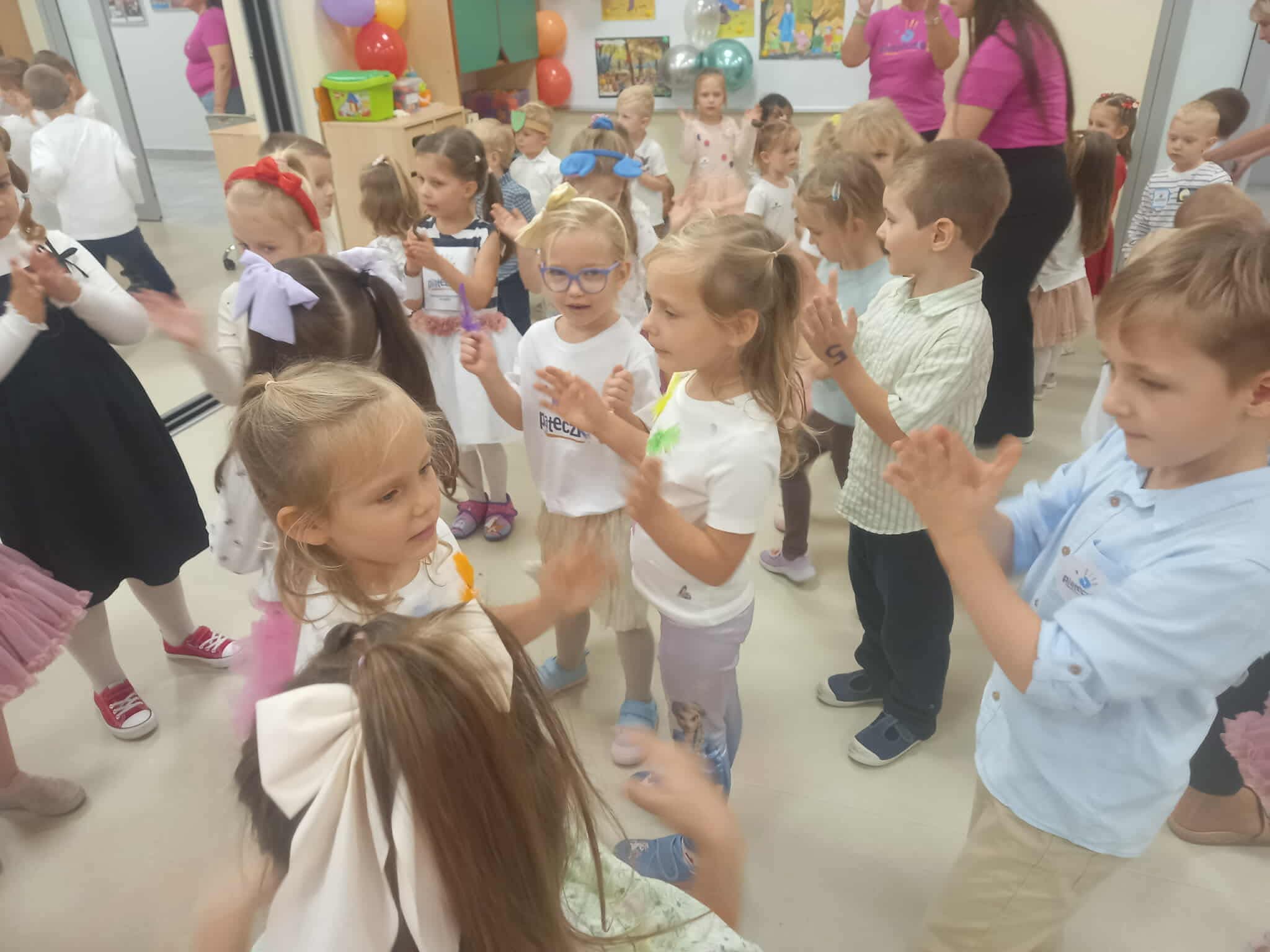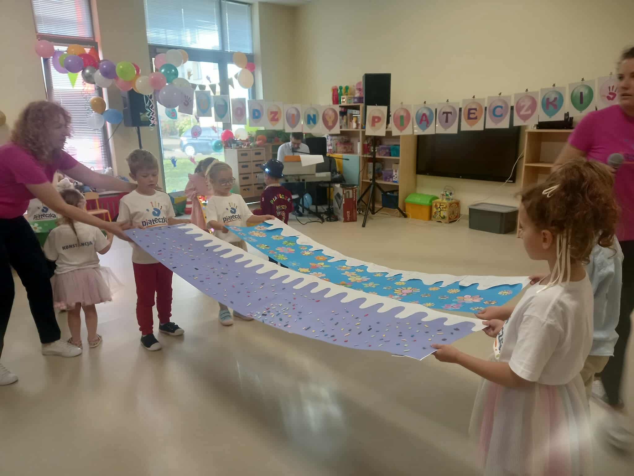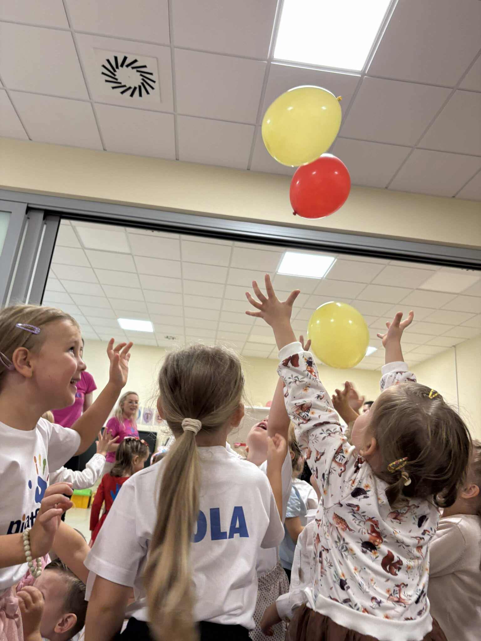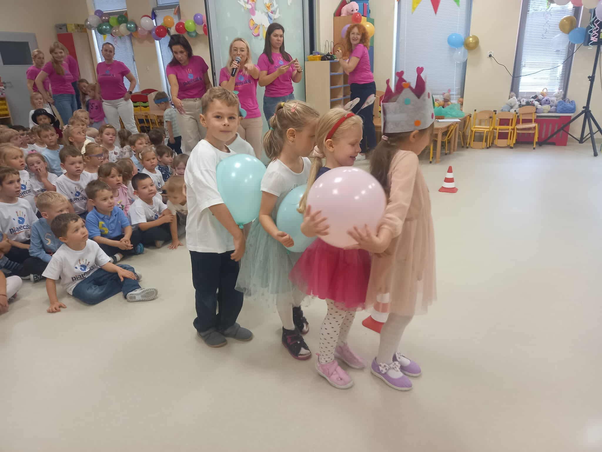 i otworzyła prezent – pudełko pełne kolorowych balonów. Następnie przedszkolaki uczestniczyły w różnorodnych konkursach oraz tańcach, a także układały tort z własnoręcznie ozdobionych arkuszy papieru. Na zakończenie każde dziecko otrzymało balonik. To był dzień pełen wrażeń i wspaniałej zabawy. Dzisiejsza uroczystość na długo pozostanie w naszej pamięci.