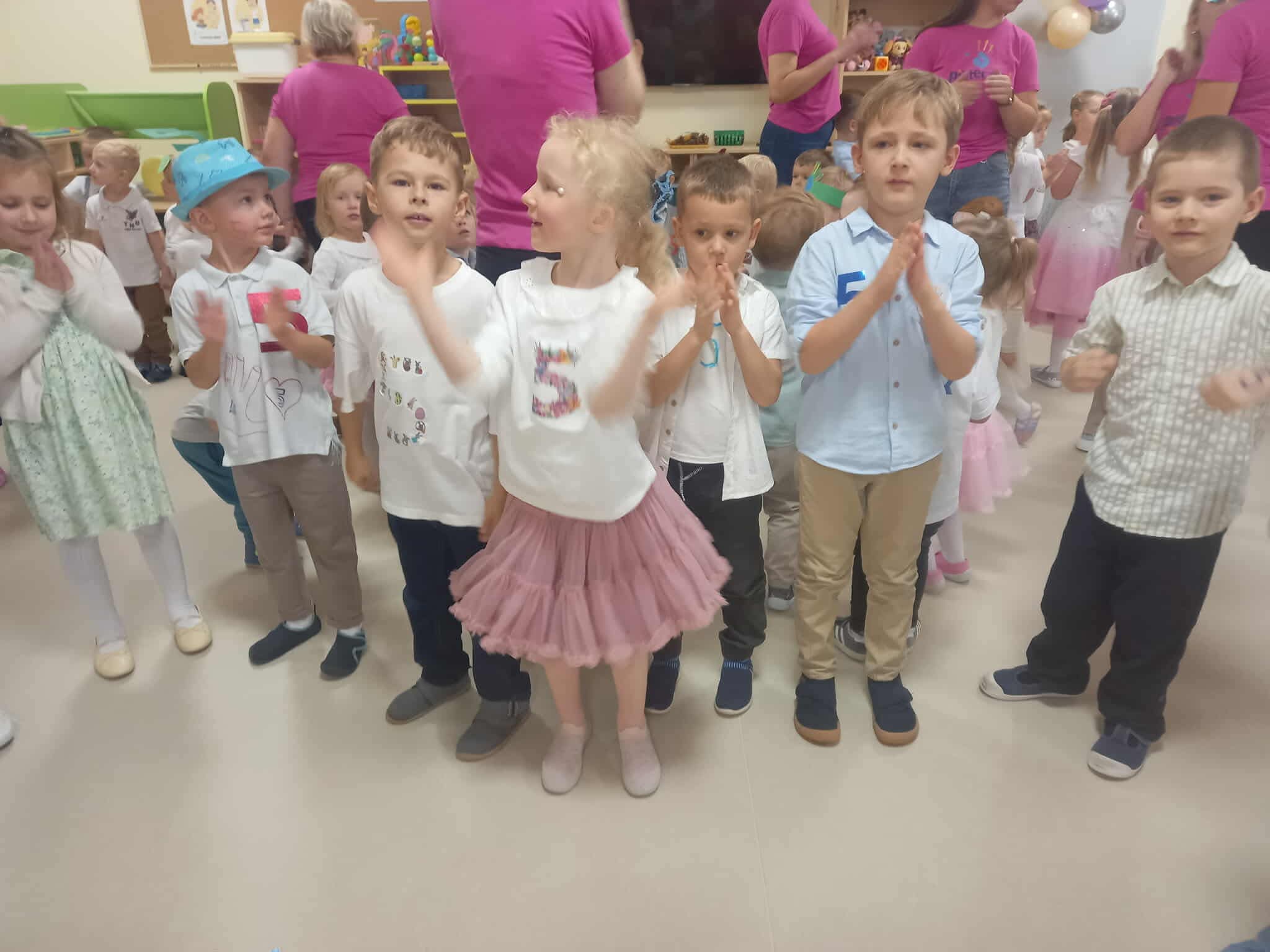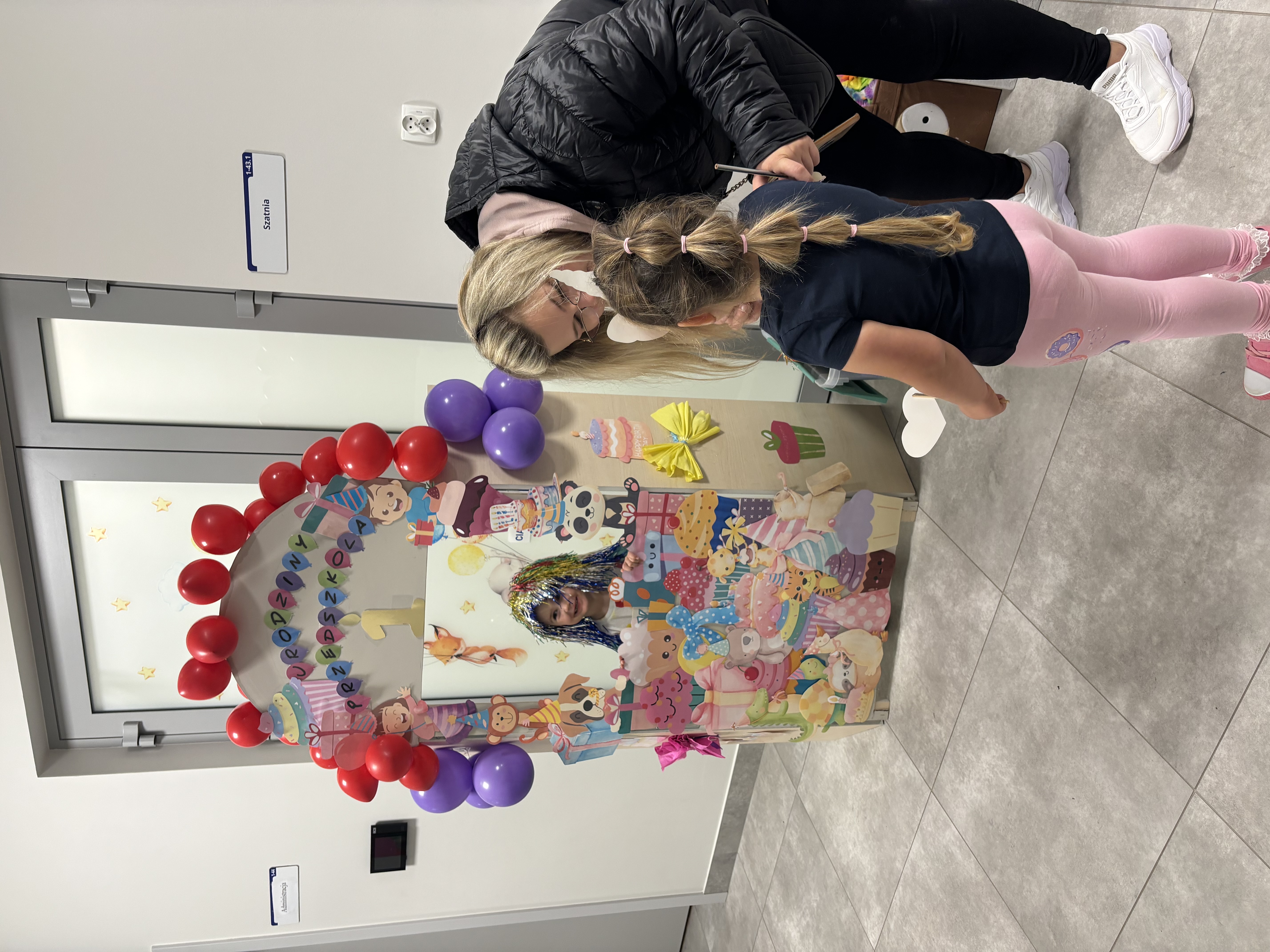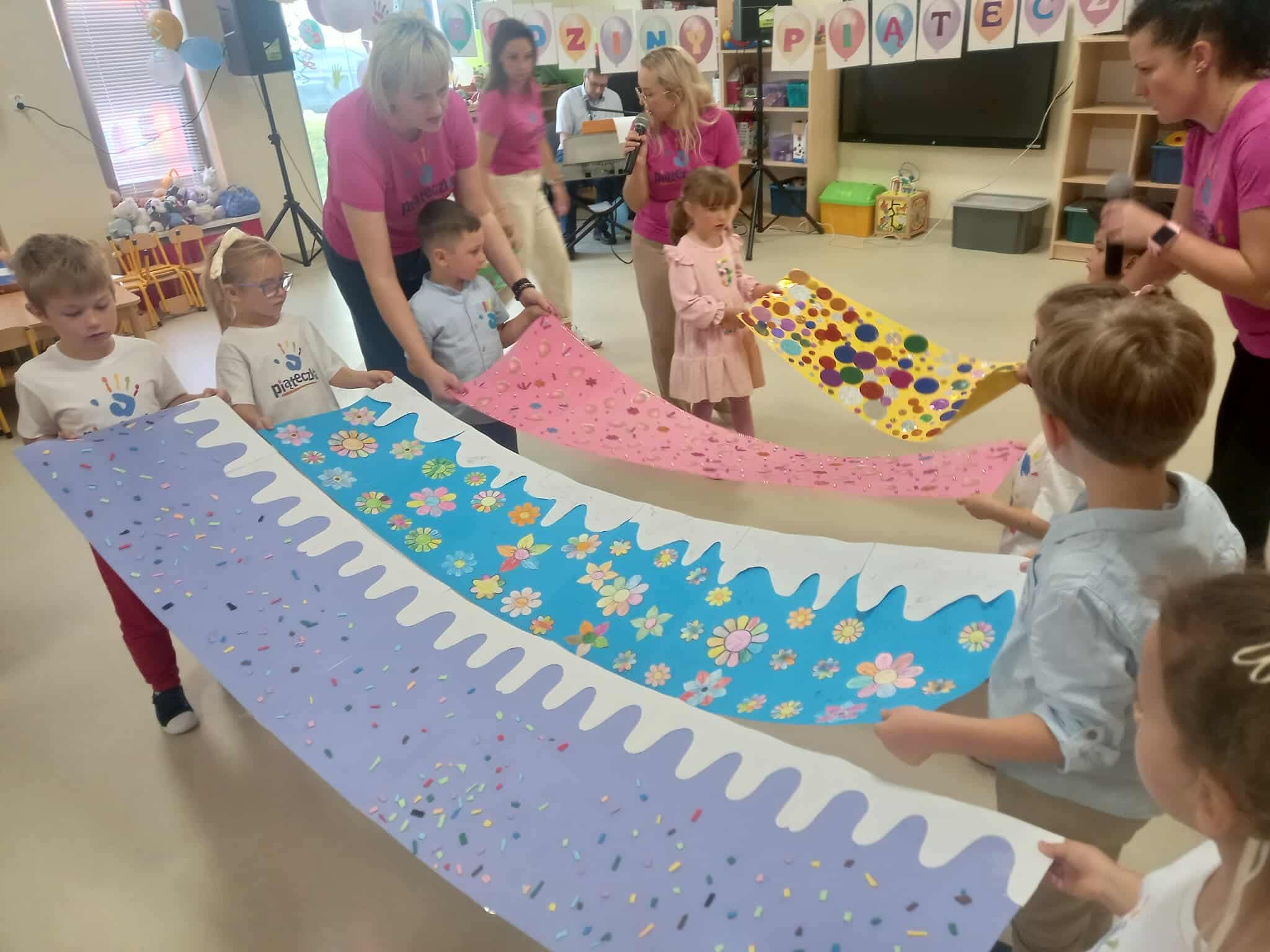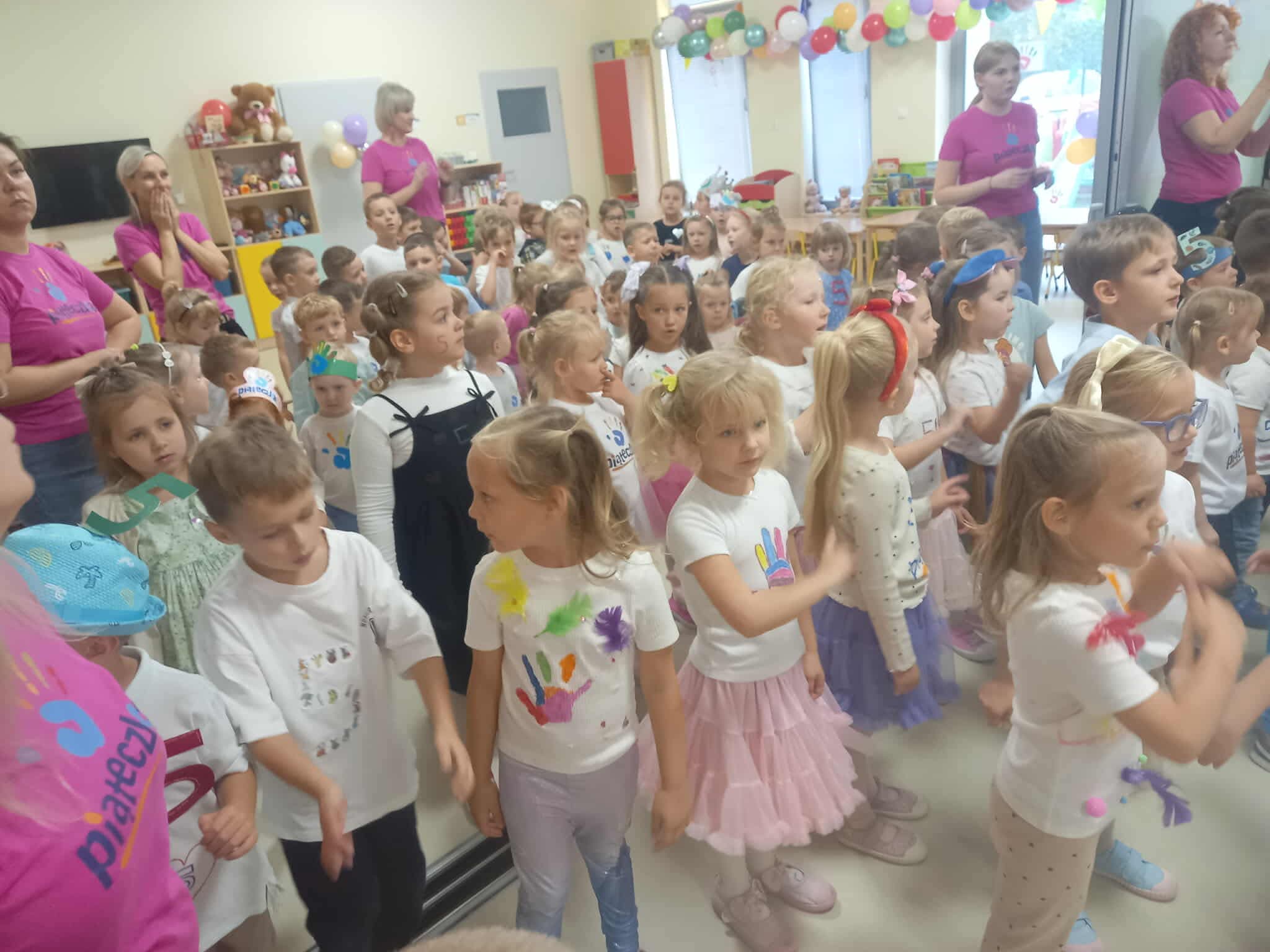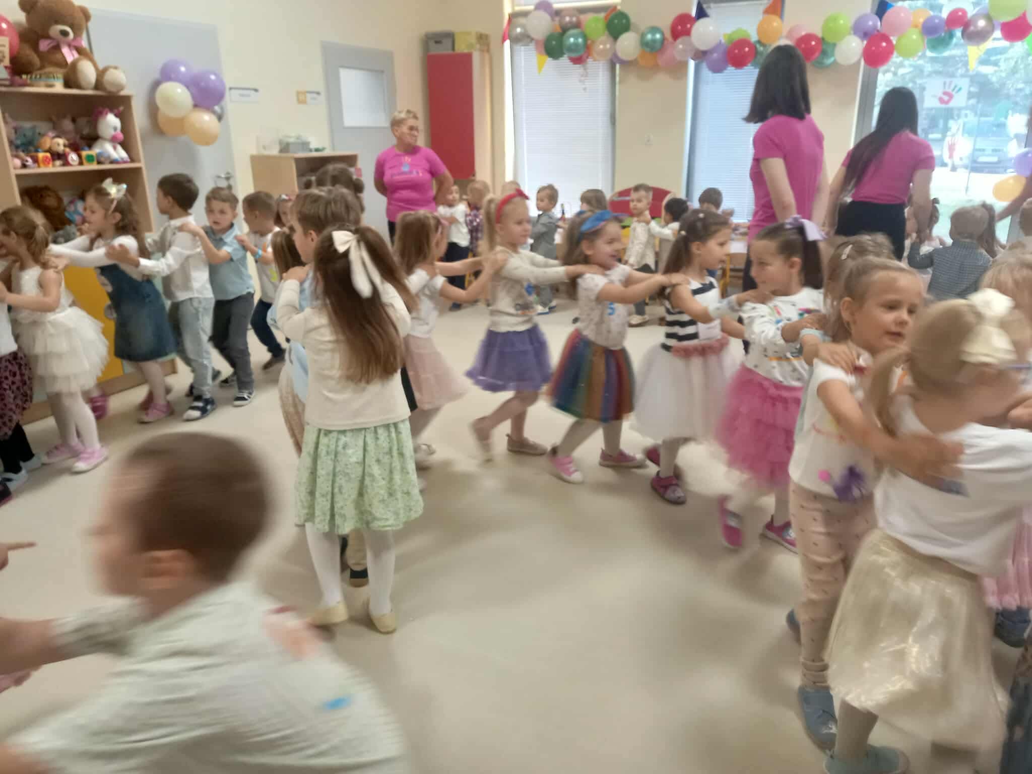 i otworzyła prezent – pudełko pełne kolorowych balonów. Następnie przedszkolaki uczestniczyły w różnorodnych konkursach oraz tańcach, a także układały tort z własnoręcznie ozdobionych arkuszy papieru. Na zakończenie każde dziecko otrzymało balonik. To był dzień pełen wrażeń i wspaniałej zabawy. Dzisiejsza uroczystość na długo pozostanie w naszej pamięci.