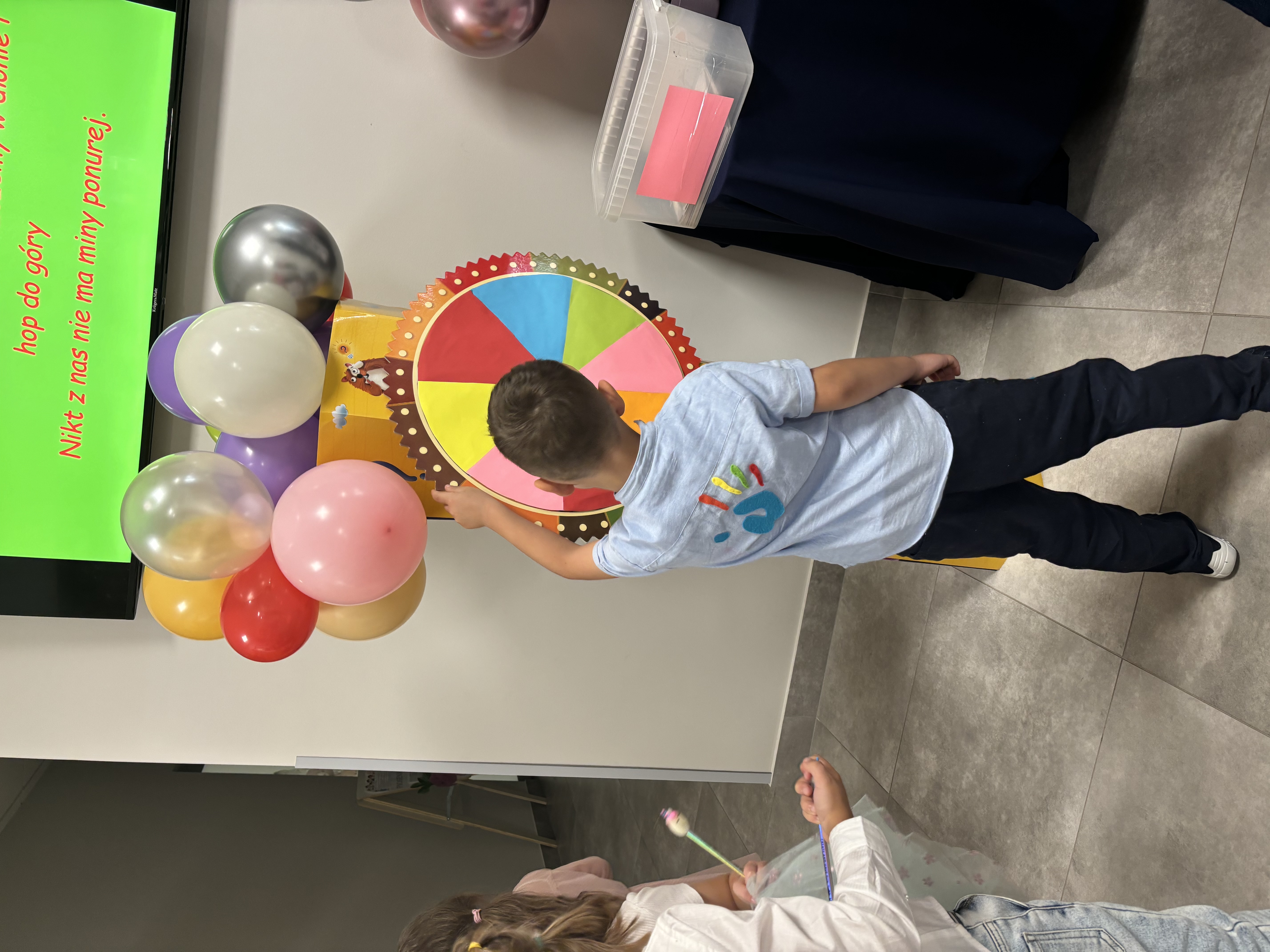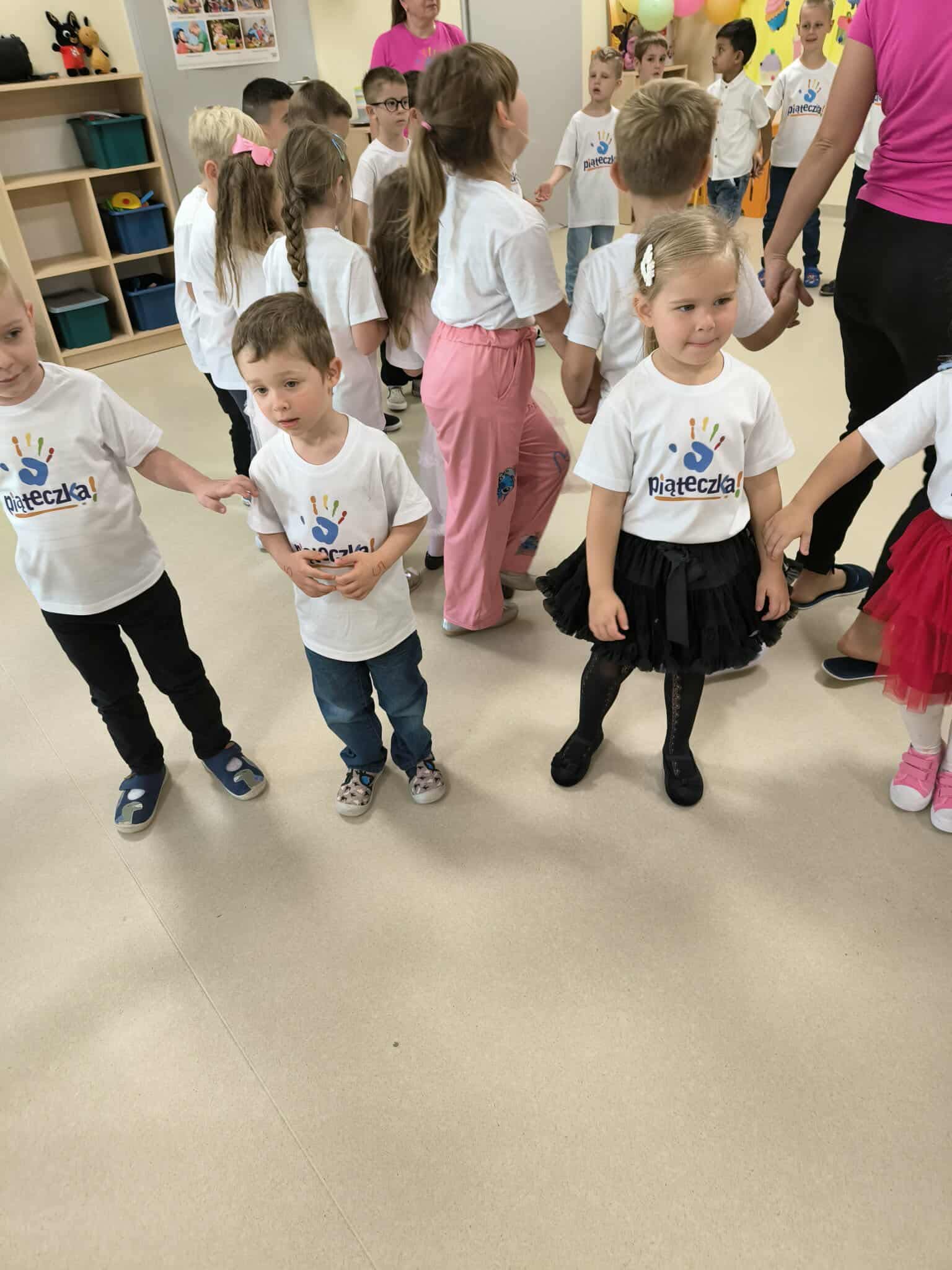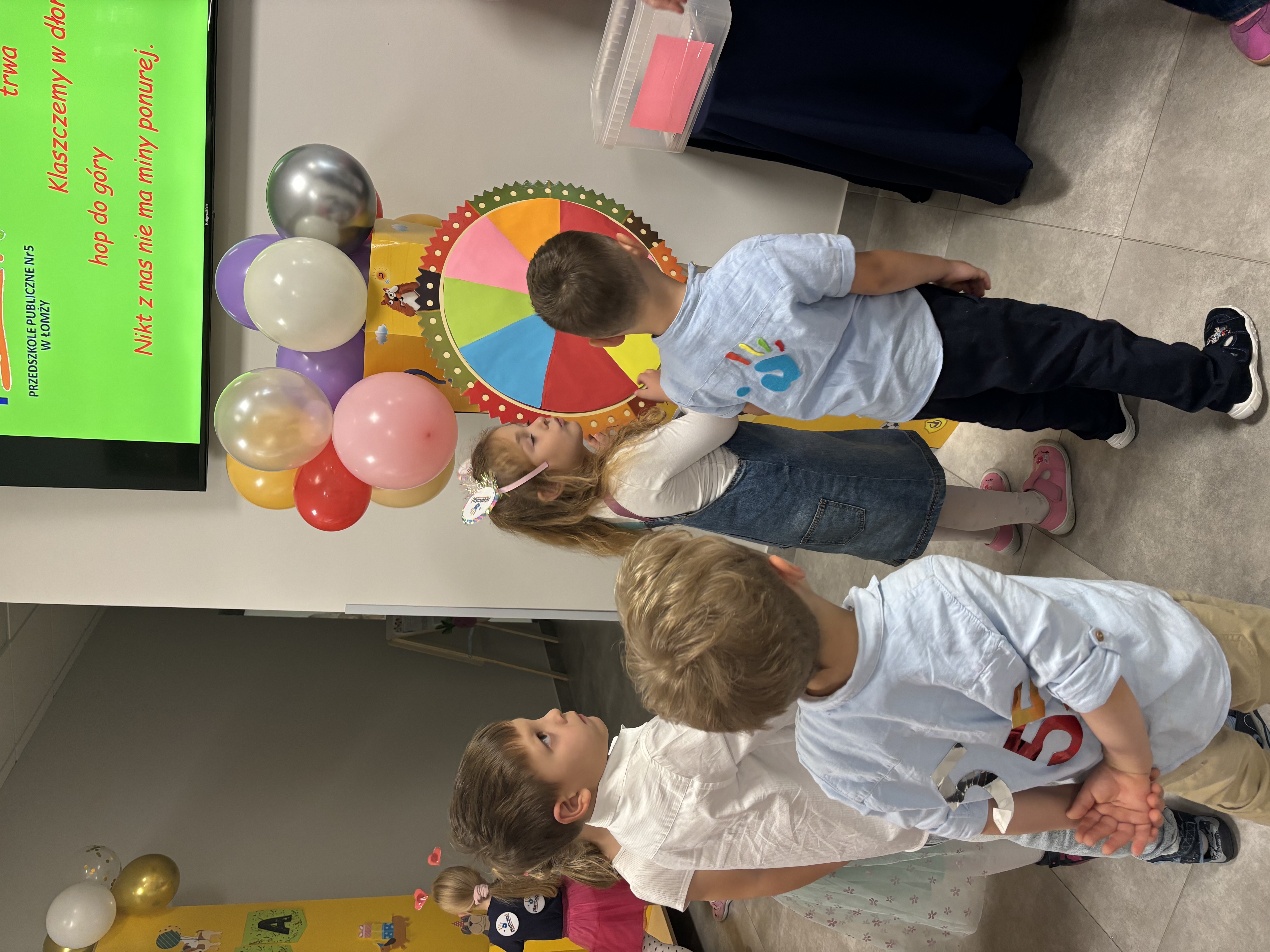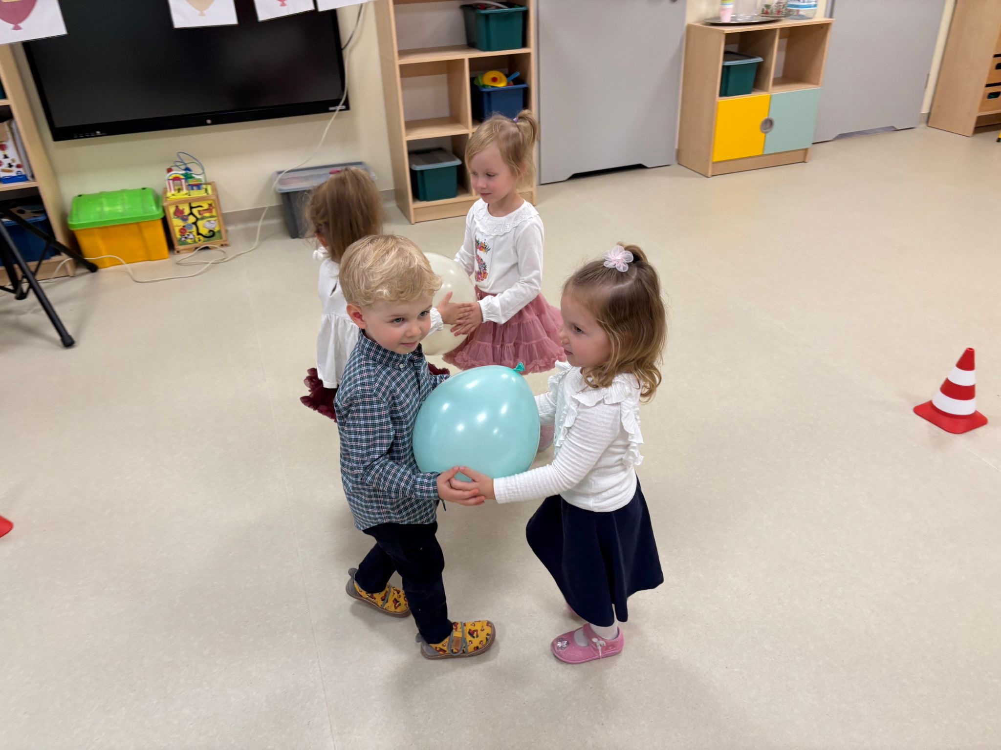 i otworzyła prezent – pudełko pełne kolorowych balonów. Następnie przedszkolaki uczestniczyły w różnorodnych konkursach oraz tańcach, a także układały tort z własnoręcznie ozdobionych arkuszy papieru. Na zakończenie każde dziecko otrzymało balonik. To był dzień pełen wrażeń i wspaniałej zabawy. Dzisiejsza uroczystość na długo pozostanie w naszej pamięci.