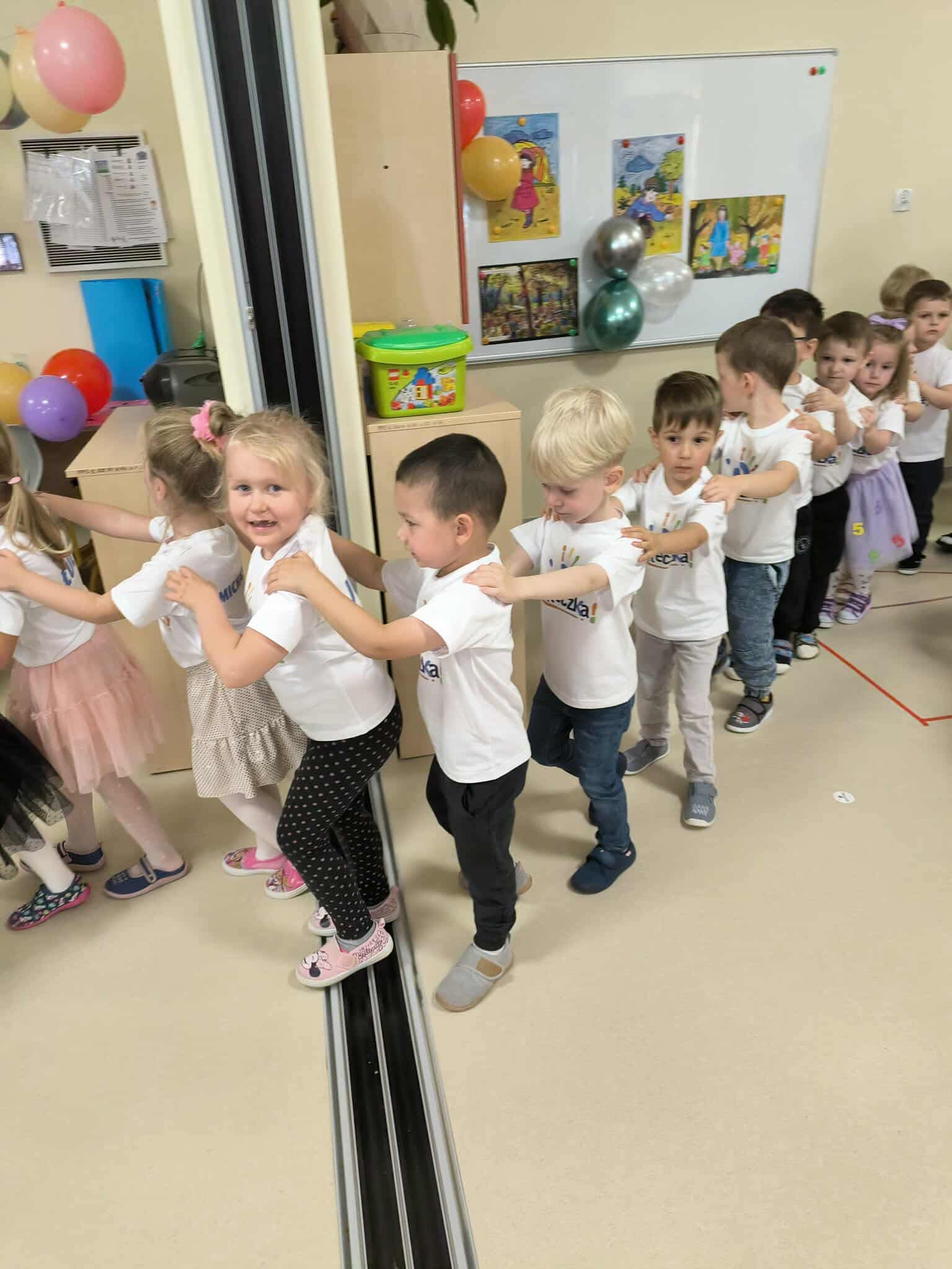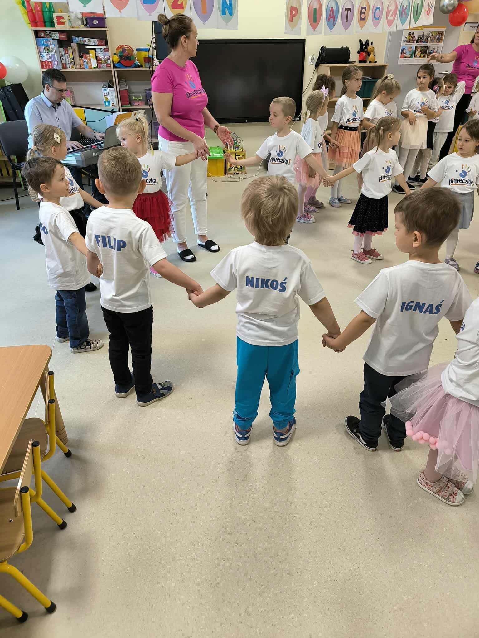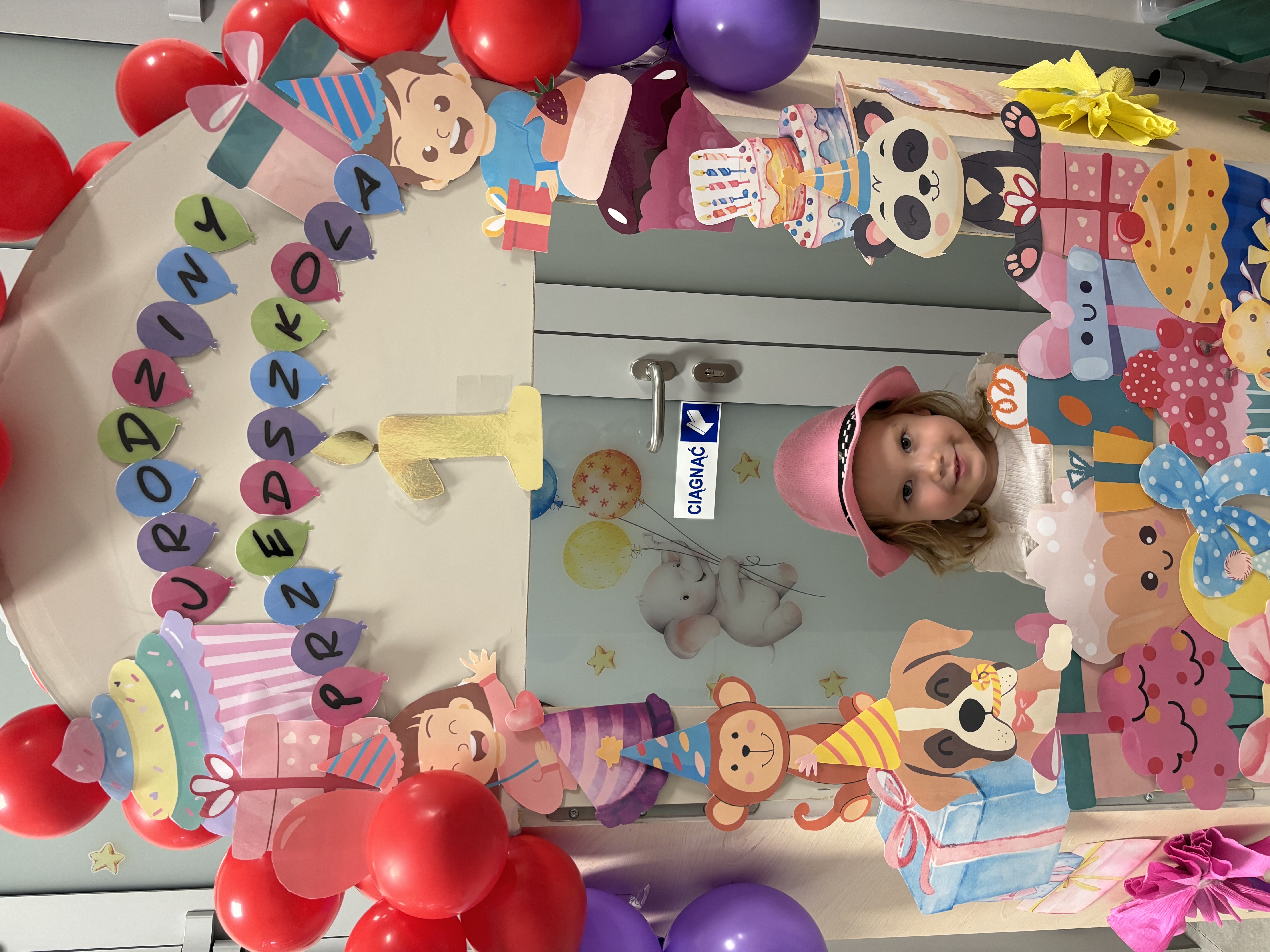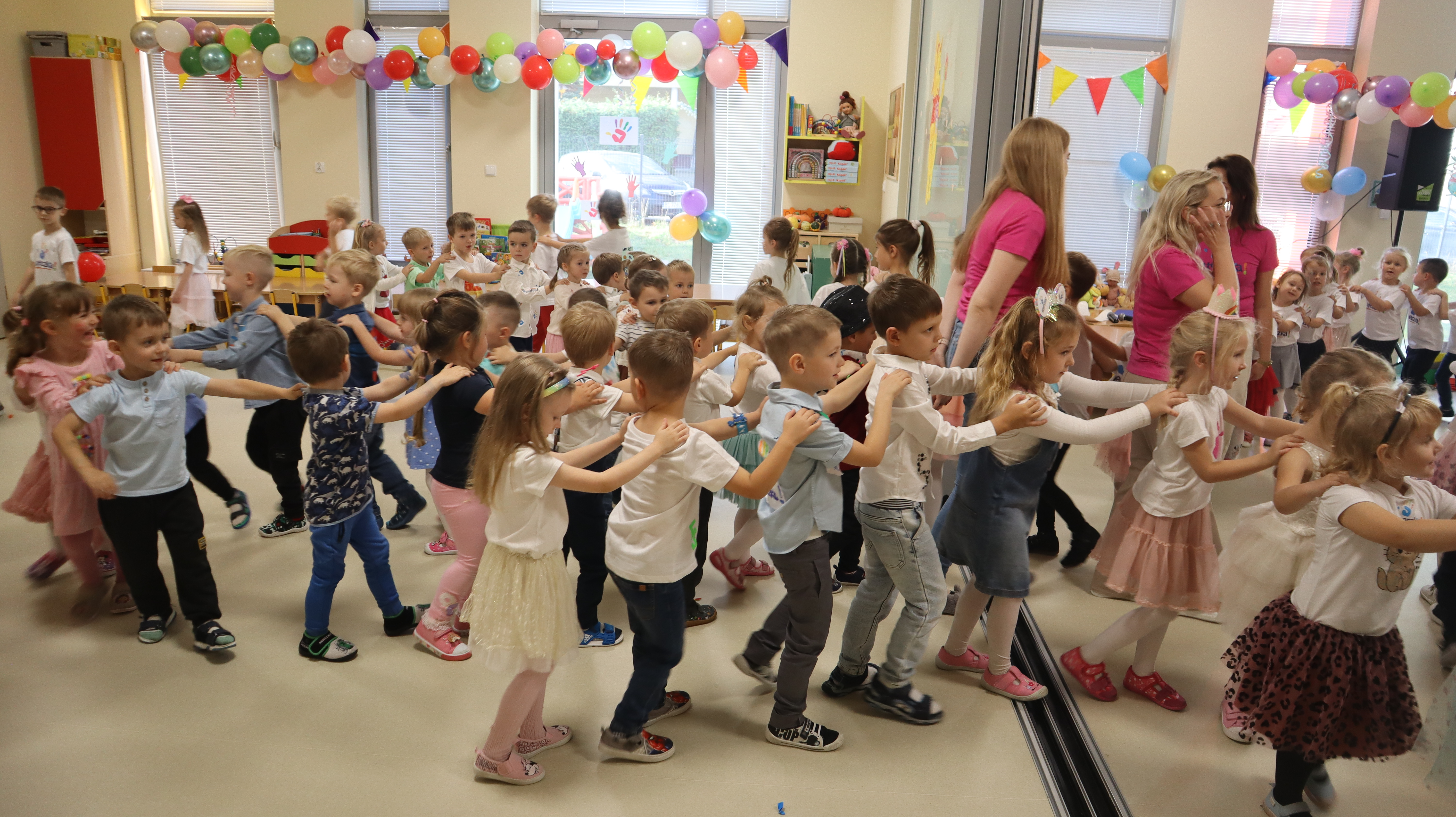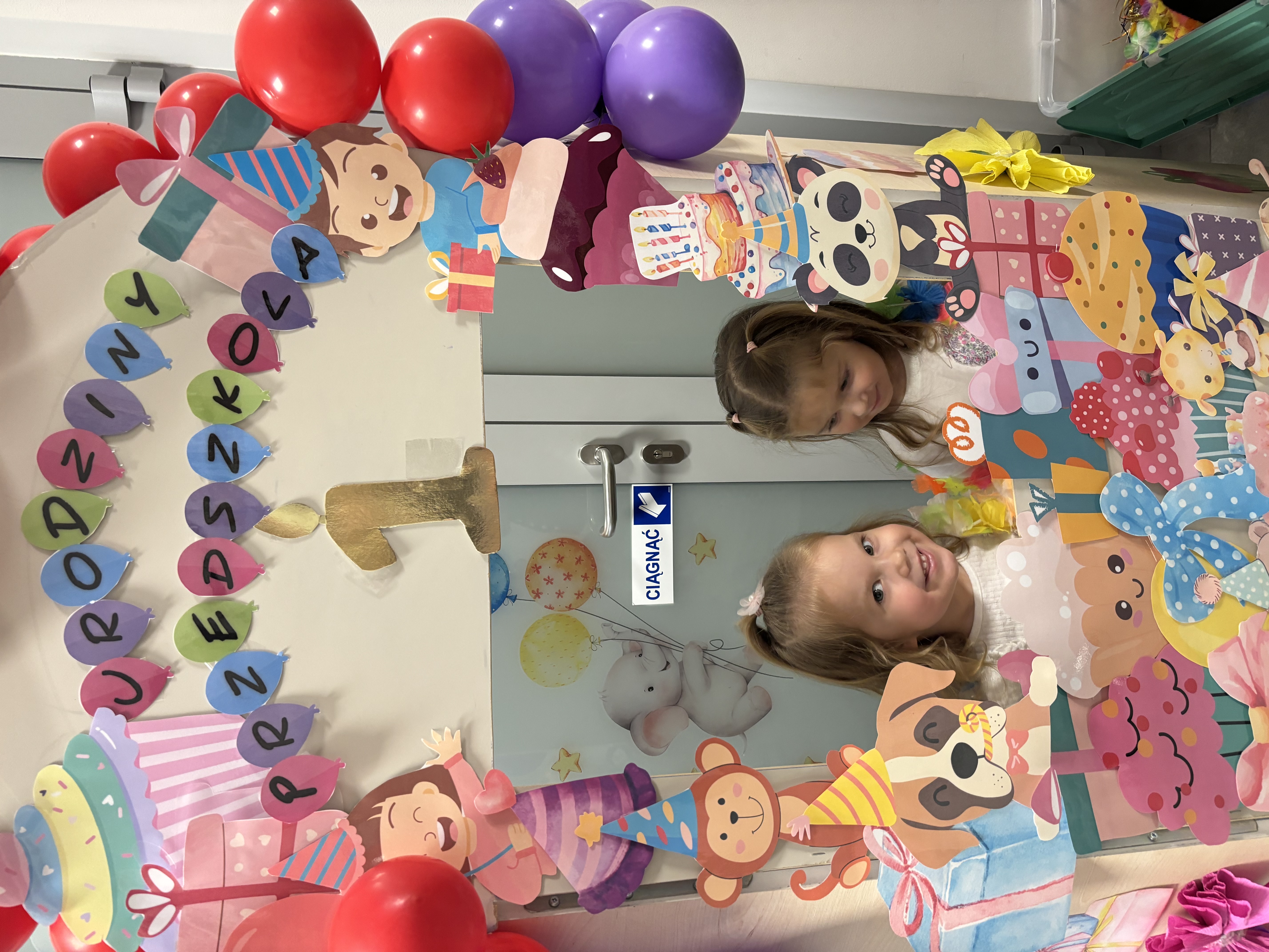 i otworzyła prezent – pudełko pełne kolorowych balonów. Następnie przedszkolaki uczestniczyły w różnorodnych konkursach oraz tańcach, a także układały tort z własnoręcznie ozdobionych arkuszy papieru. Na zakończenie każde dziecko otrzymało balonik. To był dzień pełen wrażeń i wspaniałej zabawy. Dzisiejsza uroczystość na długo pozostanie w naszej pamięci.