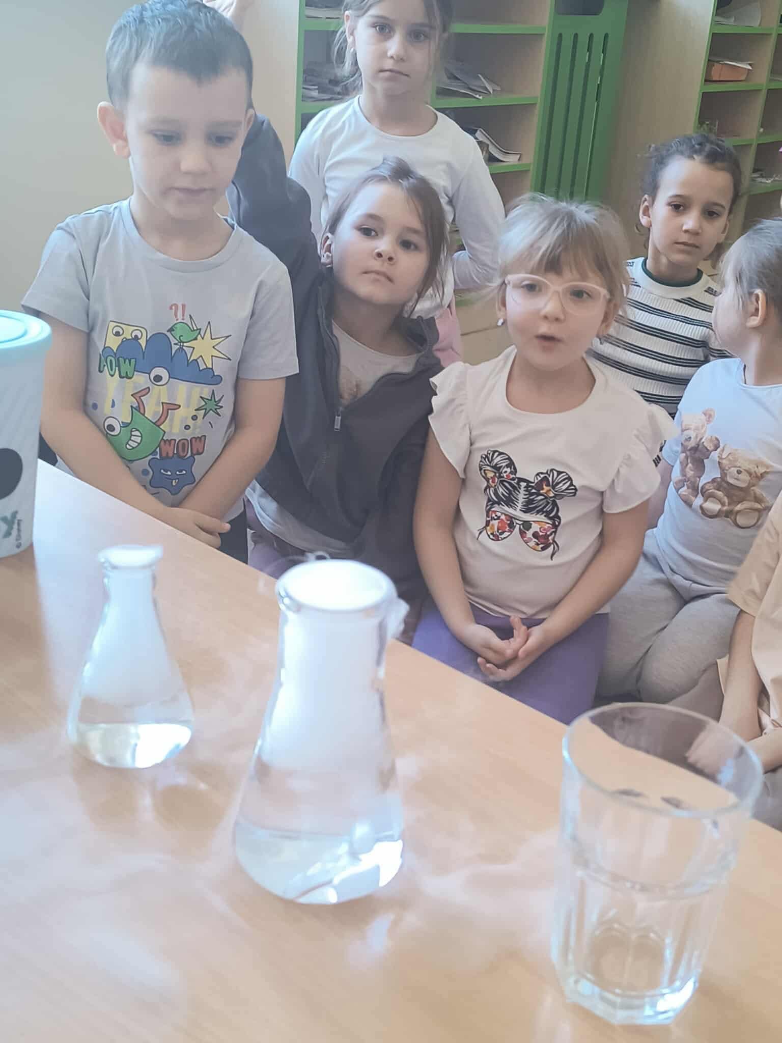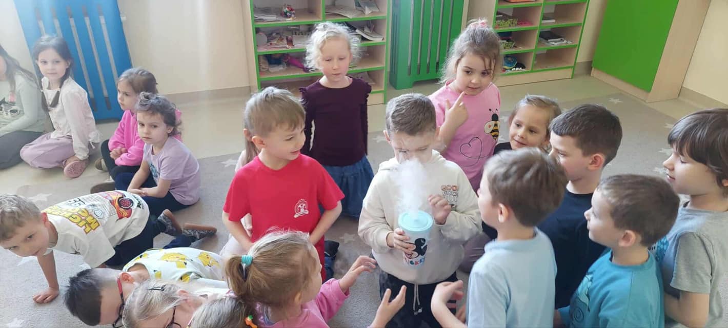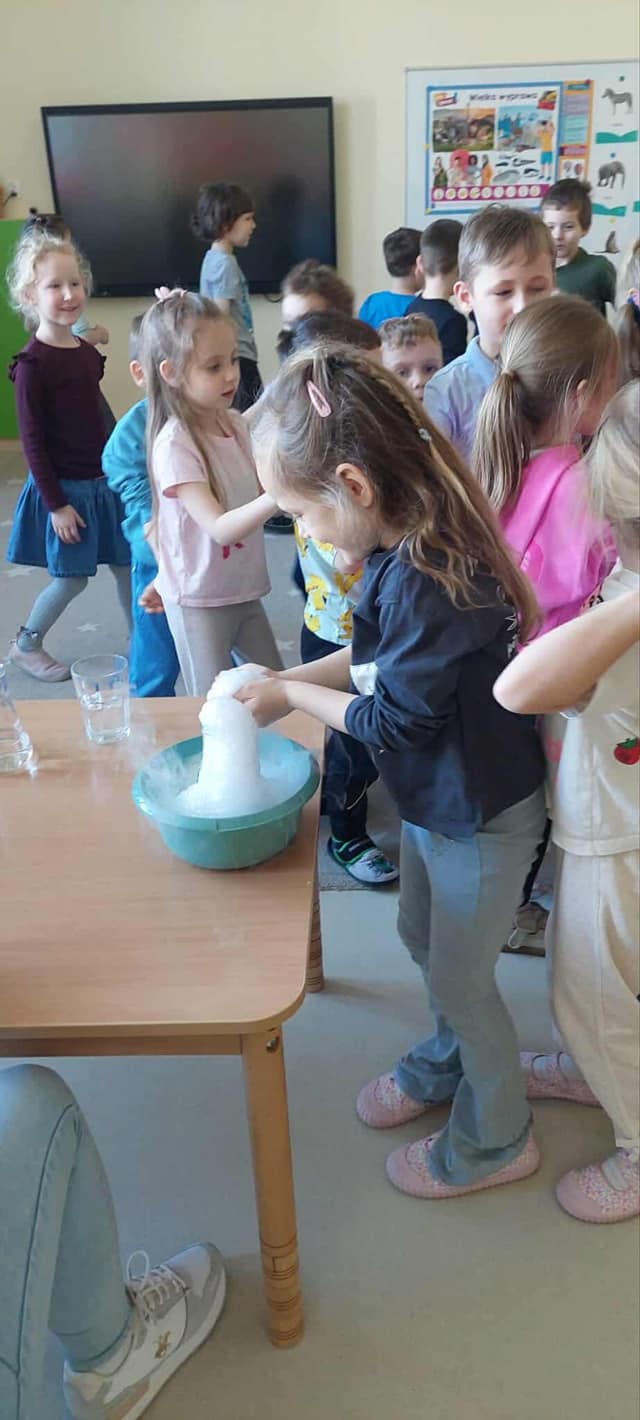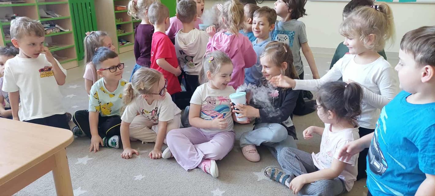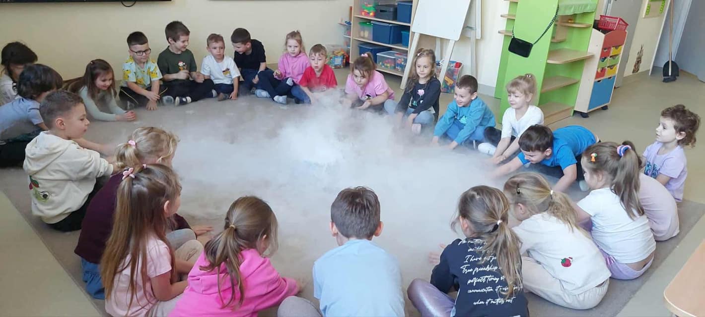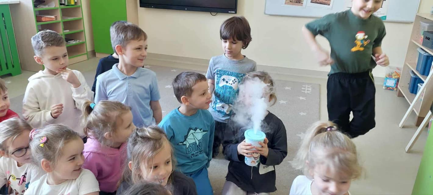 Dzieci miały okazję poznać reakcję suchego lodu z wodą, obserwowały białe obłoki oraz brały niezwykły „prysznic”.