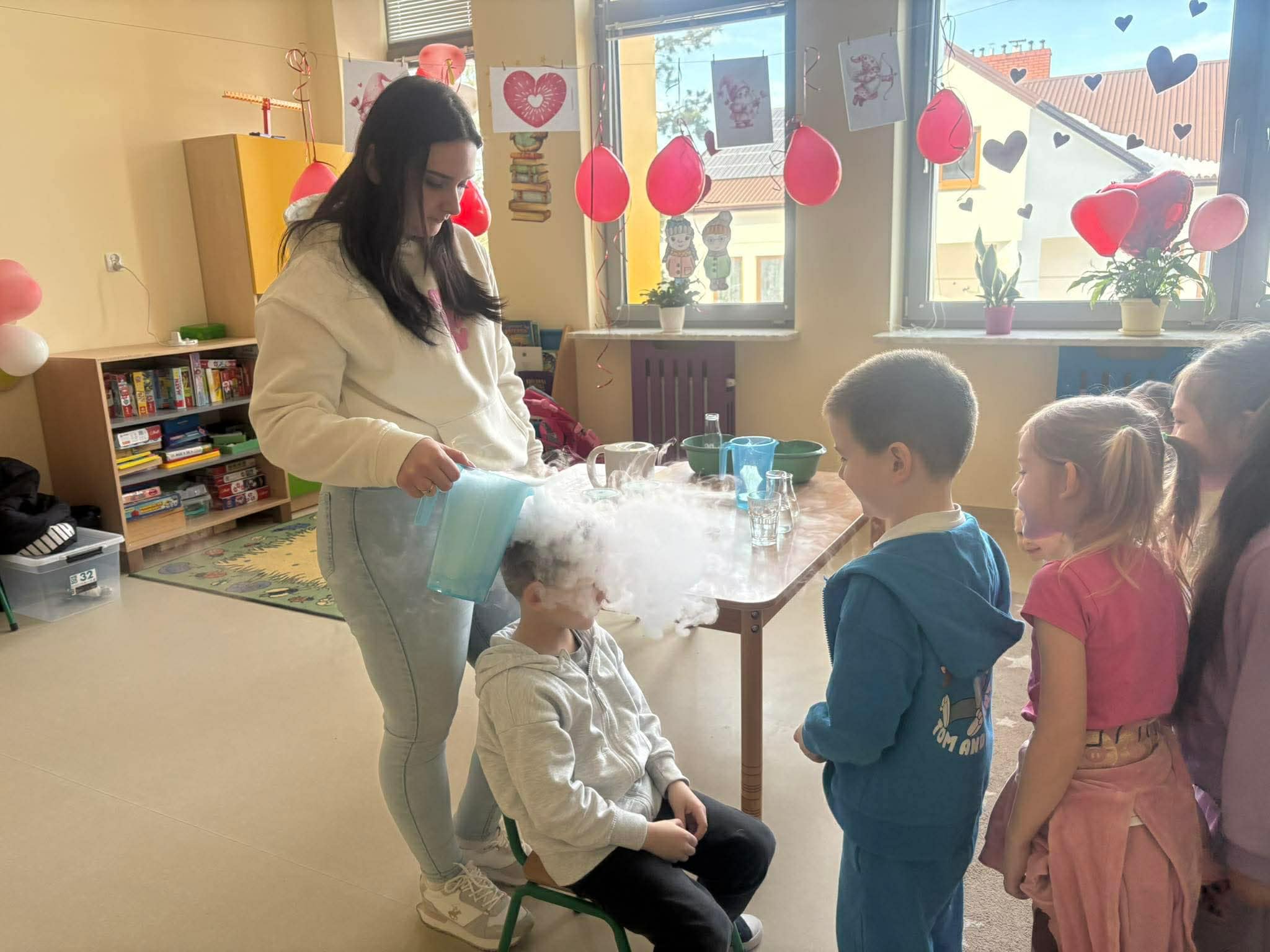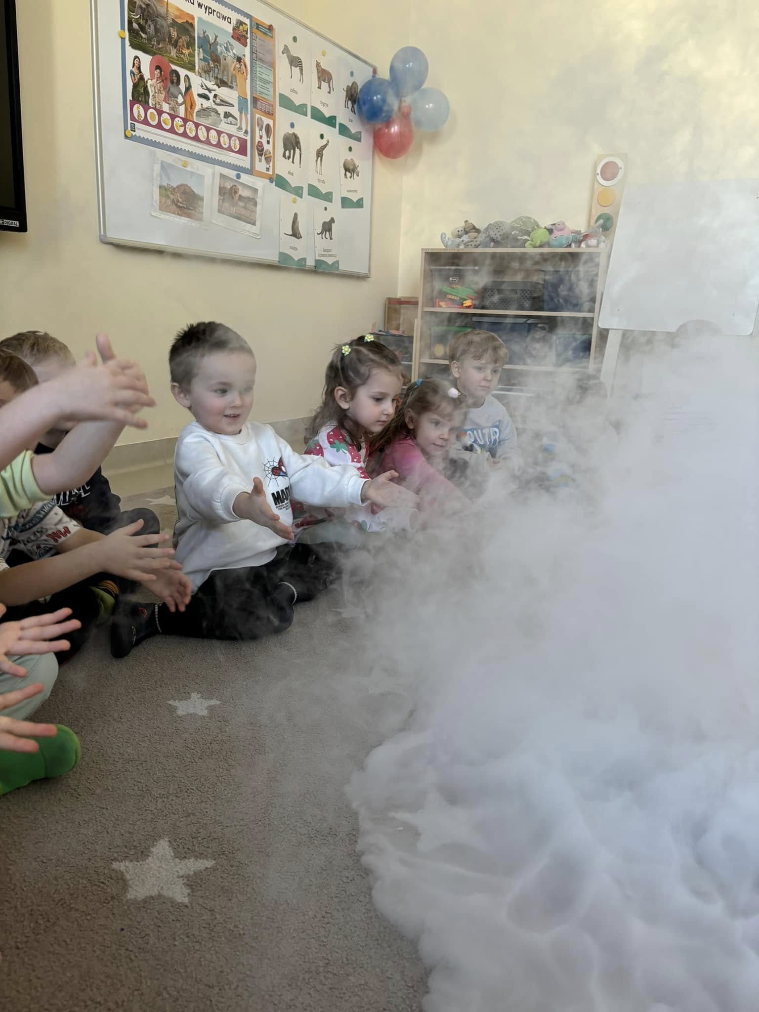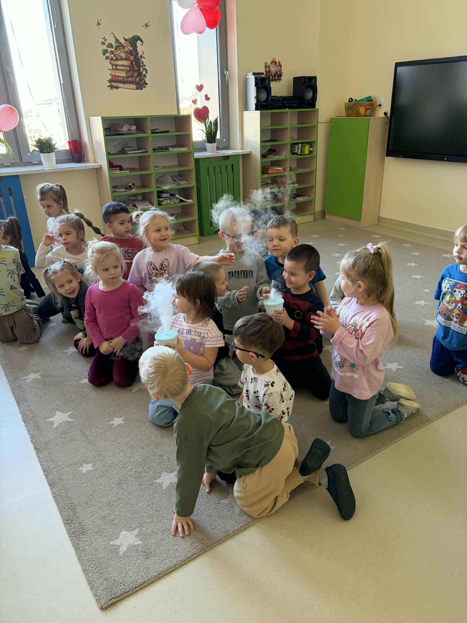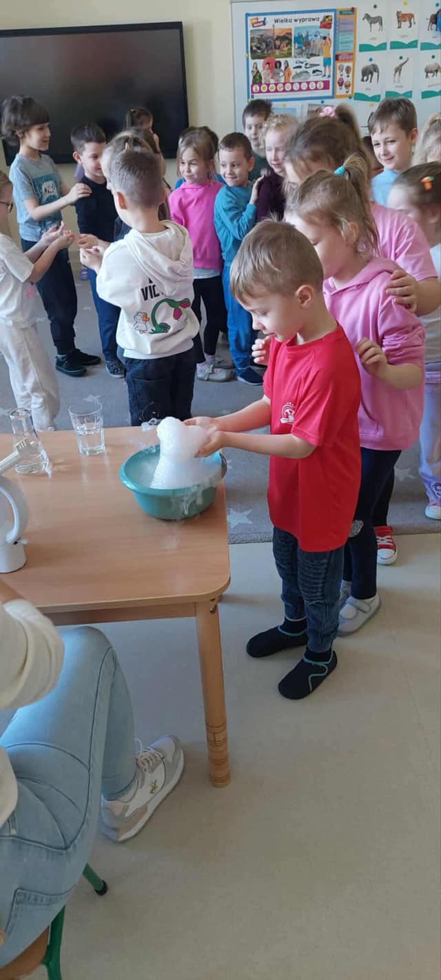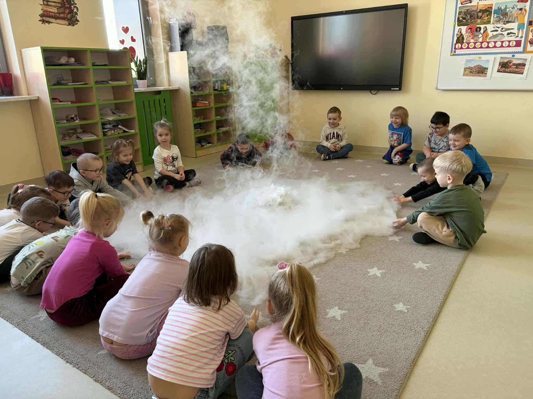 Dzieci miały okazję poznać reakcję suchego lodu z wodą, obserwowały białe obłoki oraz brały niezwykły „prysznic”.
