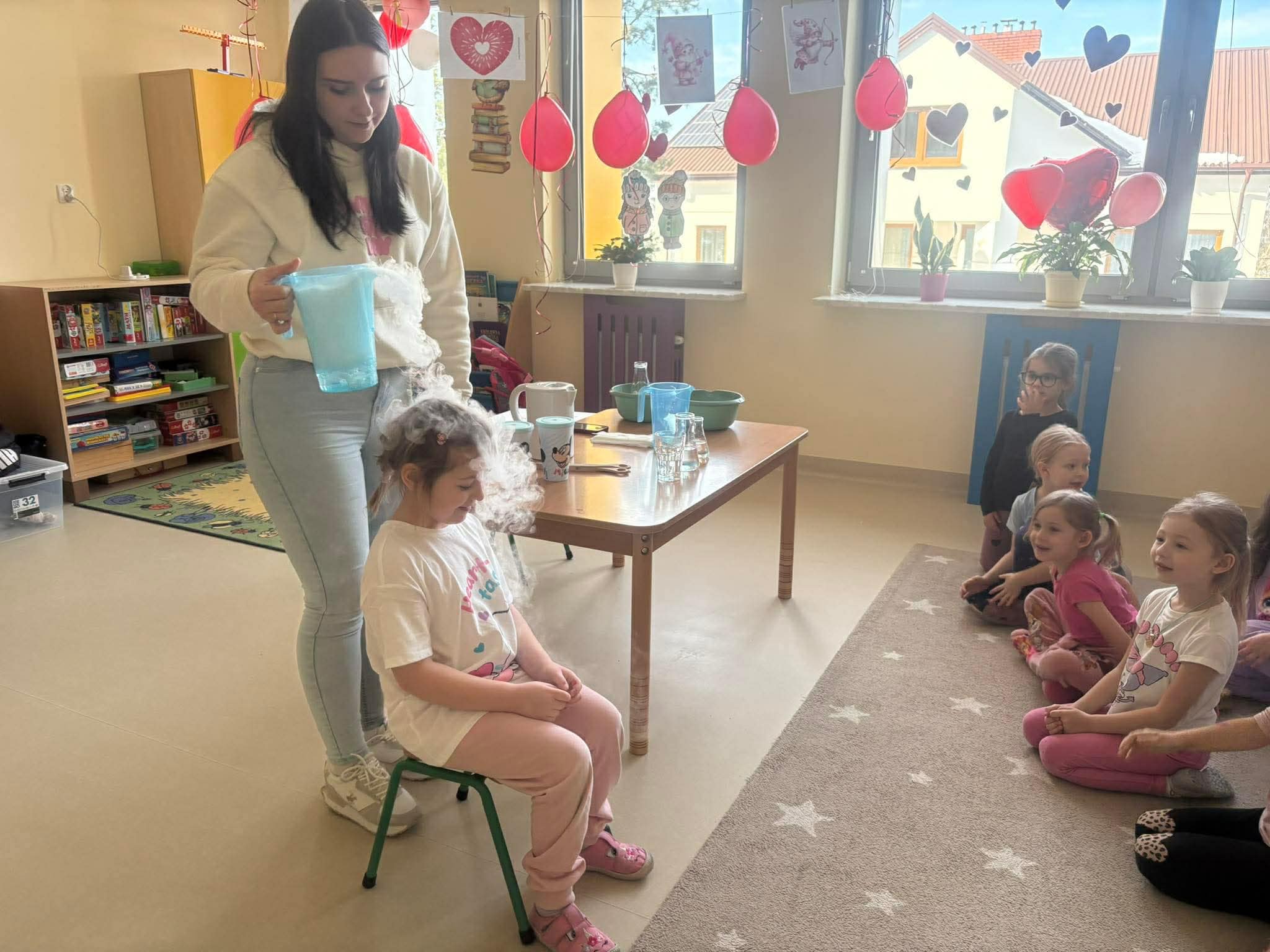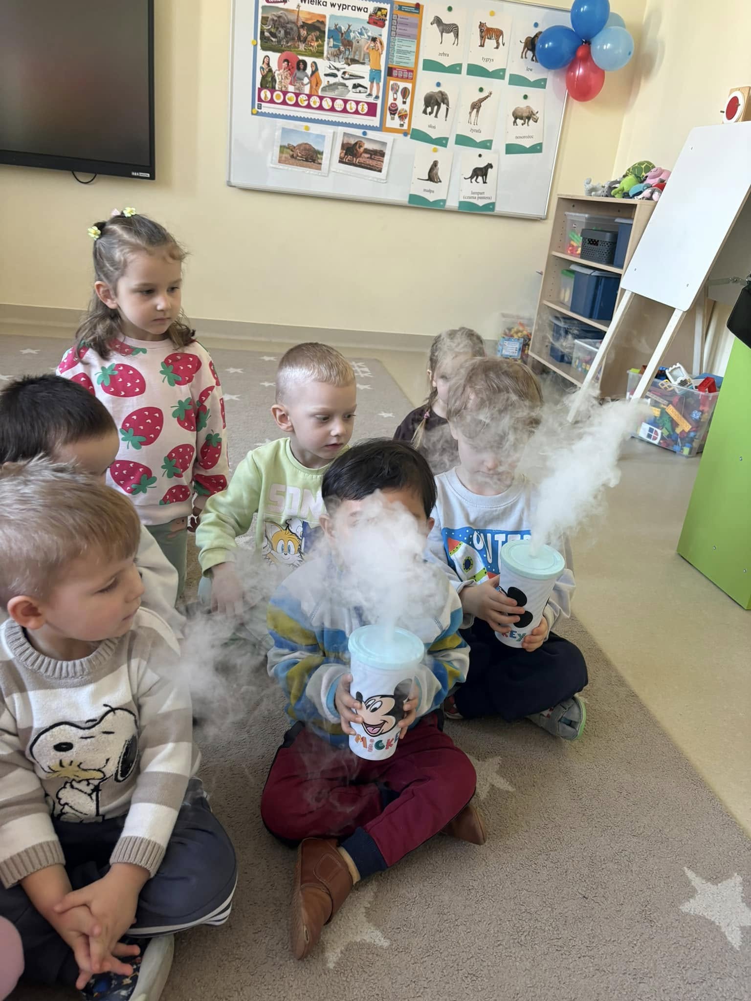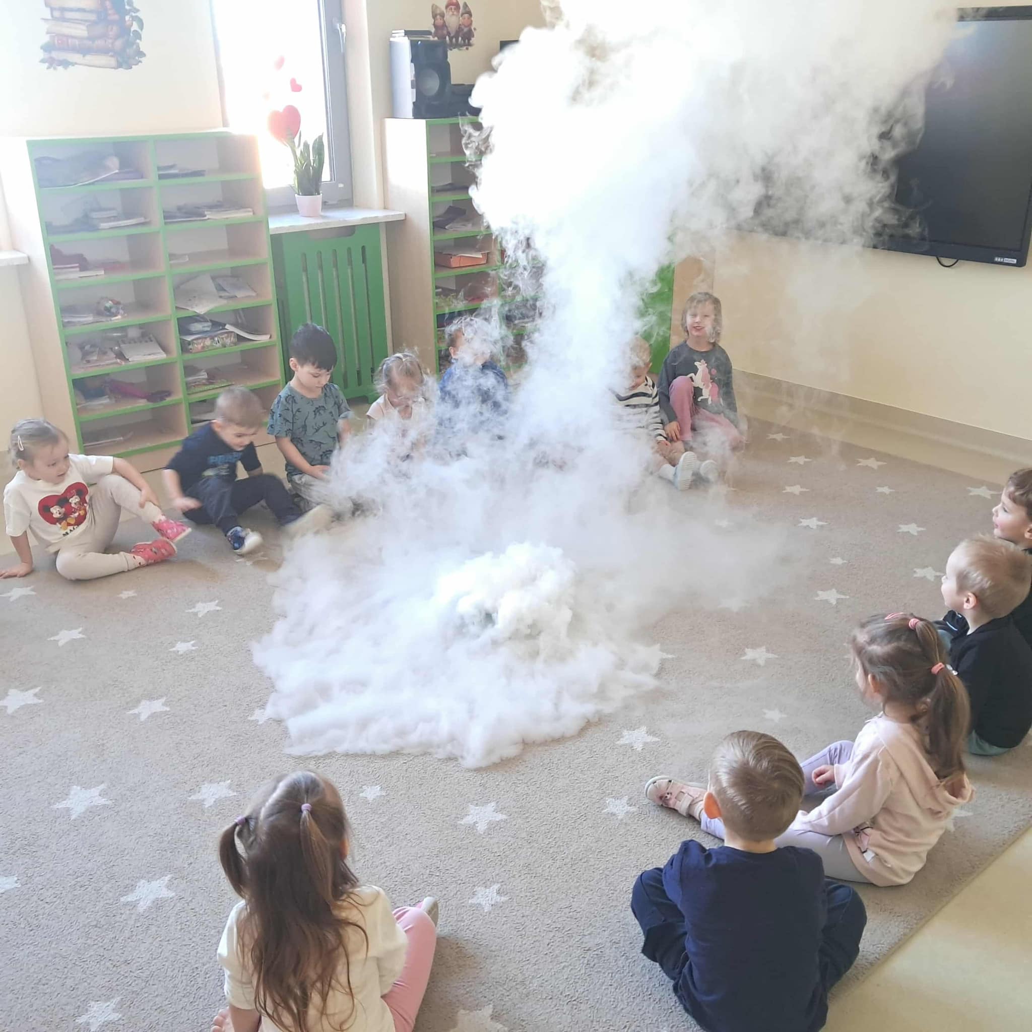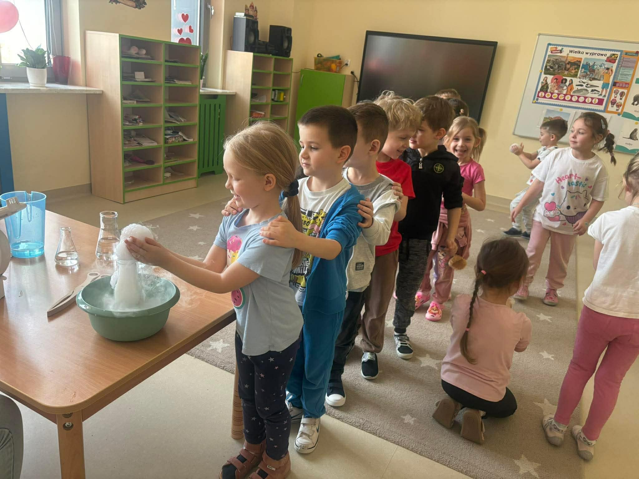 Dzieci miały okazję poznać reakcję suchego lodu z wodą, obserwowały białe obłoki oraz brały niezwykły „prysznic”.