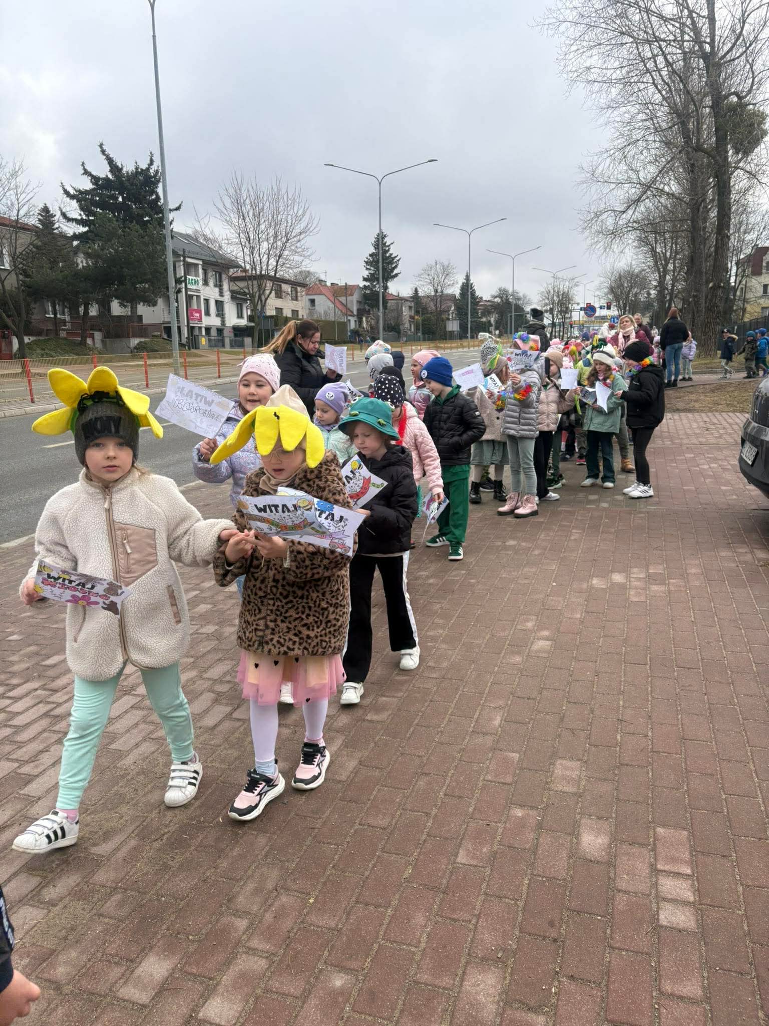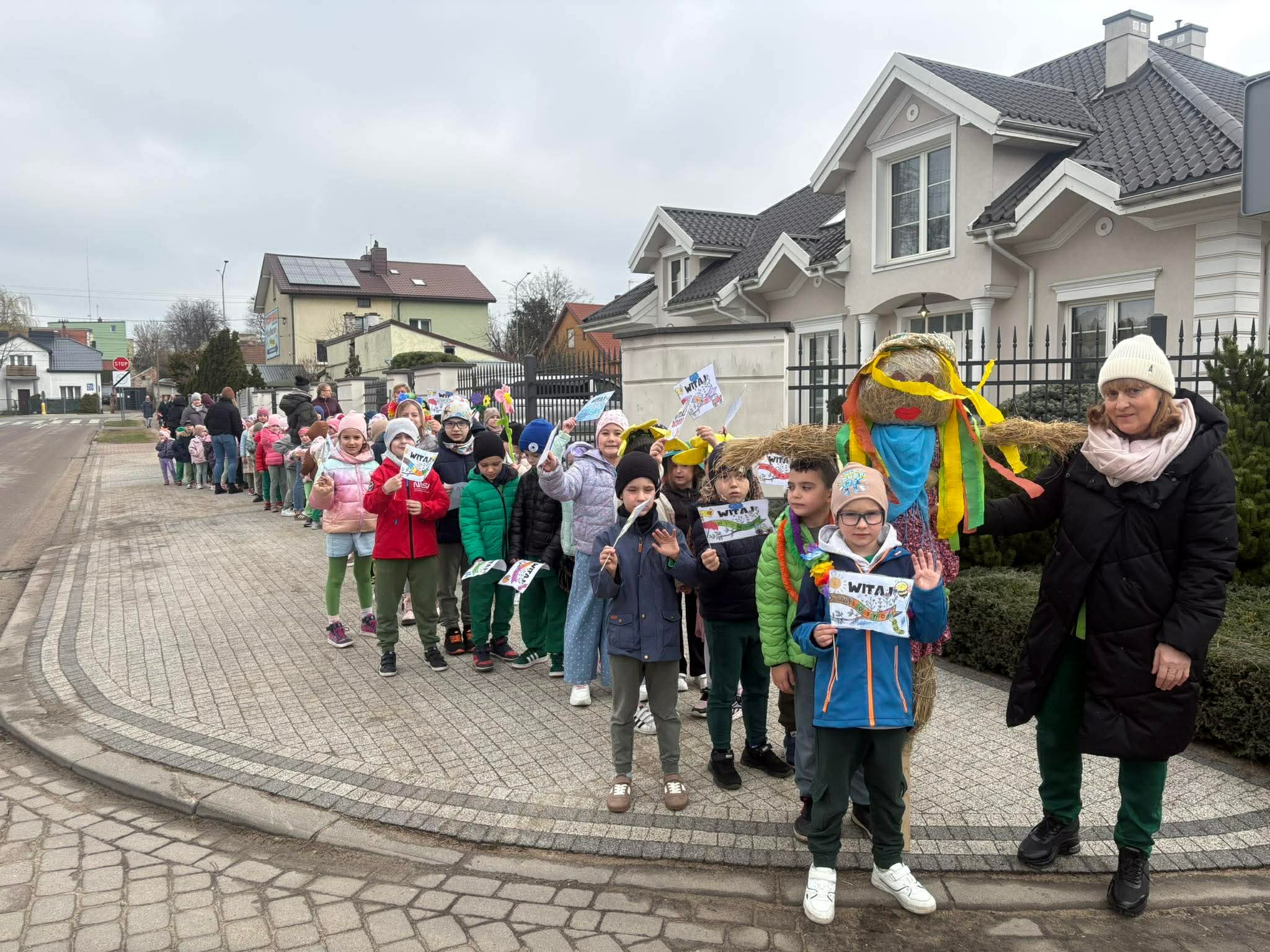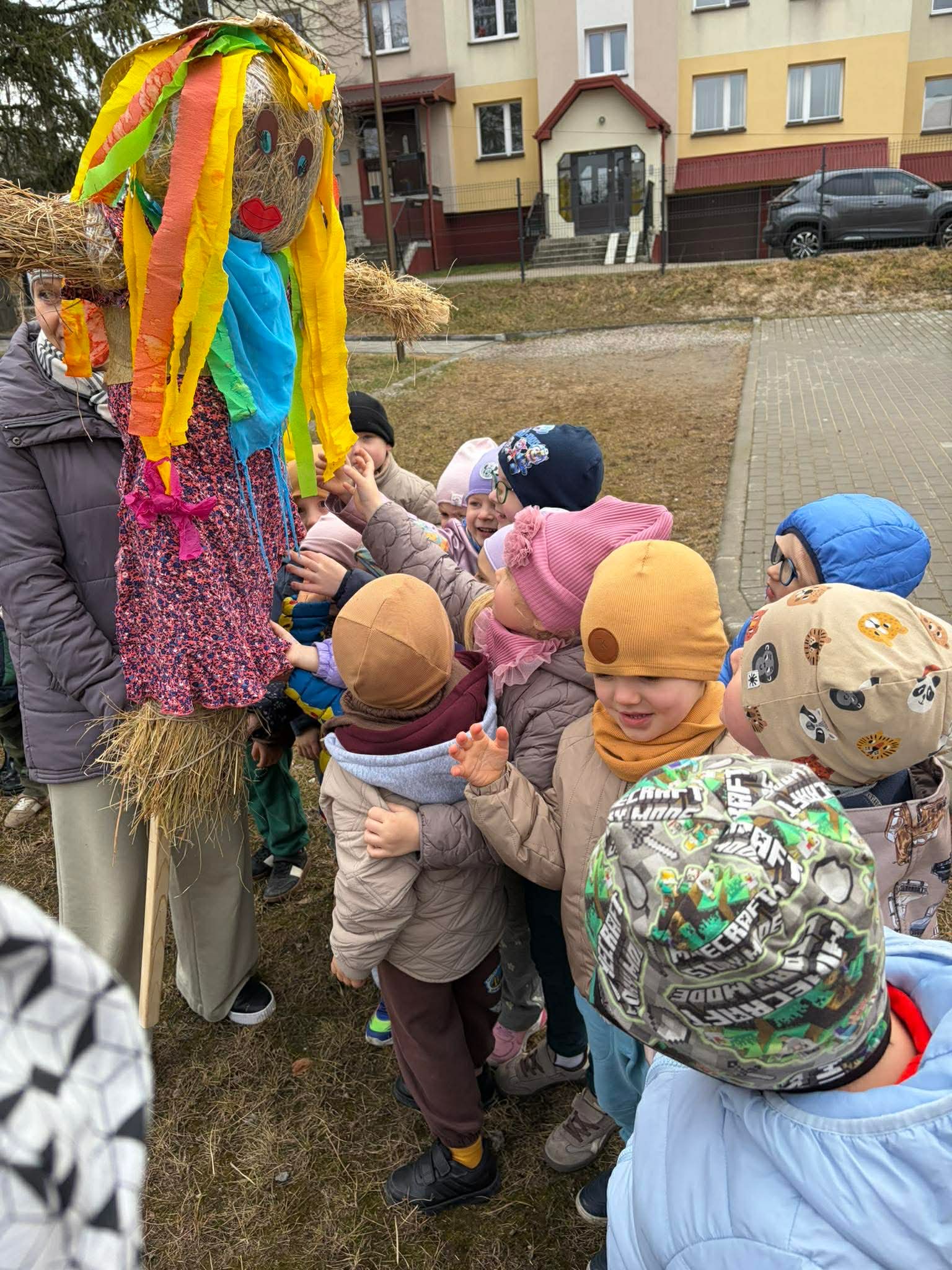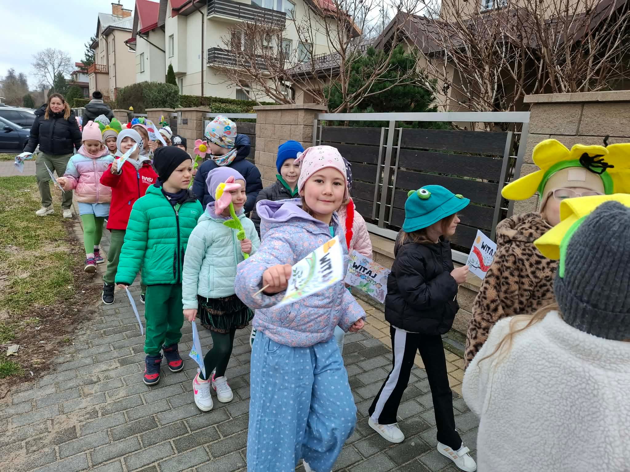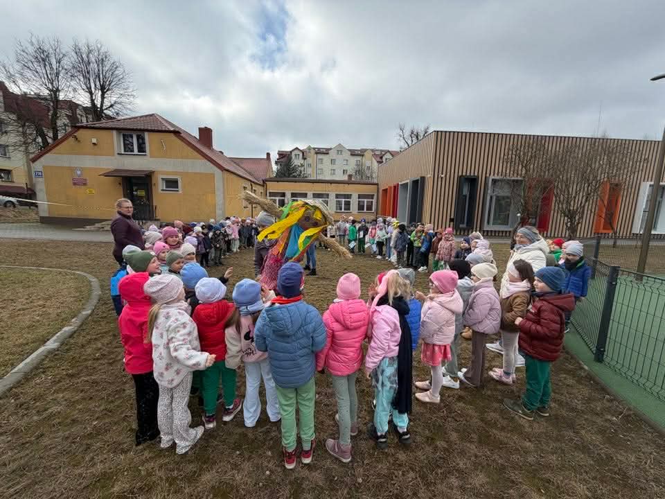 20 marca przedszkolaki ze wszystkich grup radośnie powitały pierwszy dzień wiosny. Wyruszyliśmy na spacer z Marzanną. Dzieci maszerowały ulicami naszego miasta, śpiewając wiosenne piosenki i ciesząc się wspólnym czasem na świeżym powietrzu.