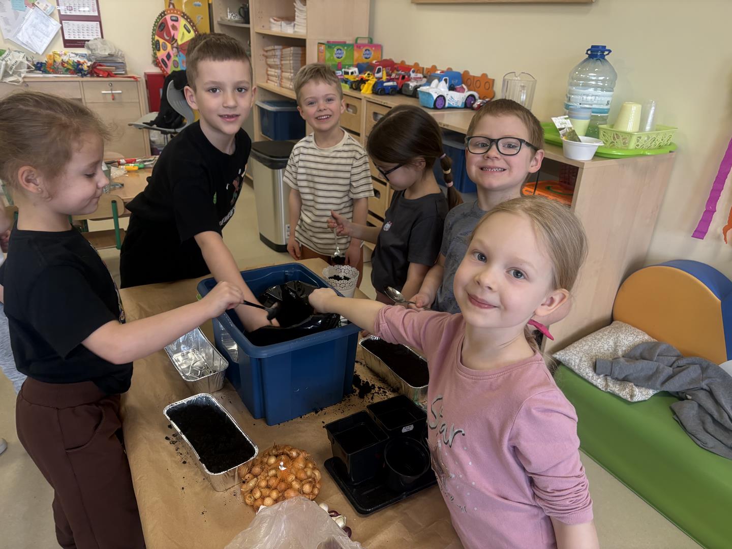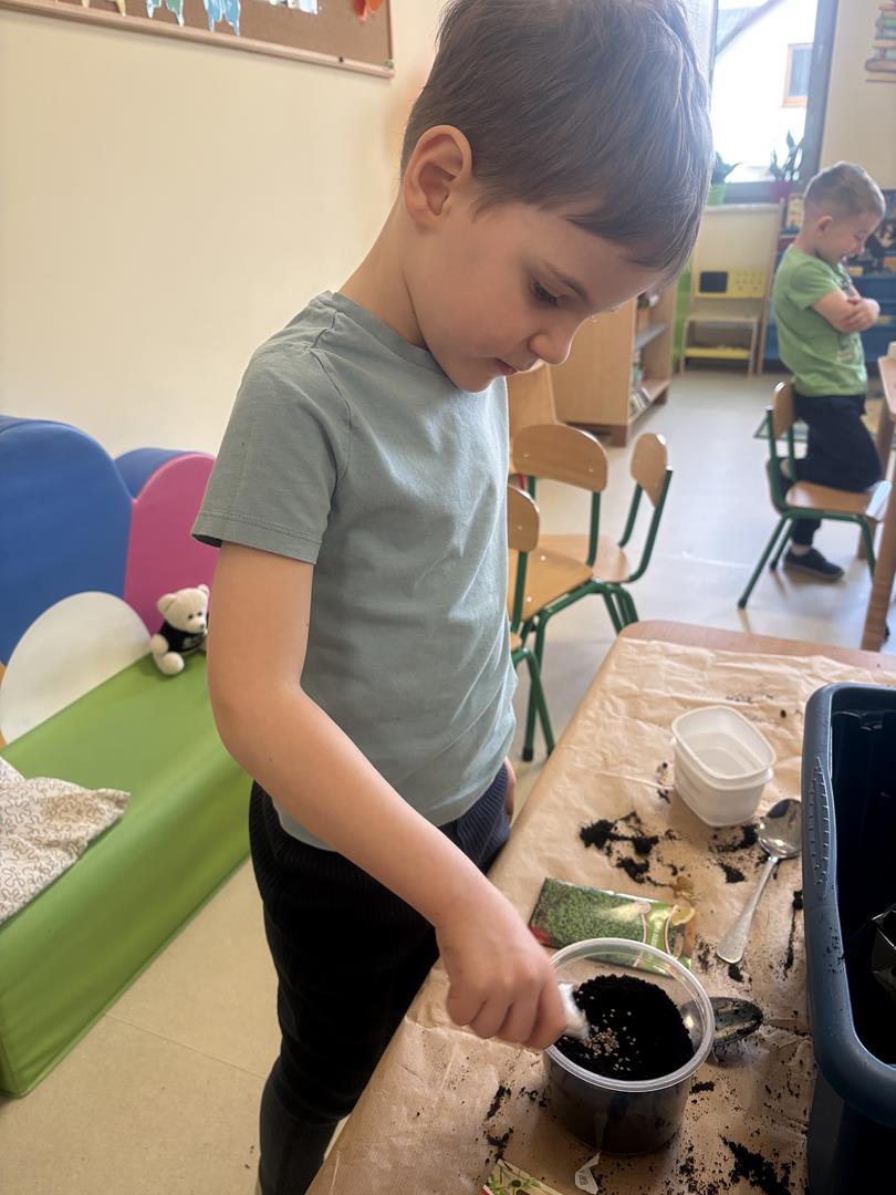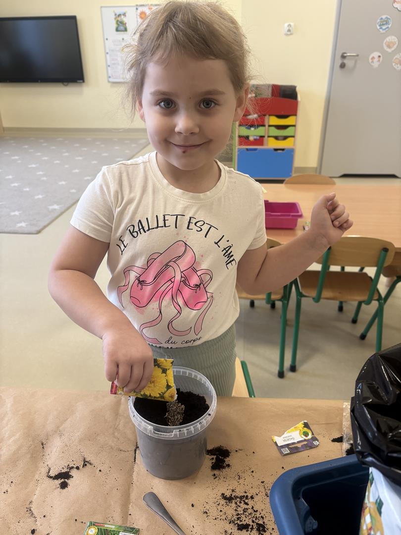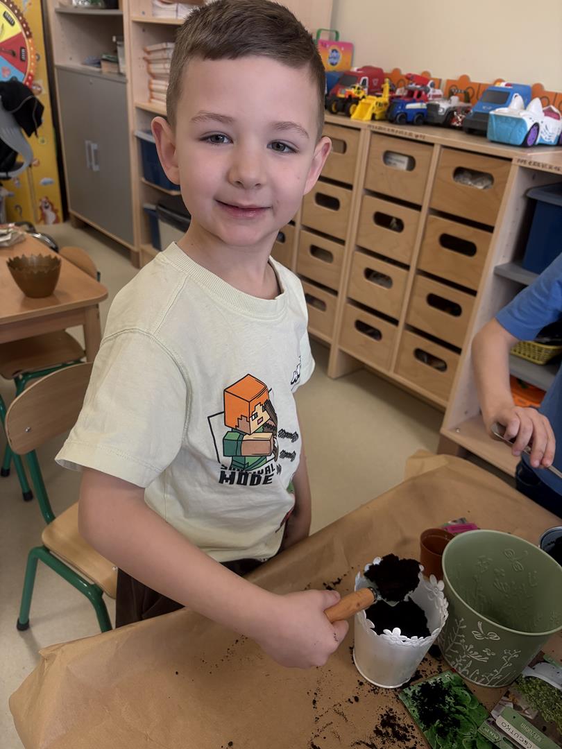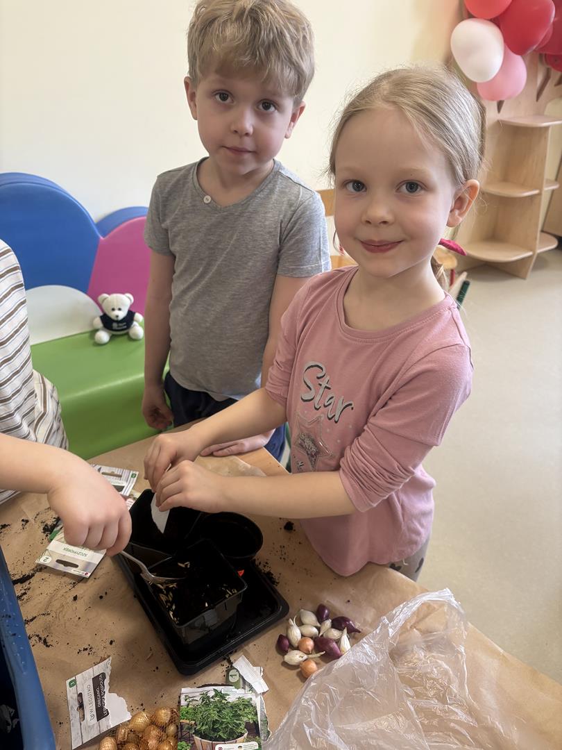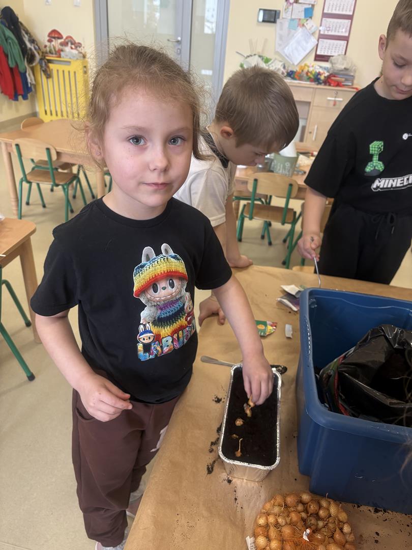 We wtorek 17 marca 5-6 latki z gr. V założyły w swojej sali kącik przyrodniczy. Dzieci samodzielnie posiały nasionka oraz posadziły cebulki warzyw oraz kwiatów do doniczek. Przypomniały również sobie co jest potrzebne do wzrostu roślinom oraz jak ważne jest dbanie o nie, aby można było cieszyć się efektem swojej pracy.