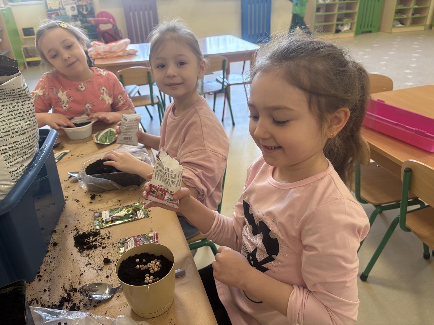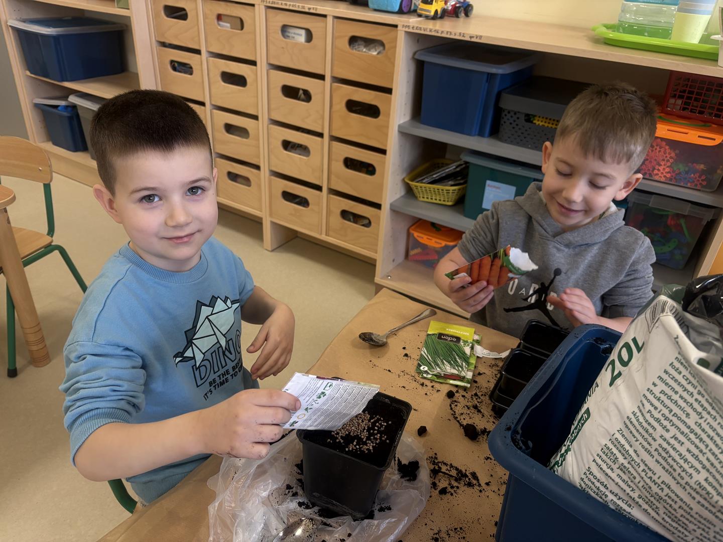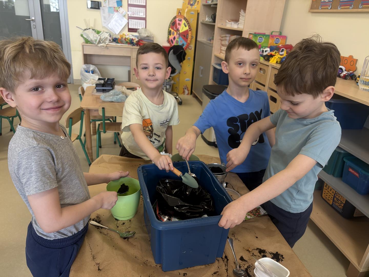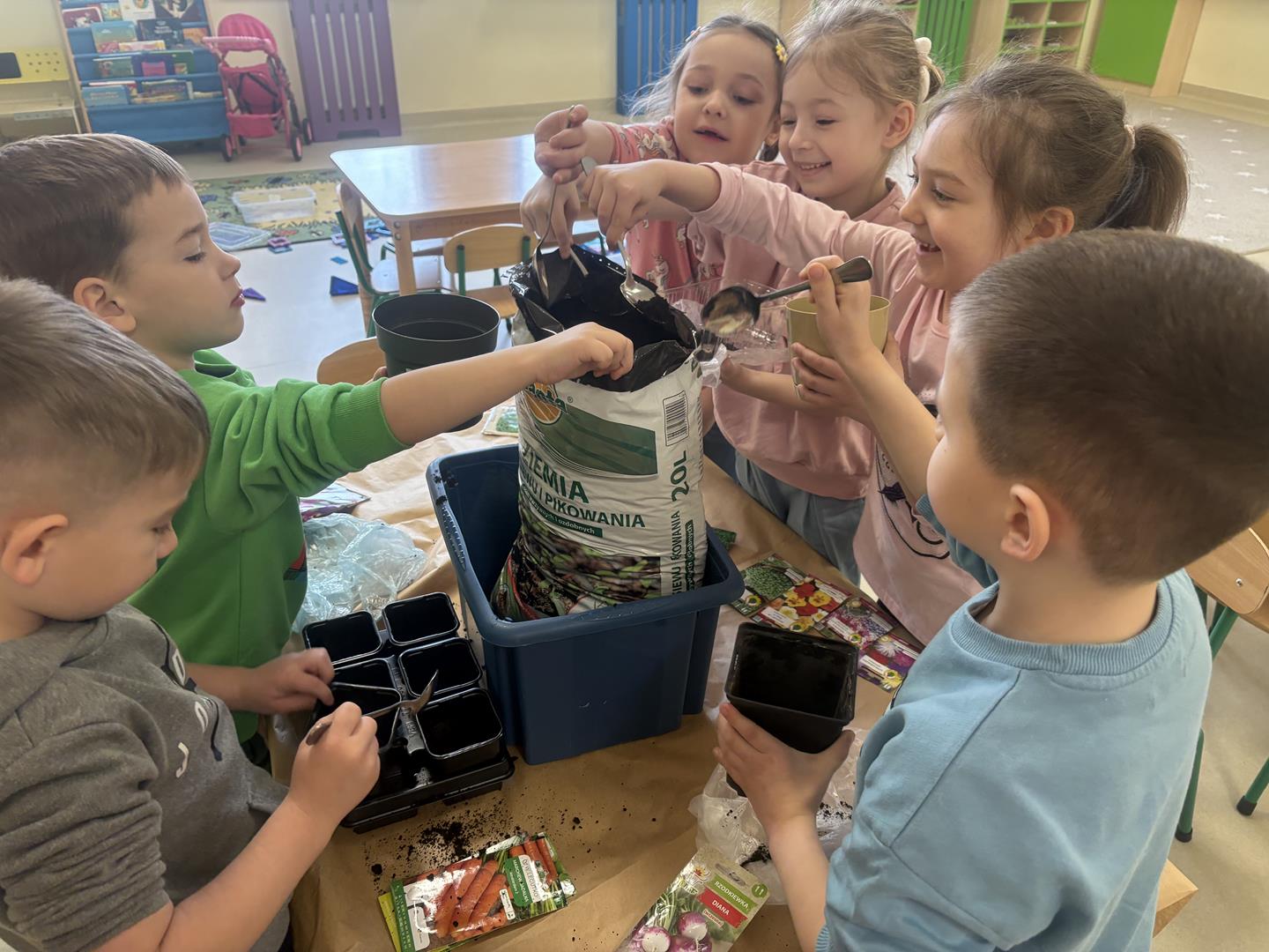 We wtorek 17 marca 5-6 latki z gr. V założyły w swojej sali kącik przyrodniczy. Dzieci samodzielnie posiały nasionka oraz posadziły cebulki warzyw oraz kwiatów do doniczek. Przypomniały również sobie co jest potrzebne do wzrostu roślinom oraz jak ważne jest dbanie o nie, aby można było cieszyć się efektem swojej pracy.