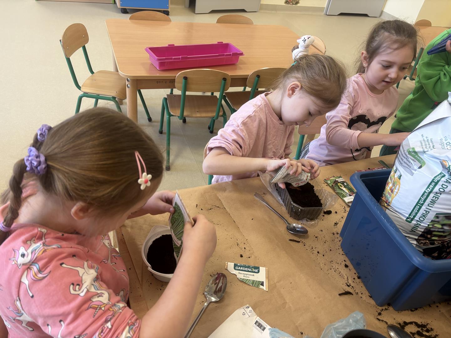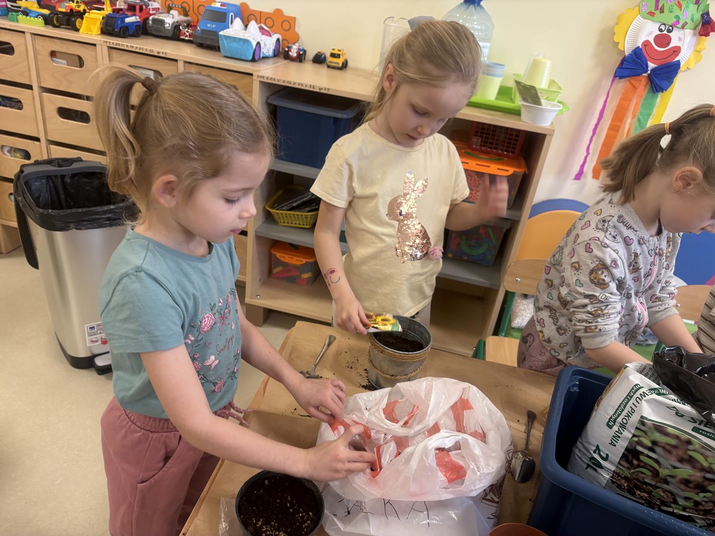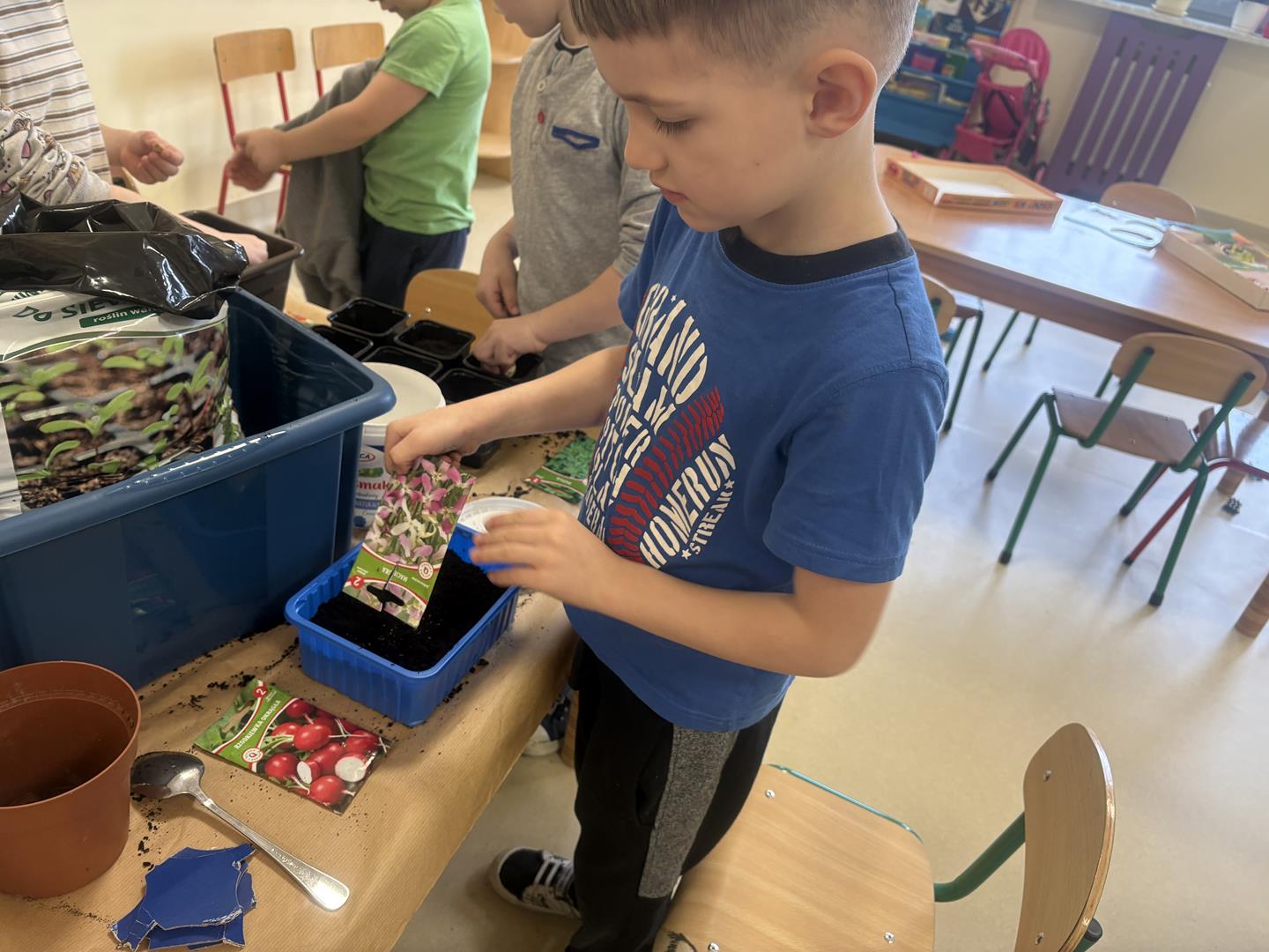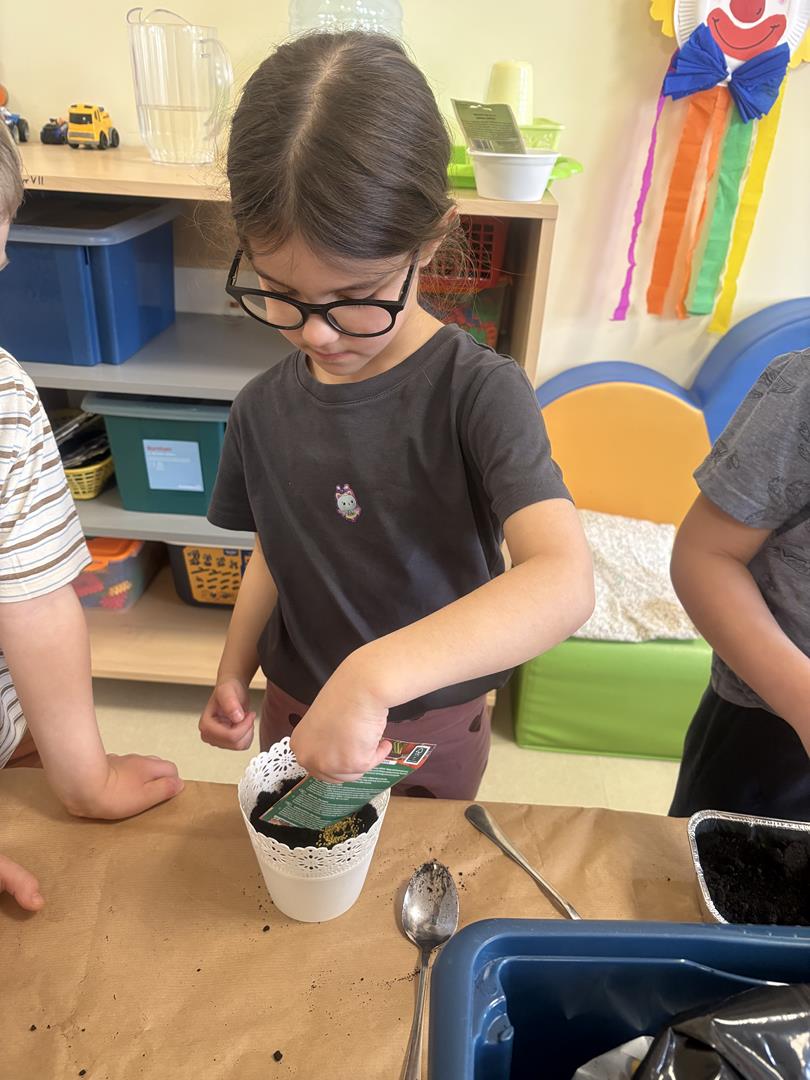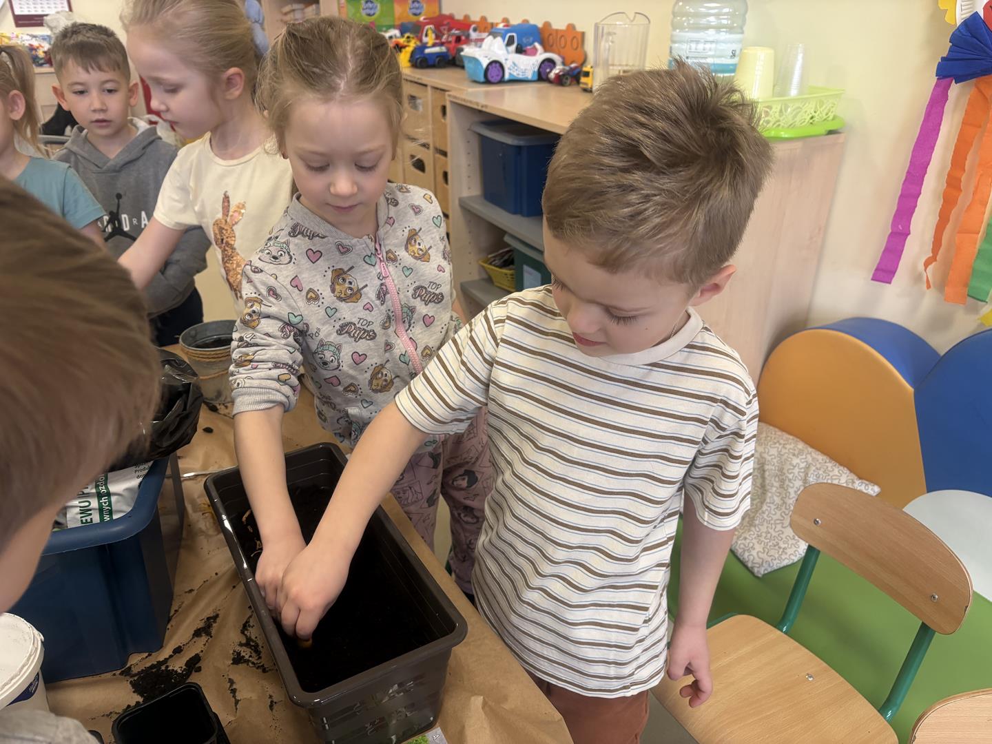 We wtorek 17 marca 5-6 latki z gr. V założyły w swojej sali kącik przyrodniczy. Dzieci samodzielnie posiały nasionka oraz posadziły cebulki warzyw oraz kwiatów do doniczek. Przypomniały również sobie co jest potrzebne do wzrostu roślinom oraz jak ważne jest dbanie o nie, aby można było cieszyć się efektem swojej pracy.
