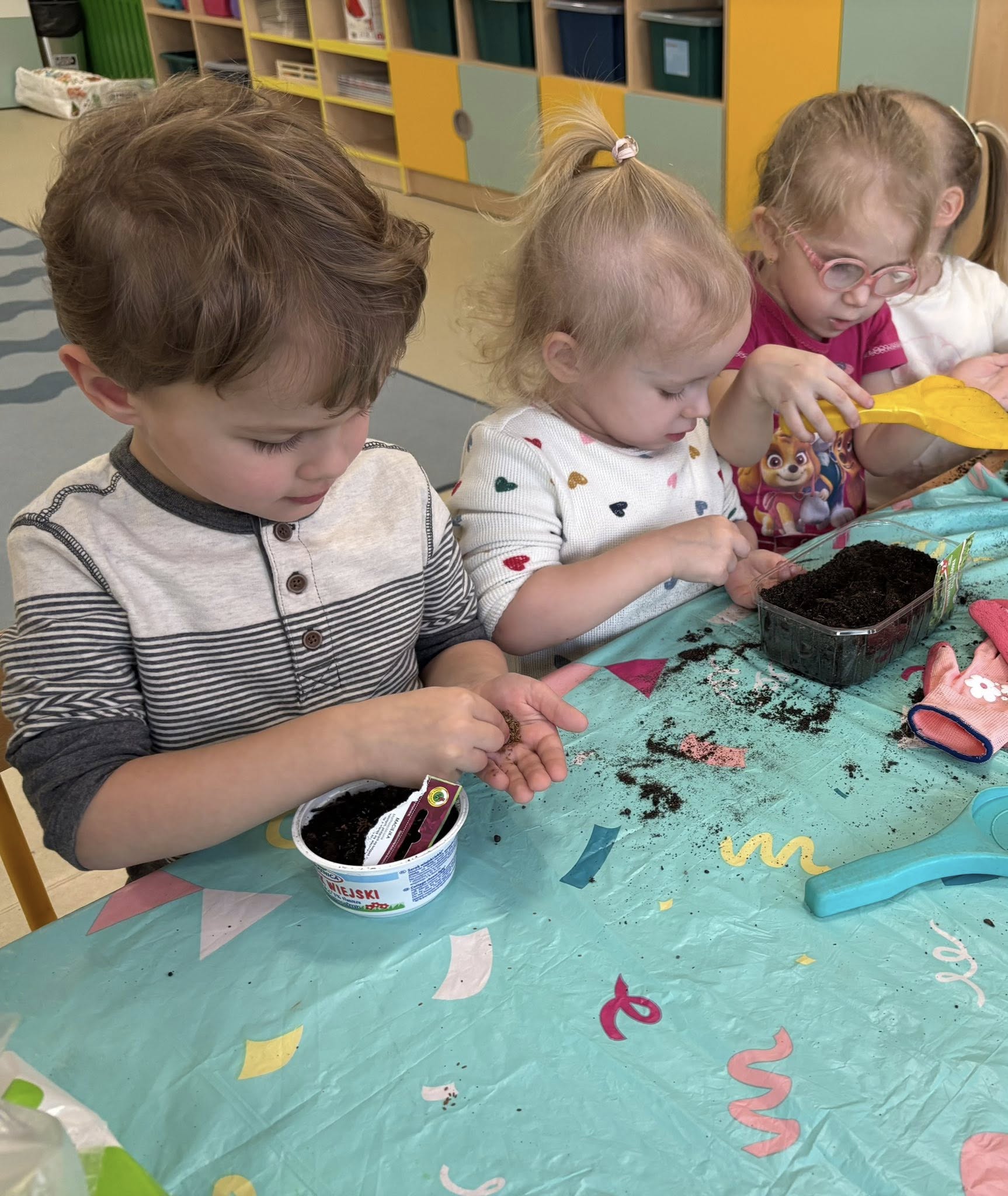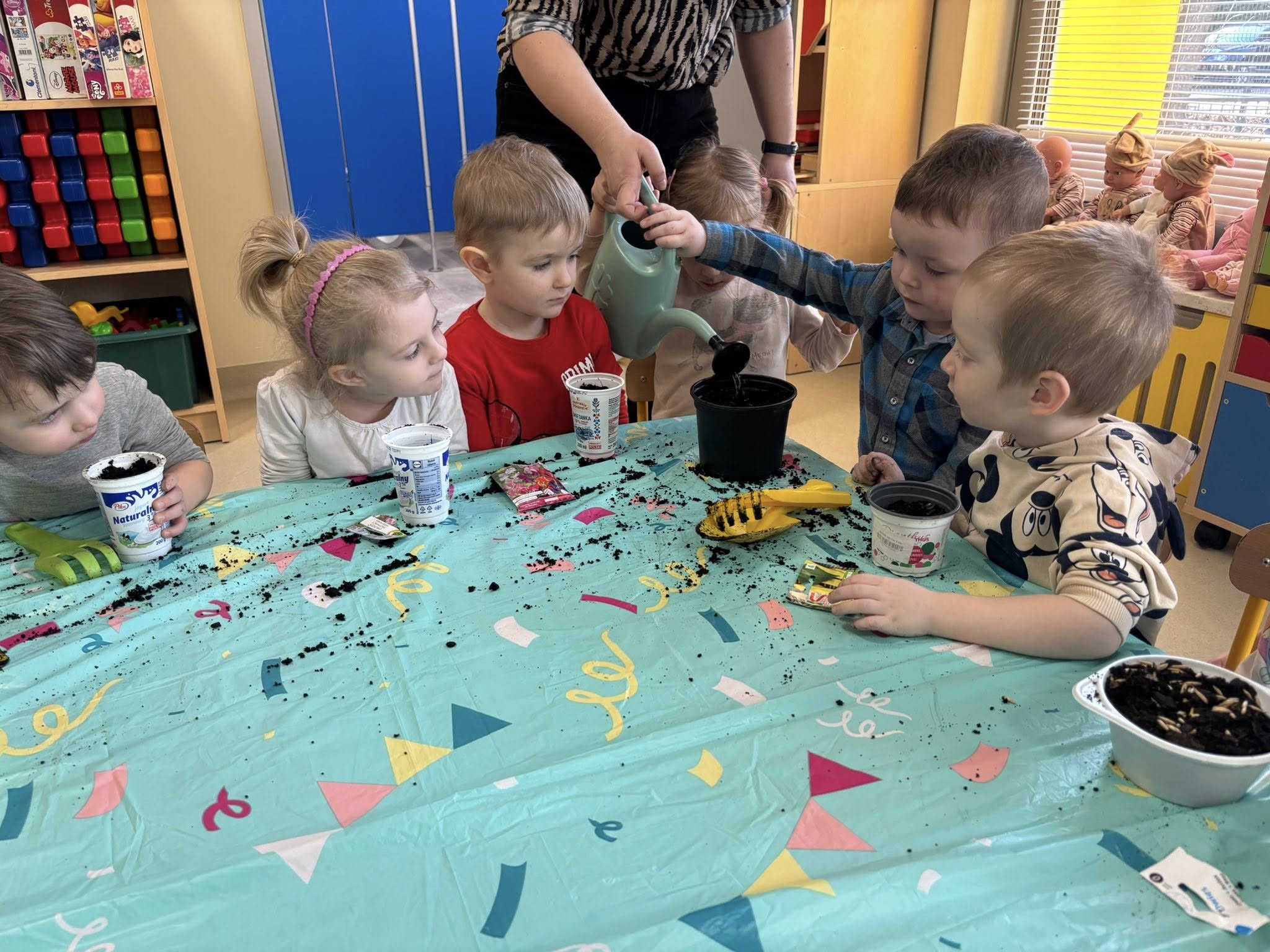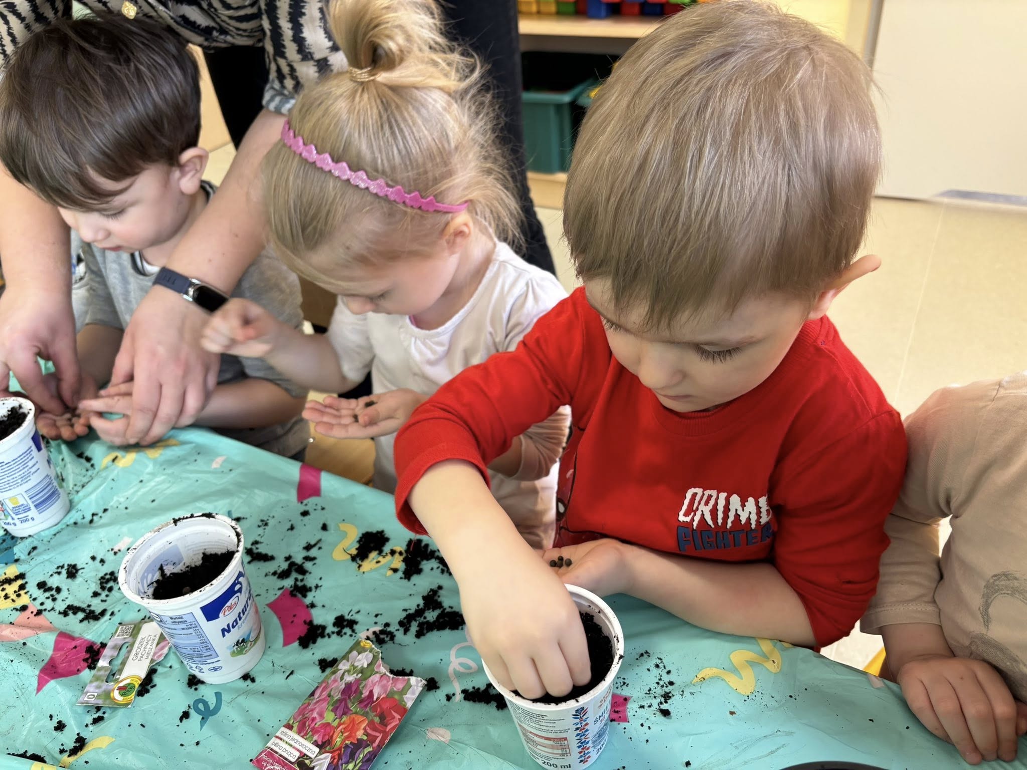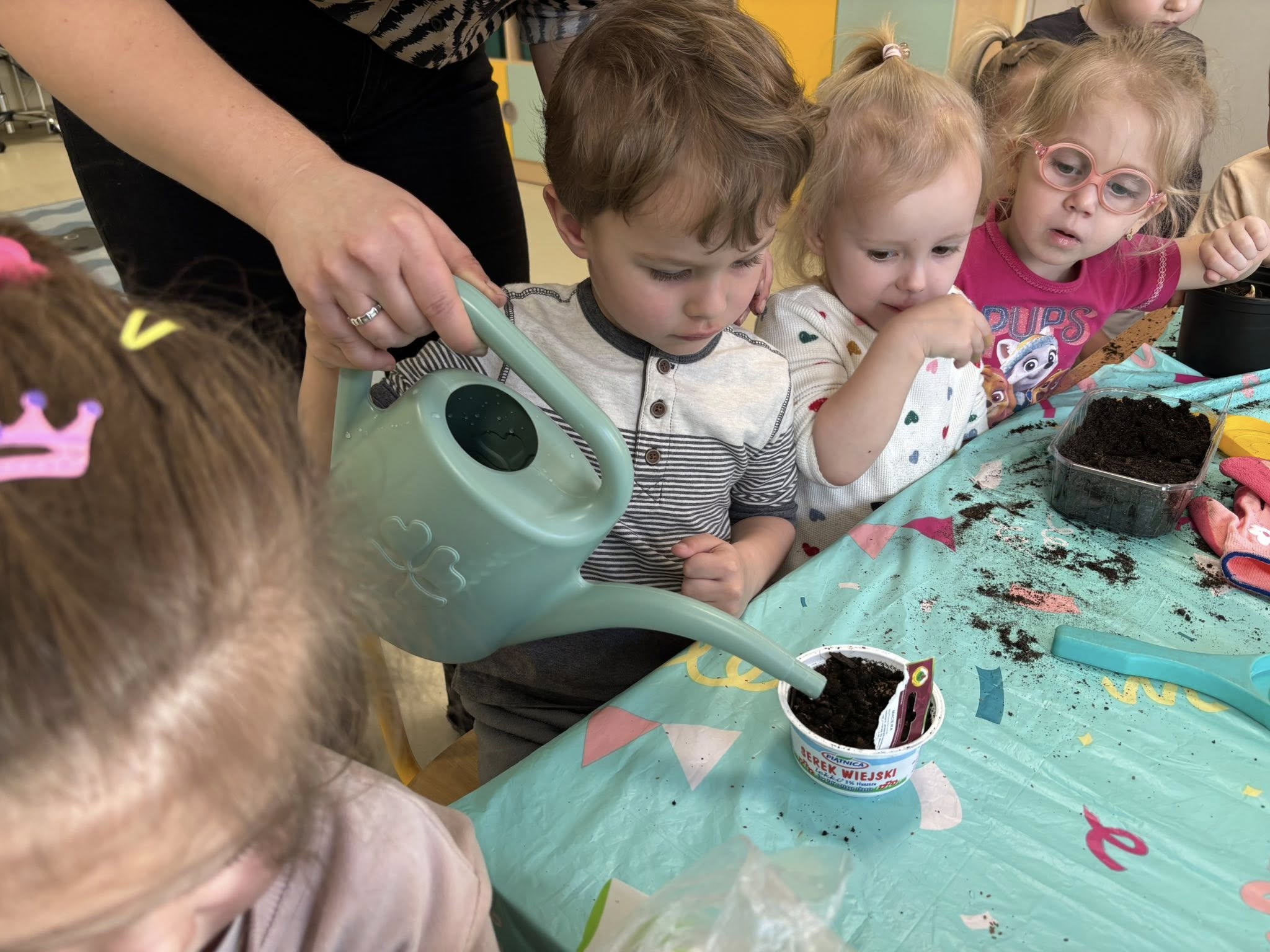 Dzieci samodzielnie wsypywały ziemię do doniczek, siały nasionka i podlewały swoje roślinki. Przy okazji rozmawialiśmy o tym, czego potrzebuje roślina, żeby urosnąć.