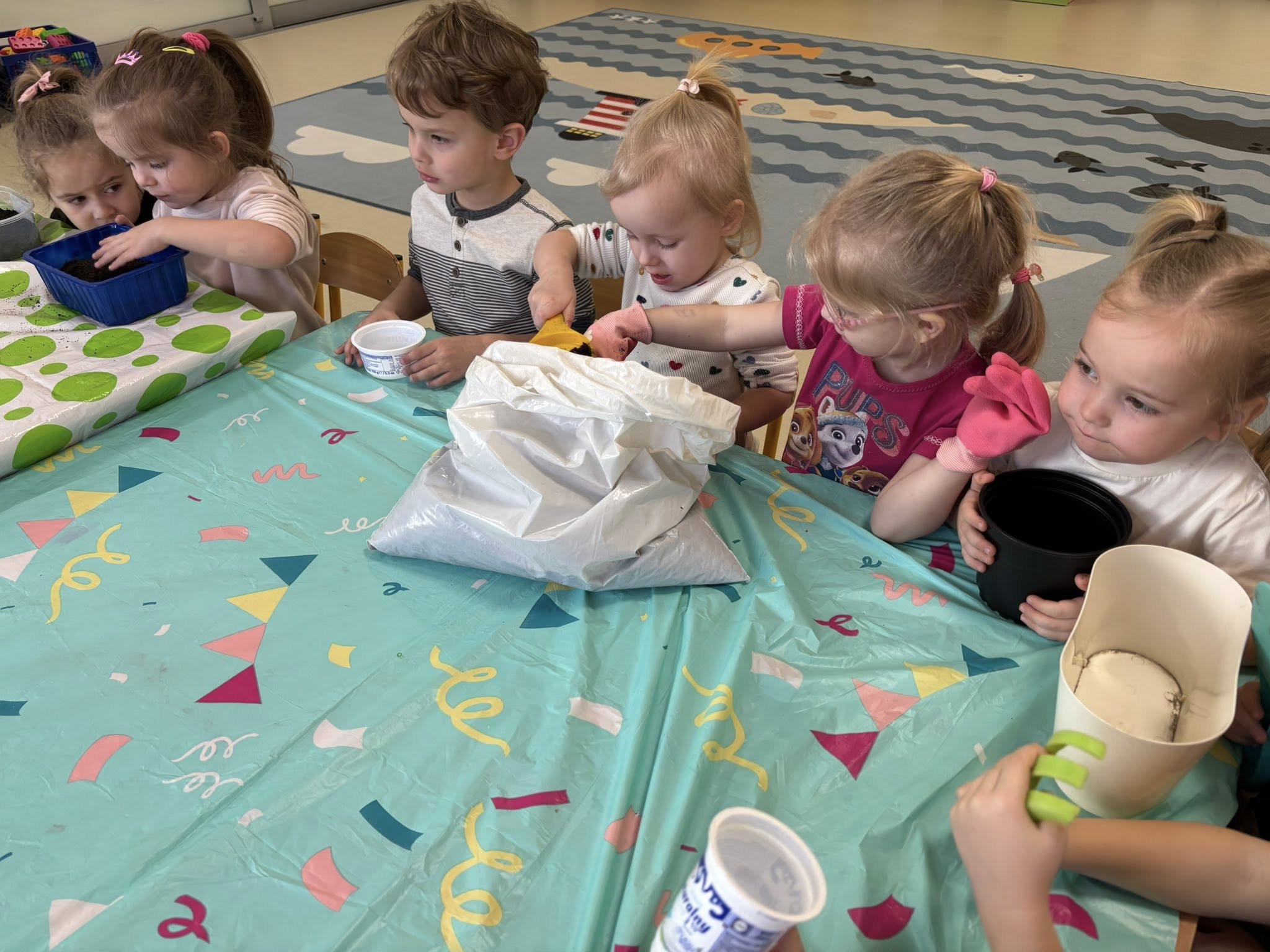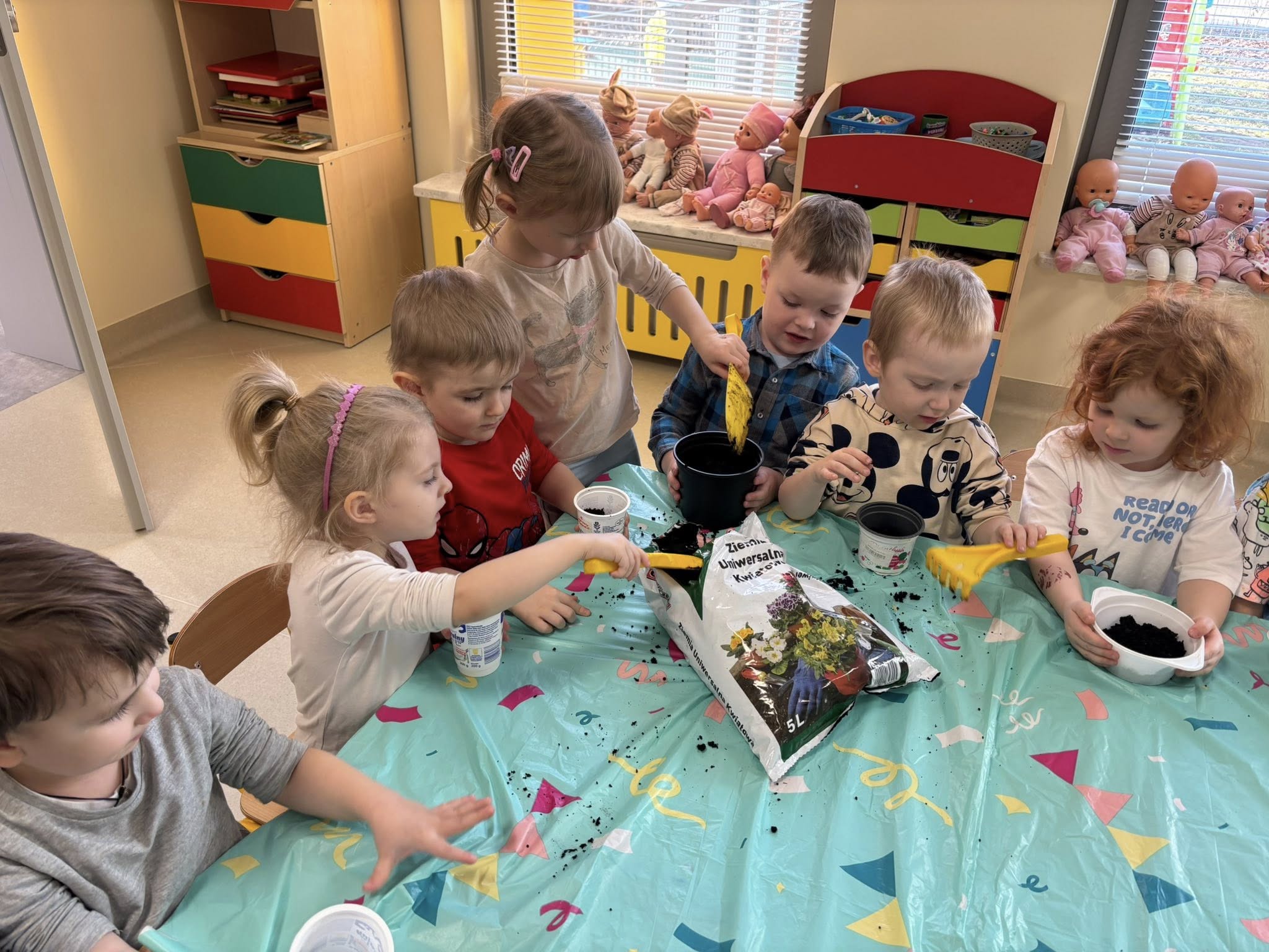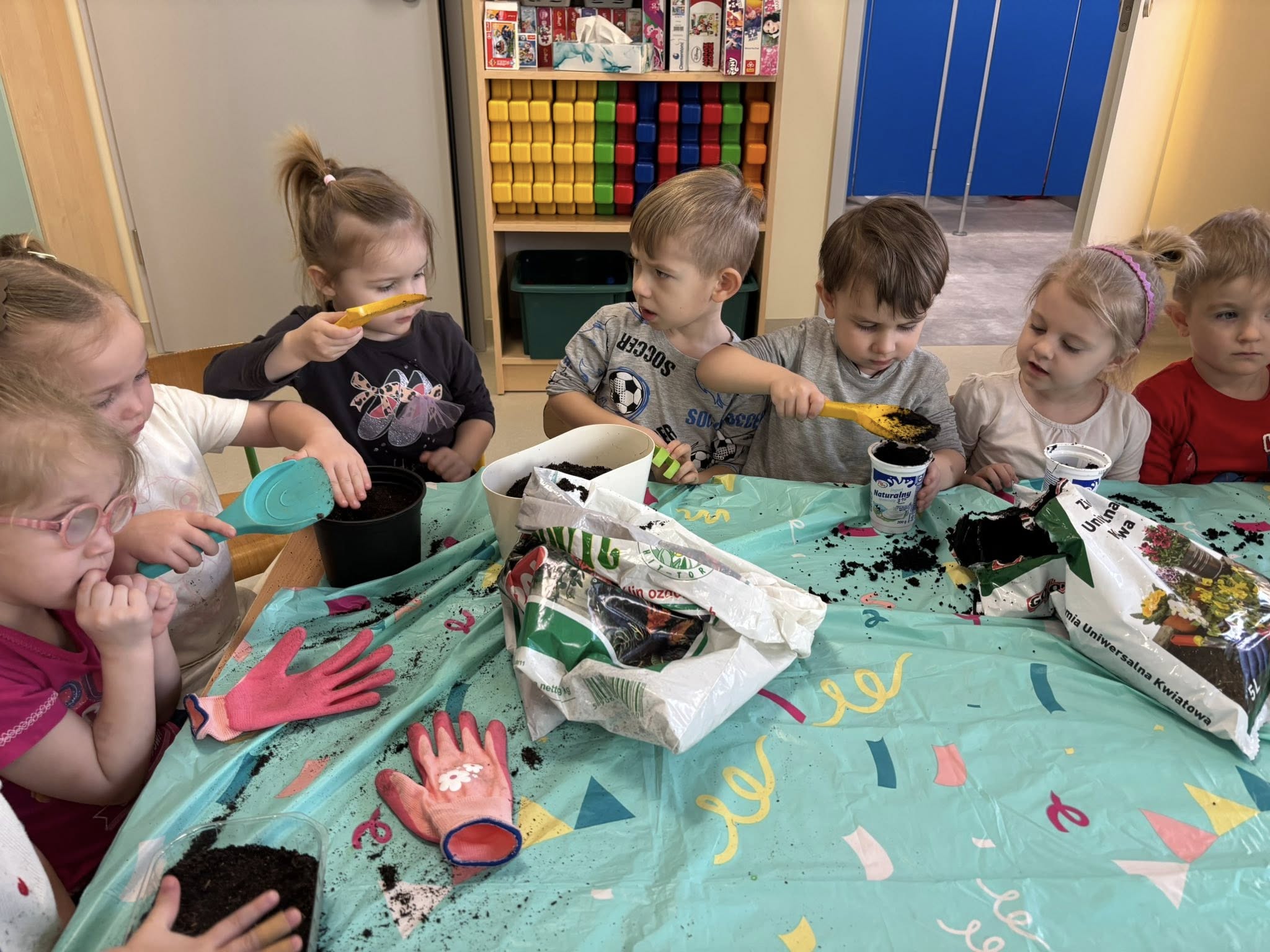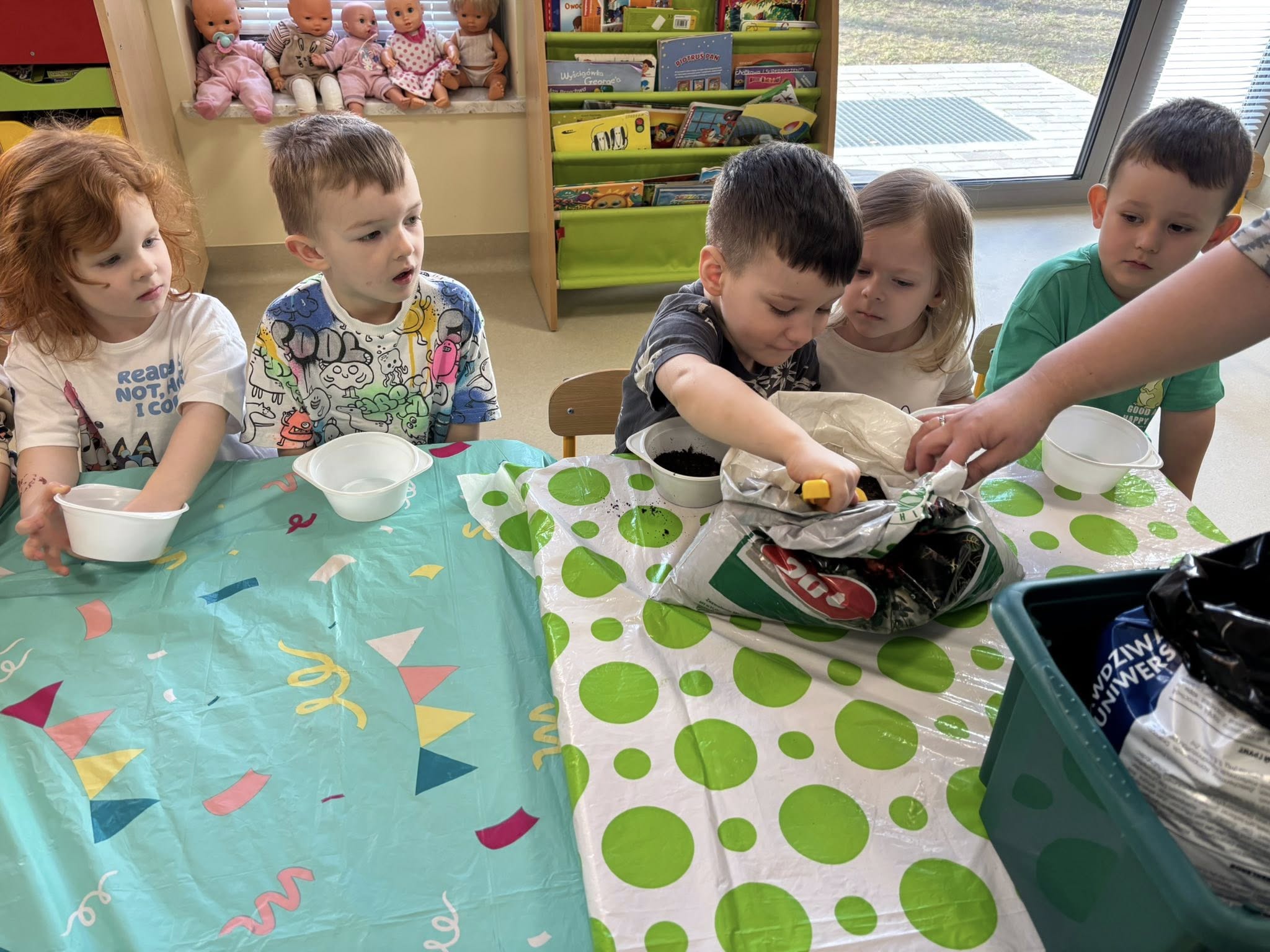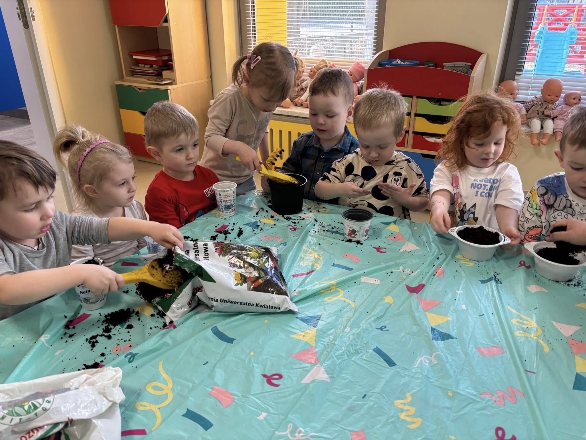 Dzieci samodzielnie wsypywały ziemię do doniczek, siały nasionka i podlewały swoje roślinki. Przy okazji rozmawialiśmy o tym, czego potrzebuje roślina, żeby urosnąć.